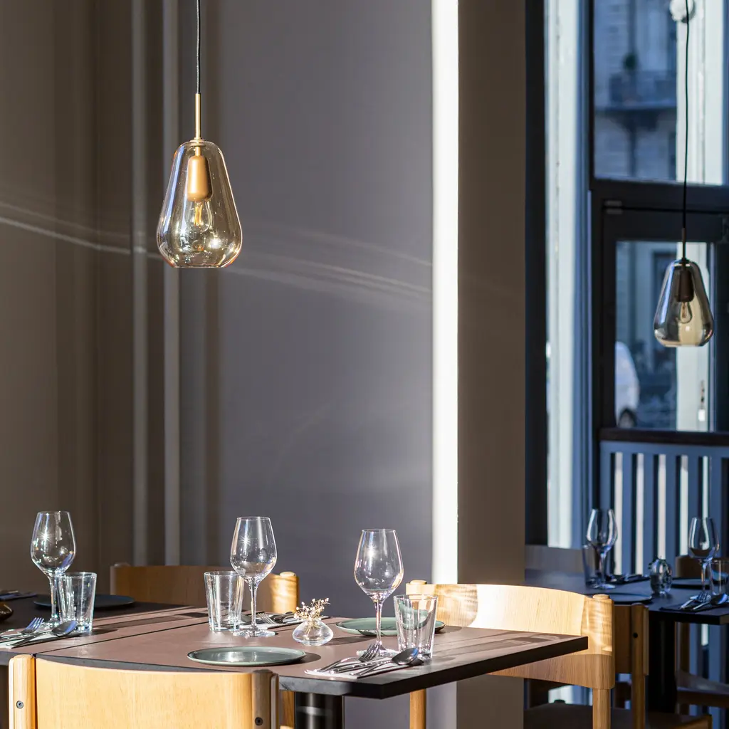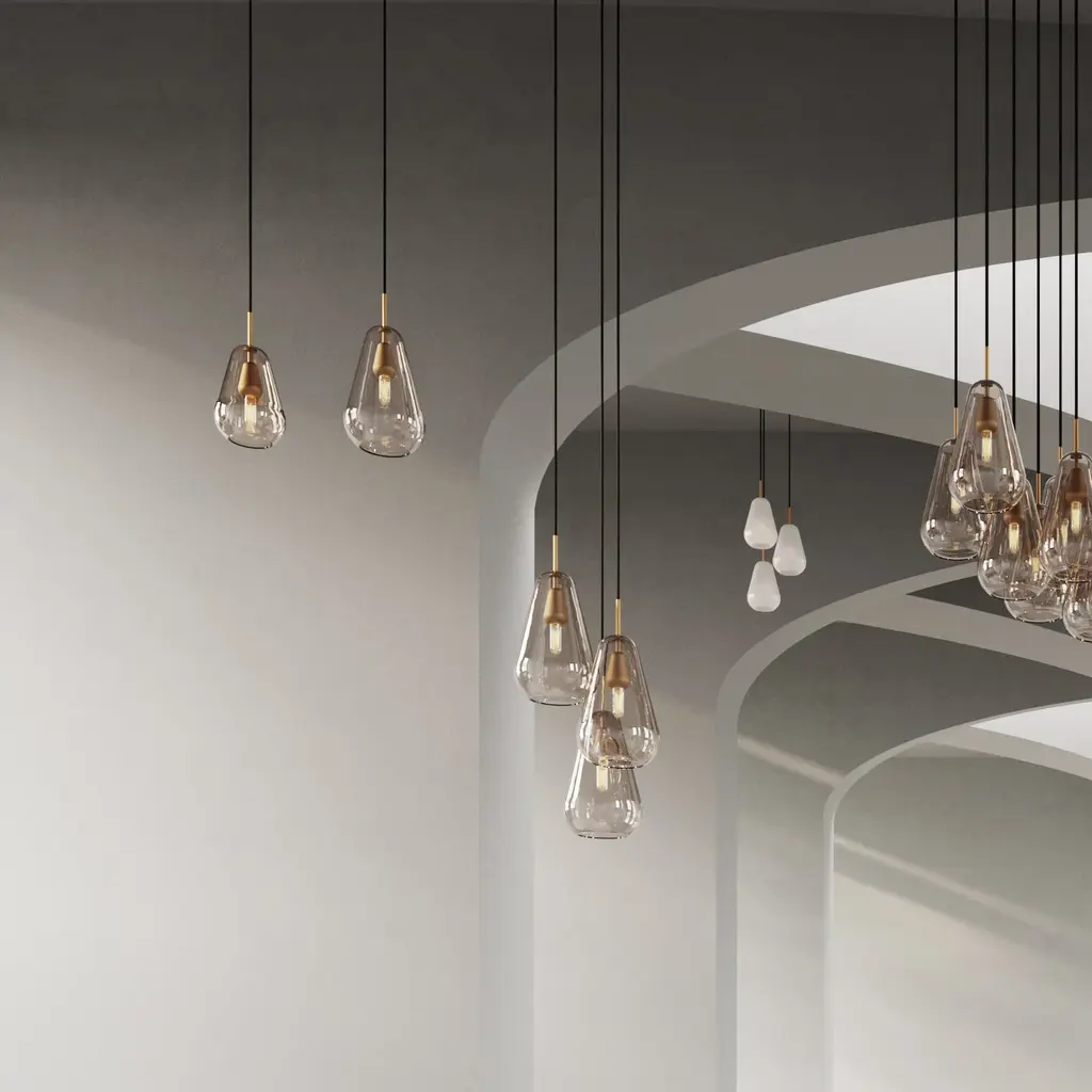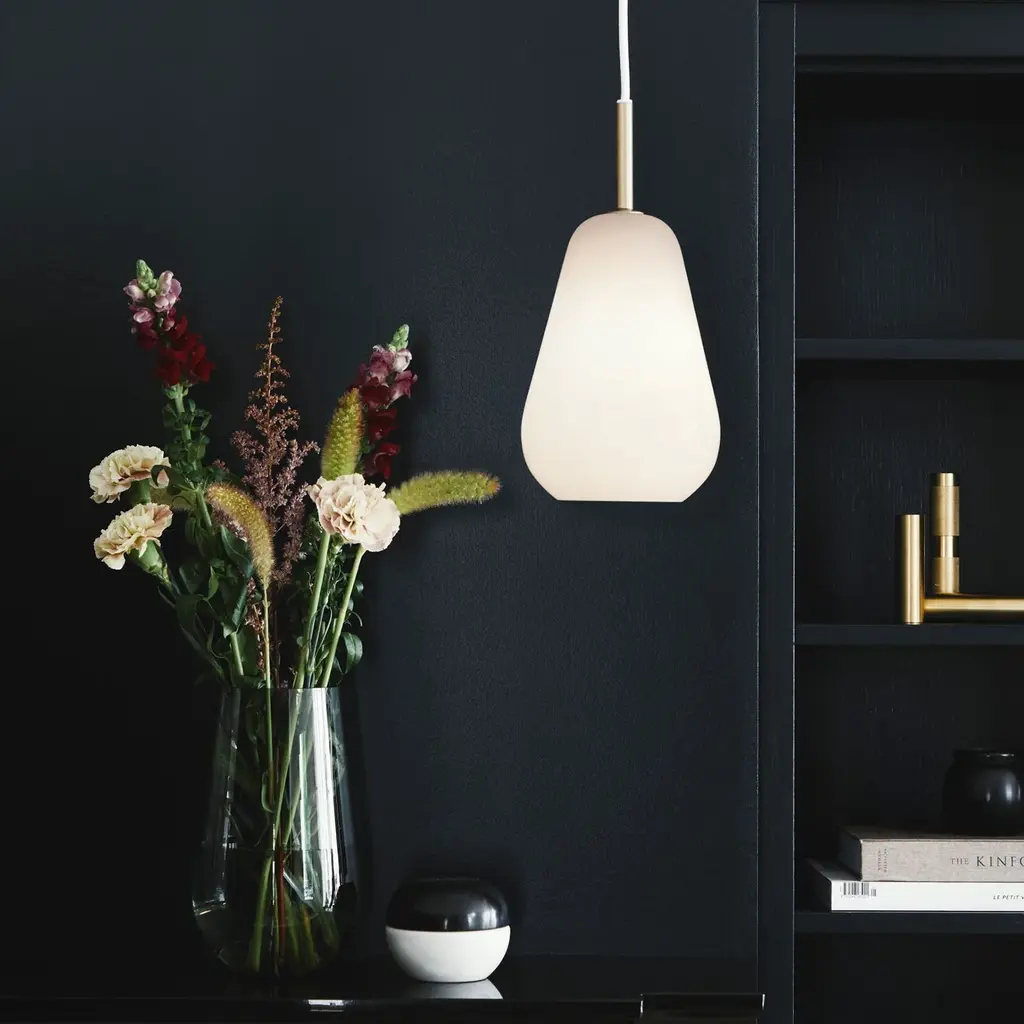 This pendant's droplet-shaped glass shade was inspired by rain drops reflecting the singular tones of Nordic light. Composed of mouth-blown glass handpainted in a delicate golden color and complementary light gold metal, Anoli was conceived by Danish designer Sofie Refer of Copenhagen design brand Nuura who says, "I strive to balance simplicity and grandeur, and create light that has a pure yet sensuous expression." Available in both small and medium sizes, the translucent pendant works perfectly as a single fixture or as multiple pendants in either ordered lines or informal groupings over a table or desk.