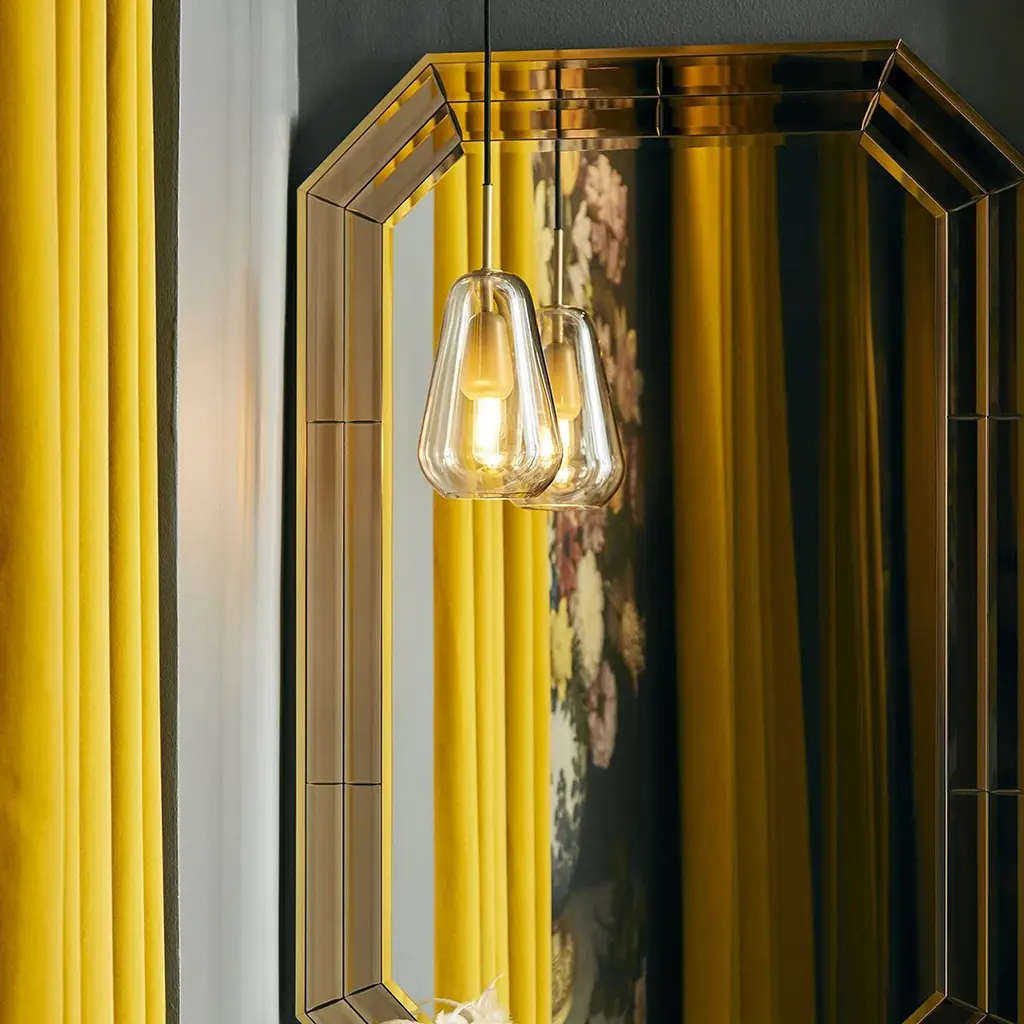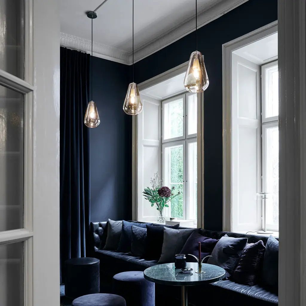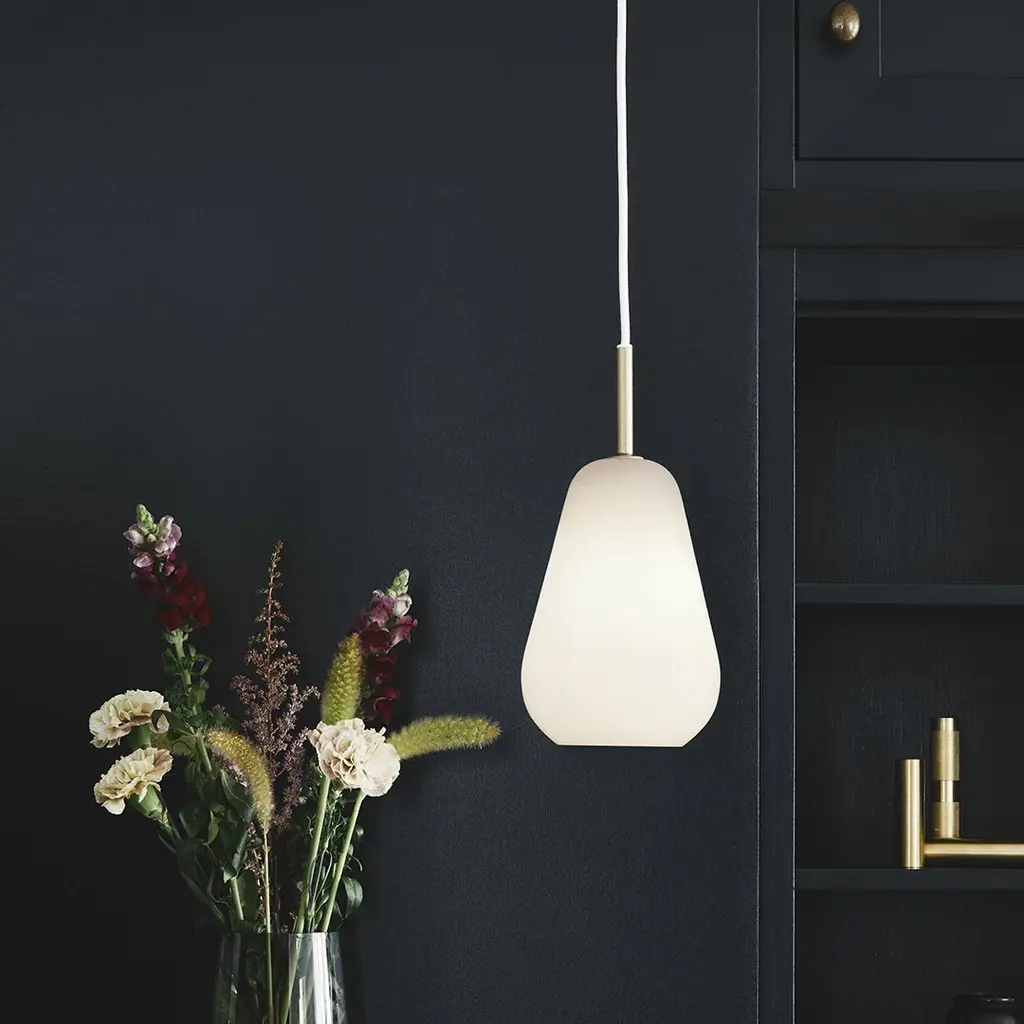 Anoli 1 is a single pendant in a Nordic design, inspired by a single raindrop on an autumn day. Anoli 1 has an organic look and the droplet shade is made of neatly mouth-blown glass handpainted with a special lustre to give the golden colour. The pendant has details of metal and is finished with a black fabric covered cable.