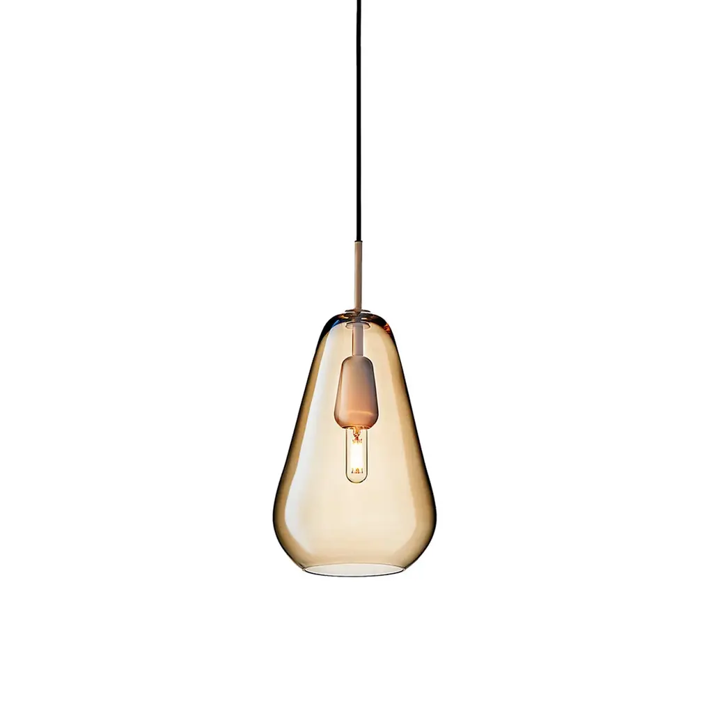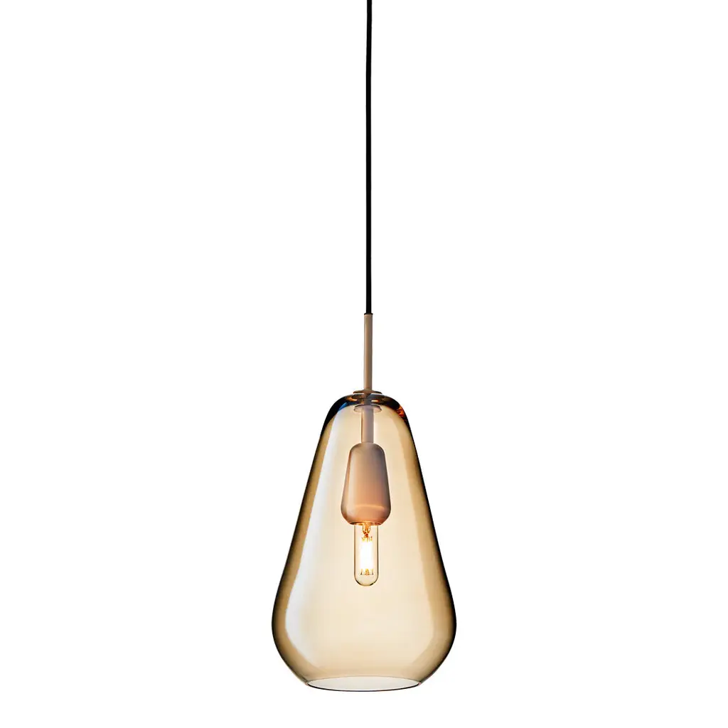 Anoli 1 is a single pendant in a Nordic design, inspired by a single raindrop on an autumn day. Anoli 1 has an organic look and the droplet shade is made of neatly mouth-blown glass handpainted with a special lustre to give the golden colour. The pendant has details of metal and is finished with a black fabric covered cable.
