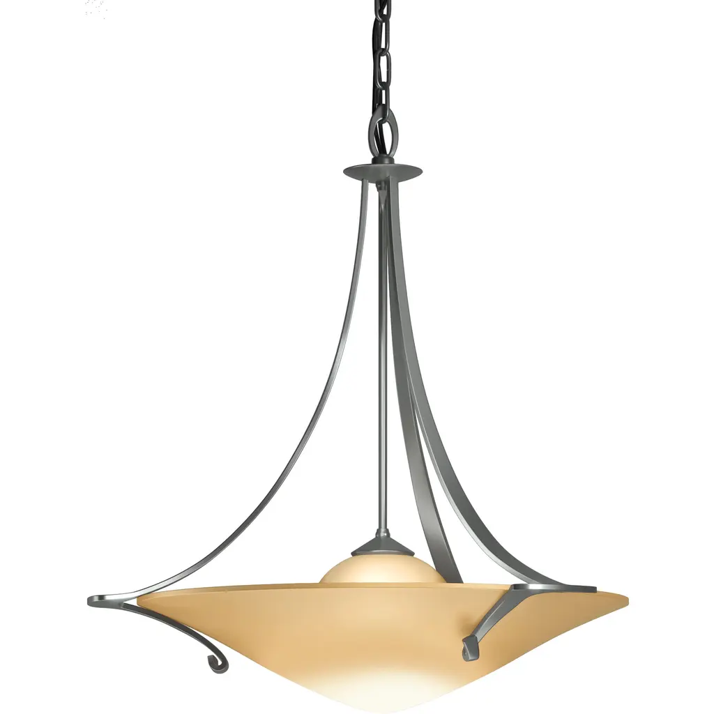 The Antasia Pendant, featuring sinuous curves of iron cradling a glass bowl and the bowl itself, that looks like a dome of water ready to stretch into a drop, was inspired by the art Nouveau movement. Created by artisans at our forge here in Vermont.