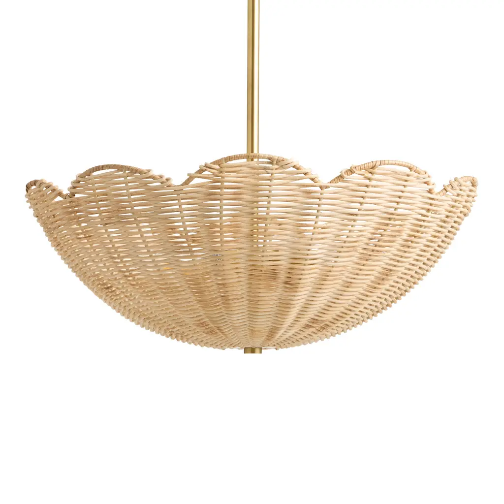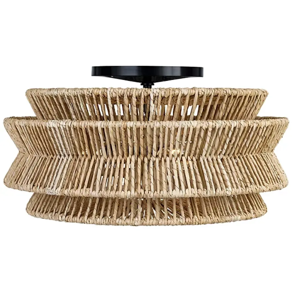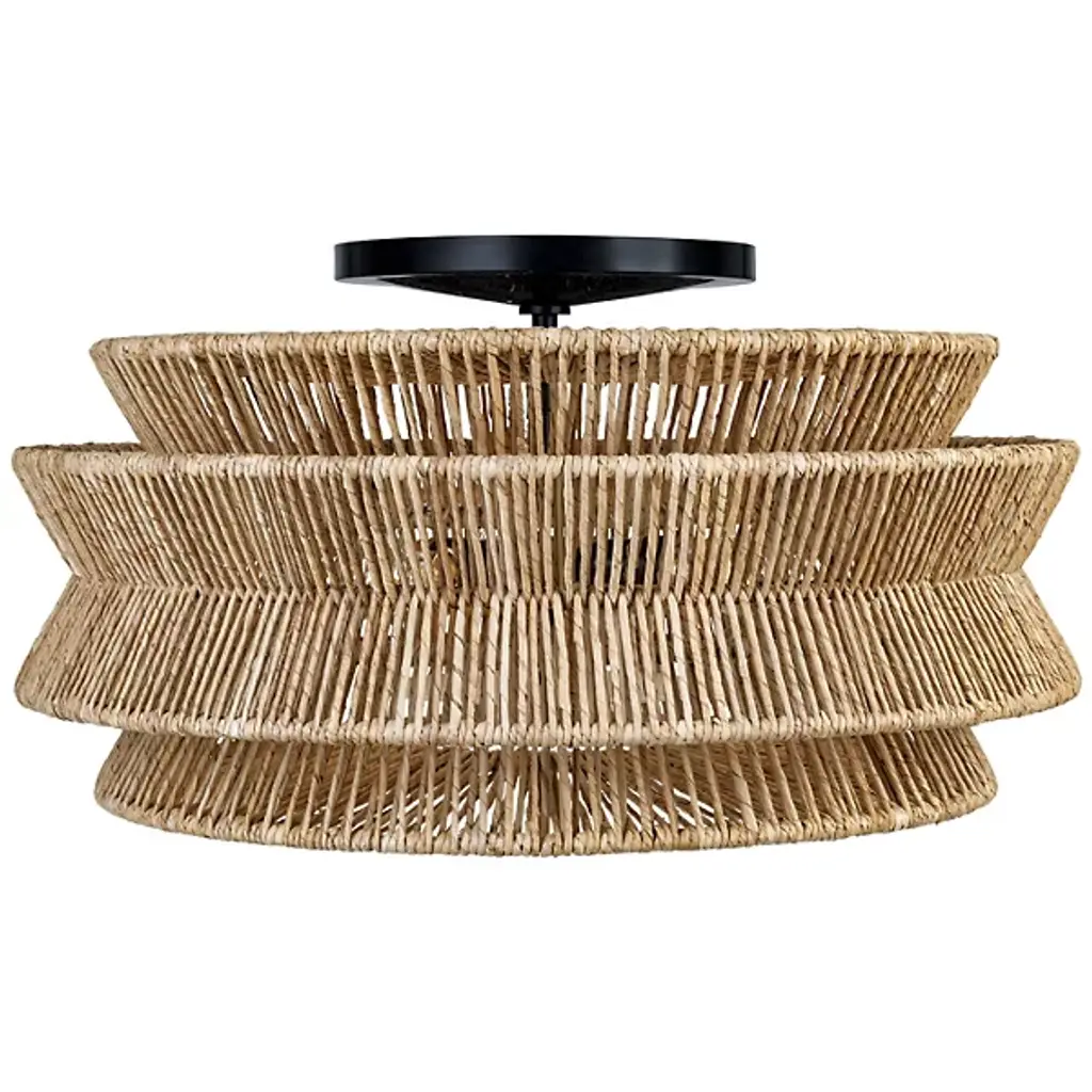 Resembling the crafted arts from antiquity, the Antigua Semi-Flushmount from Visual Comfort Signature draws attention with a dramatic silhouette and a distinct organic construction. It references modern designs with a series of round tapering shapes. Sporting a metal frame, these radial shapes give off a tactile quality as artisans wrap them with natural abaca. The warm range of tones of the abaca accentuates the golden hue of the spacious, atmospheric light filtering out.