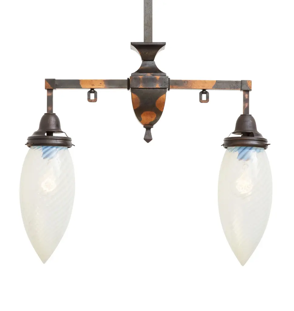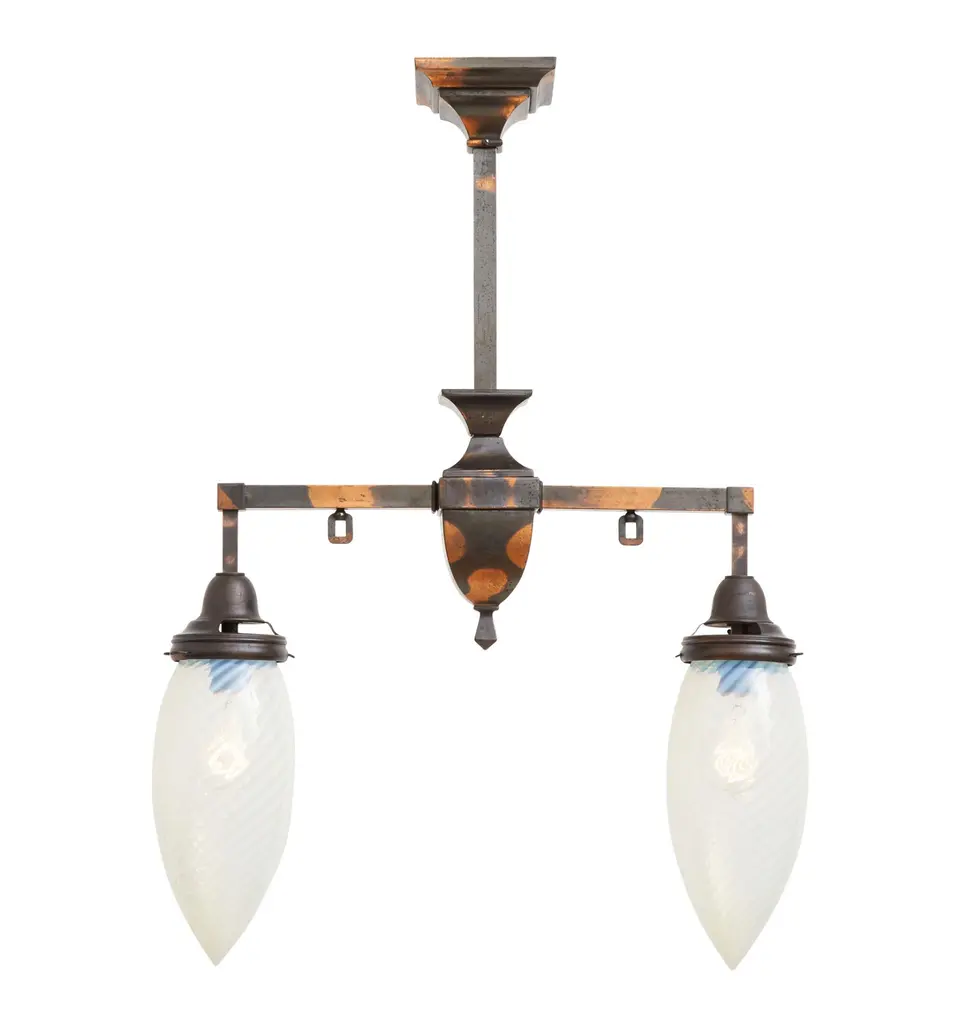 Commonly found in Foursquares, Bungalows, and Mission-style homes of the early 20th century, Arts & Crafts design is characterized by a strong sense of balance and symmetry. The Arts & Crafts style began around 1900 and remained prominent through the 1920s. The lighting typically features simple designs with square tubing, while more elaborate styles showcase nature-inspired embellishments, stained or opalescent art glass, or wrought-iron details. All our antique and vintage lighting is carefully sourced and restored by our knowledgeable Rejuvenation Vintage team at our Portland restoration studio keeping them out of landfills and giving them new life.