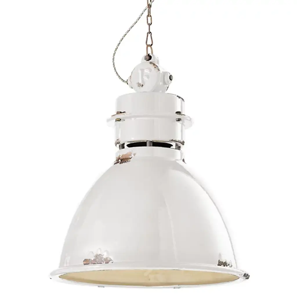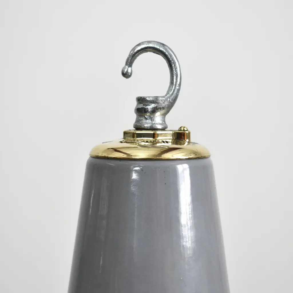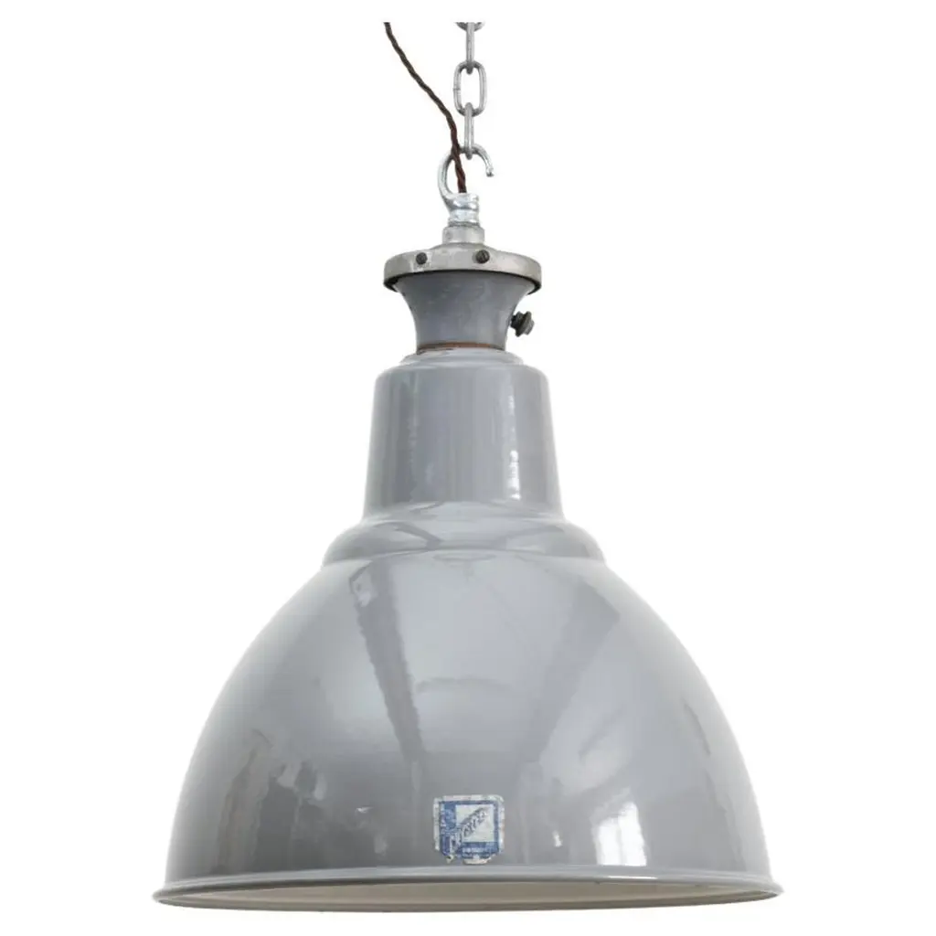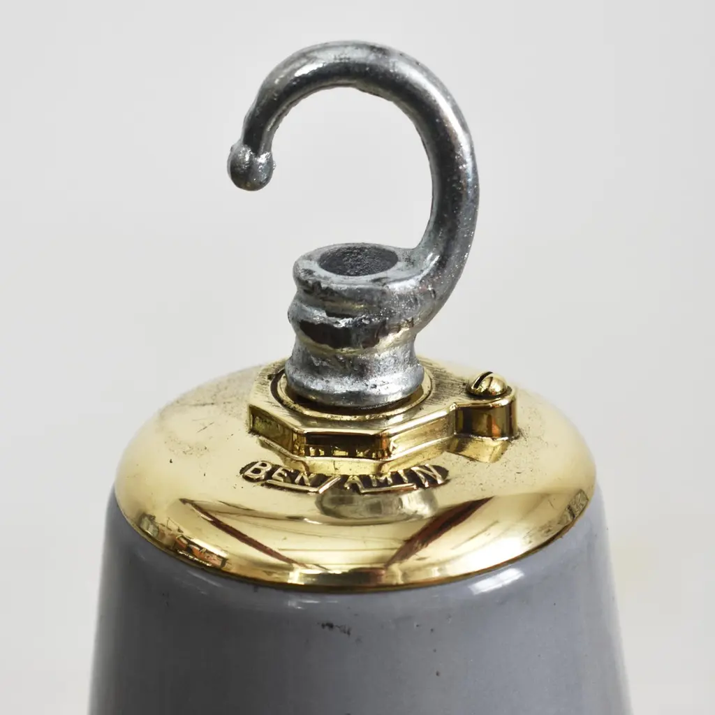 18″ Antique Industrial Grey Factory Pendant Light By Benjamin -AA large iconic industrial factory light shade manufactured by Benjamin Crysteel. The light shade is a spun vitreous glass grey enamel pendant and has retained its original brass X type gallery embossed with manufacturers name, the gallery has been polished back. This model is becoming a rare and sought after design and look great in any space.Dimensions:Height: 40cmDiameter: 46cmOrigin: Locomotive Works, Crewe, UKCirca: 1950Workshop Report: The workshop team inspect all products and perform any necessary repairs to ensure many more years of future use, With lighting we deep clean the shades and professionally remove all existing electrical components and fit new CE certified electrical fittings. This light is supplied with new period style brown twisted 3 core fabric flex and CE certified E27 screw lampholder and 1m steel hanging chain and ceiling hook. Lights can take up to 100W Equivalent LED bulb. Please contact us if thew wire colour and chain lengths need to be adjusted.As with all our products, This product is an original vintage item so there are exterior signs of wear in places, some minor enamel blemishes and discolouration in places. We advise all lighting is installed by a qualified electrician.Additional Info: Price is for a single Light,