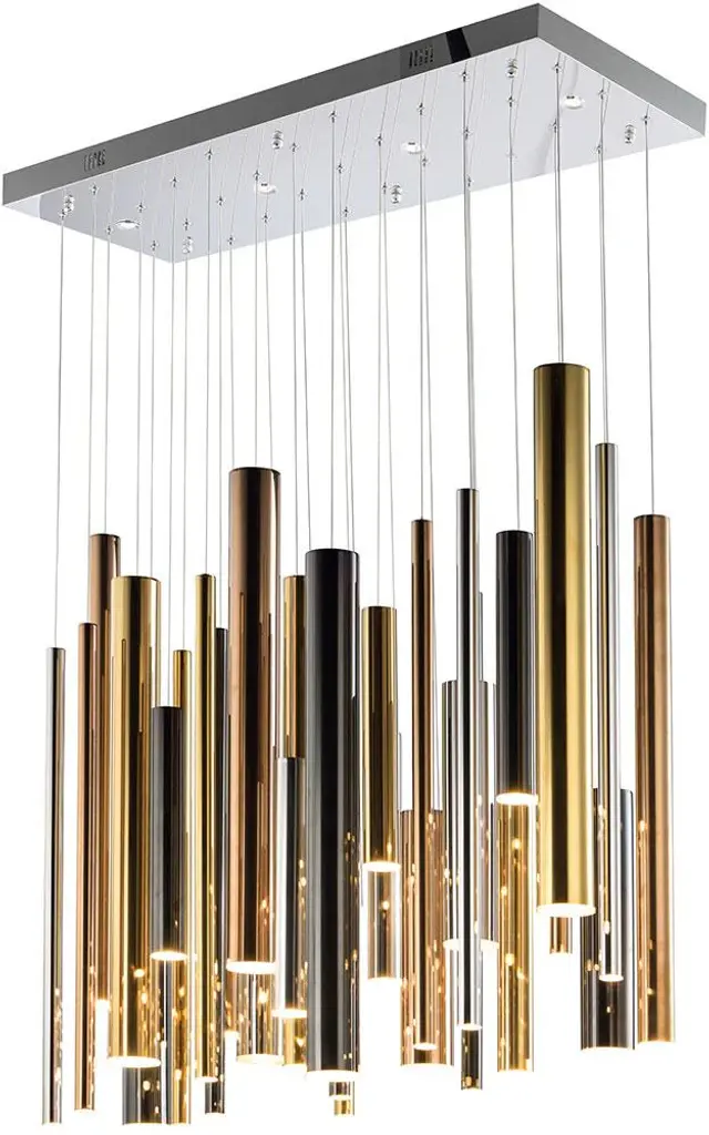 Suspended by braided adjustable cords, this LED fixture features straight tubular lines and the inclusion of metals carefully handcrafted to transition from parchment to magnificent glass, culminating in a stunning beam of light. Upper and lower lights can be wired independently for single or dual light control.