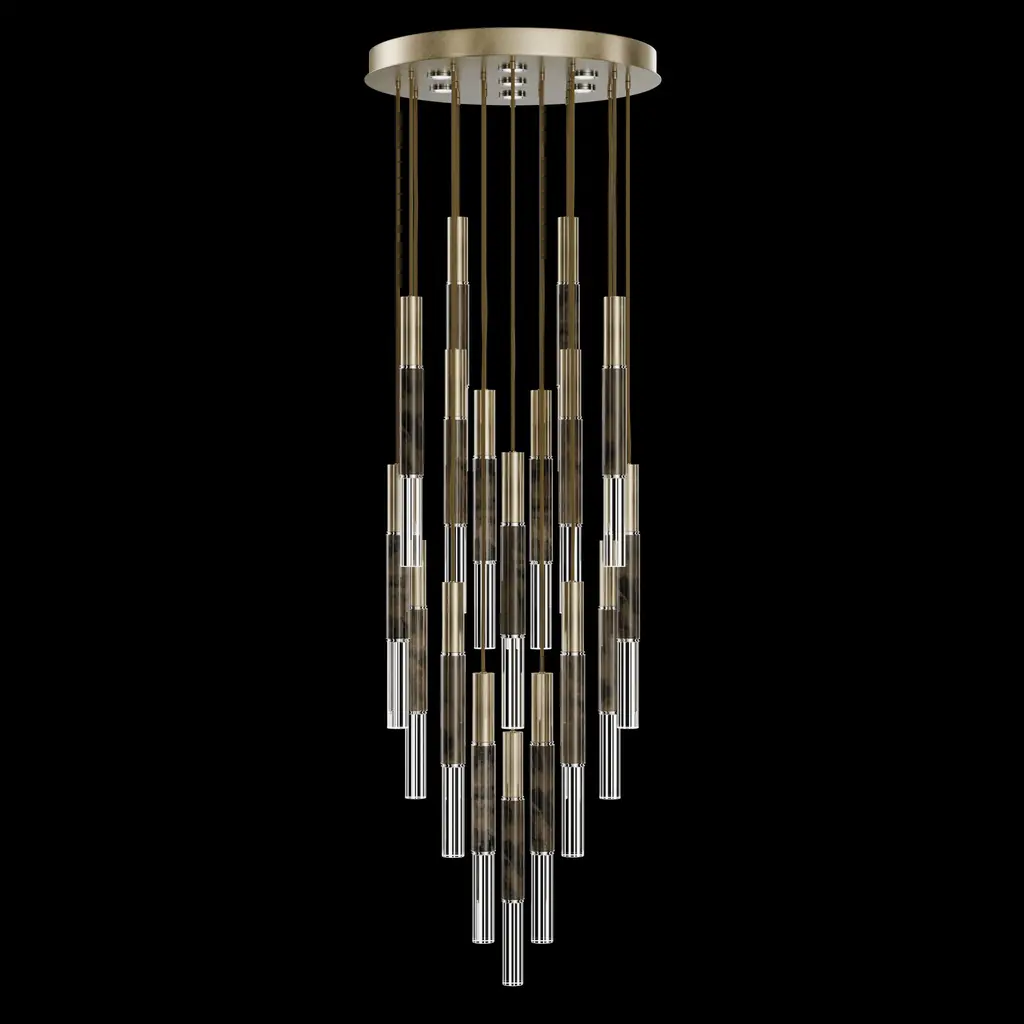 Suspended by braided adjustable cords, this LED fixture features straight tubular lines and the inclusion of metals carefully handcrafted to transition from parchment to magnificent glass, culminating in a stunning beam of light. Available in a wide range