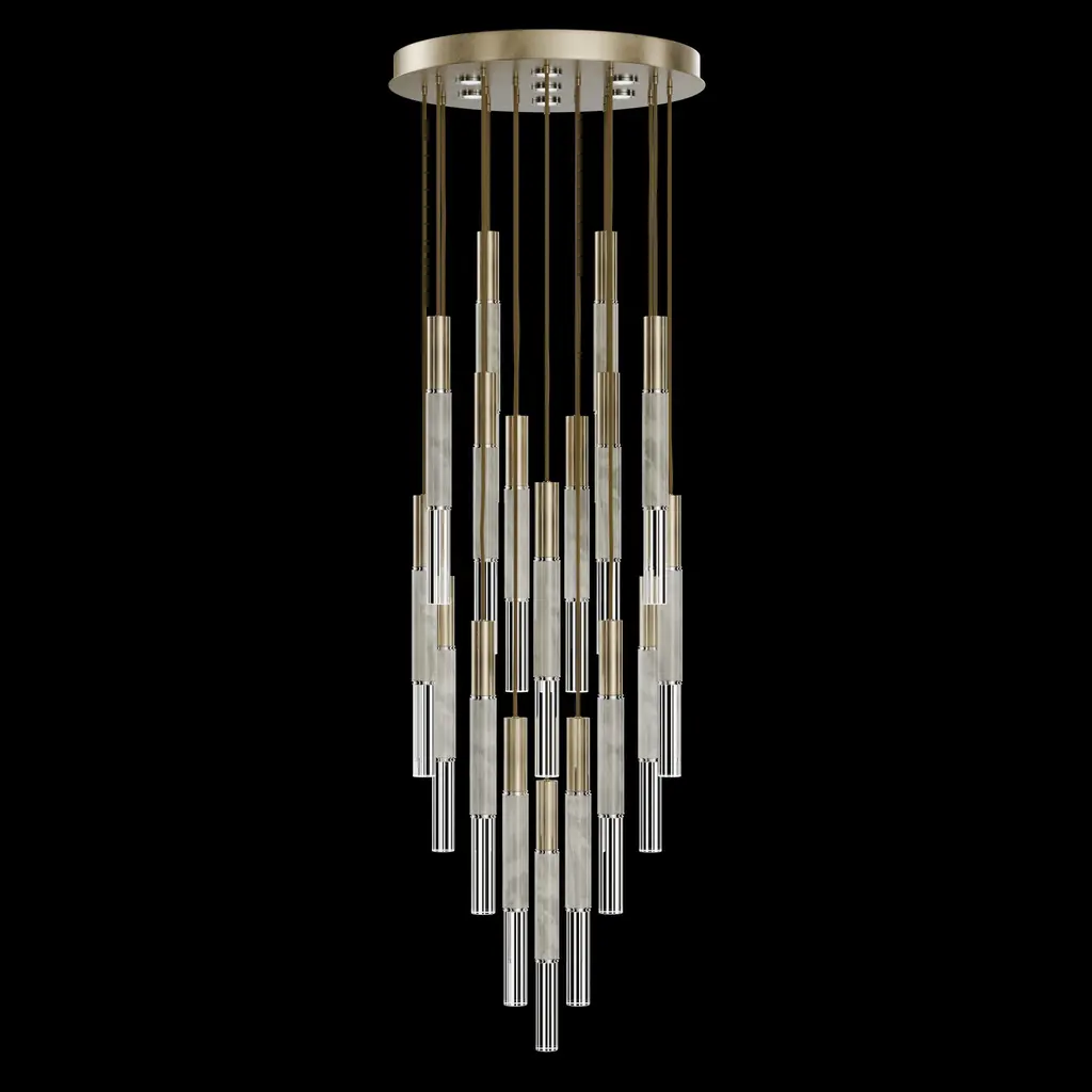 Suspended by braided adjustable cords, this LED fixture features straight tubular lines and the inclusion of metals carefully handcrafted to transition from parchment to magnificent glass, culminating in a stunning beam of light. Available in a wide range