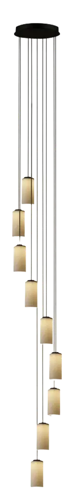 Suspended by braided adjustable cords, this LED fixture features straight tubular lines and the inclusion of metals carefully handcrafted to transition from parchment to magnificent glass, culminating in a stunning beam of light. Available in a wide range