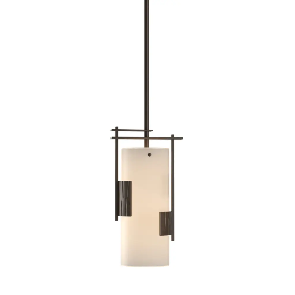 Single drop pendant featuring soft curves and the inclusion of metals carefully handcrafted to transition from parchment to magnificent glass, culminating in a stunning beam of light. Suspended by connectable rod segments for a customizable length. Avail
