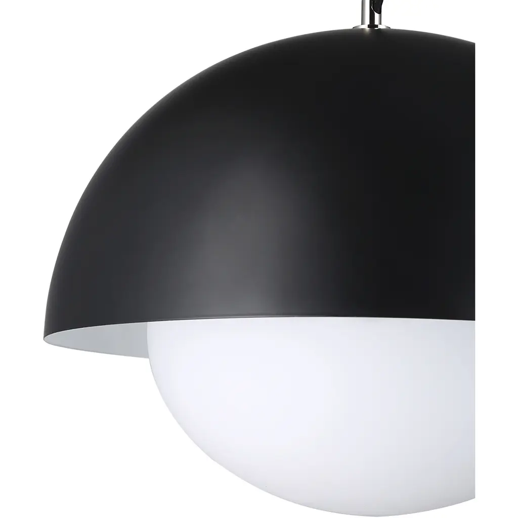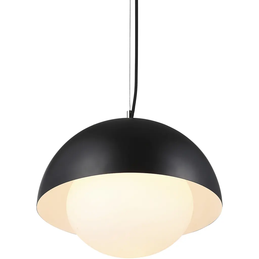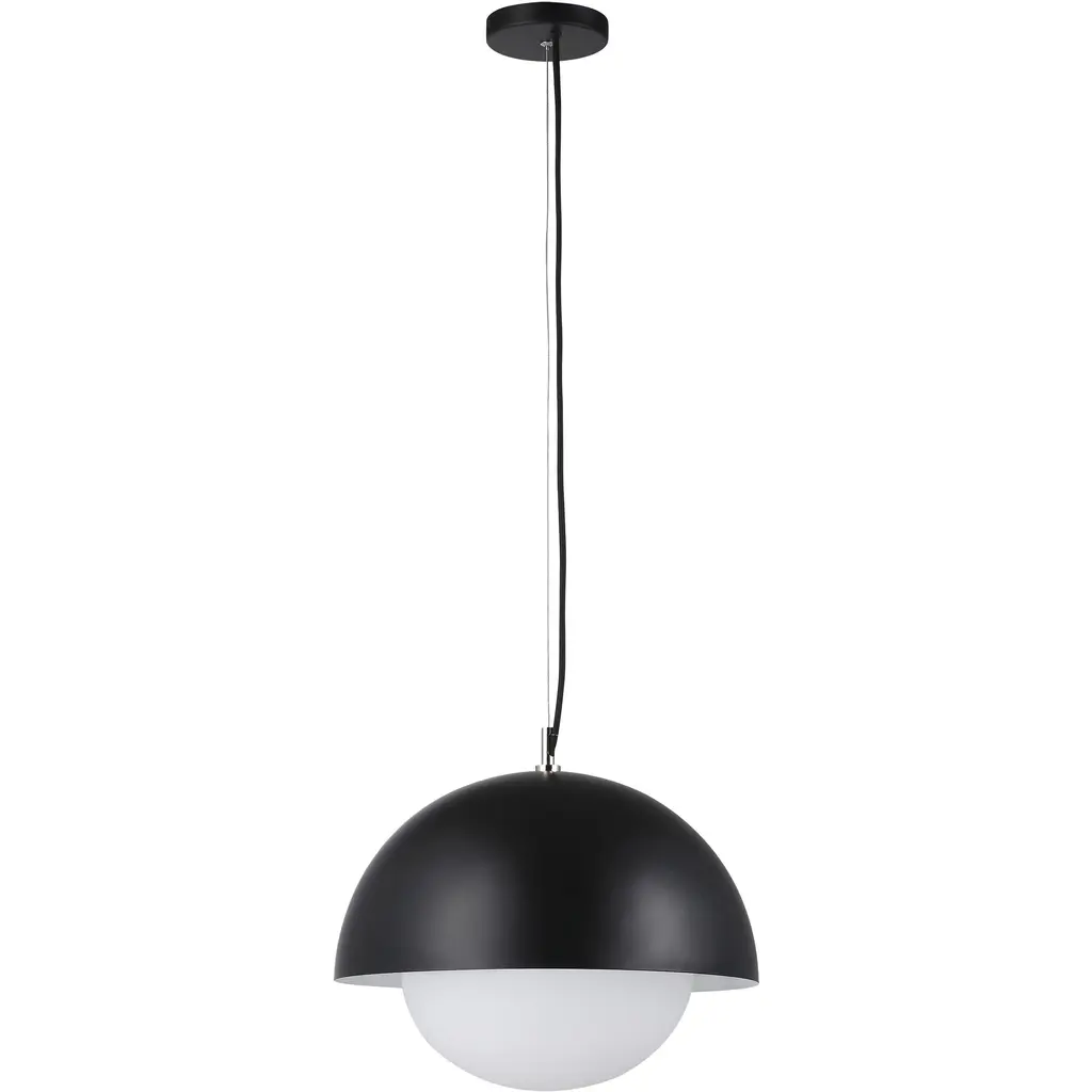 With a sleek, and minimalist silhouette, the Antonio ceiling light fixture offers an on-trend look that blends seamlessly in mid-century and ultra-modern settings. Clean lines and timeless finishes come to life through a sculptural dome-shaped shade in matte black powder coated iron that holds a white etched glass globe. An eye-catching element even when turned off, once illuminated, this pendant fixture becomes even more beautiful, diffusing warm, ambient light anywhere it hangs. Including an LED bulb and hardwiring with a black cloth-covered cable, this hanging ceiling light fixture is ready to be installed over a dining table, kitchen island, or any spot thats craving a shot of modern style.