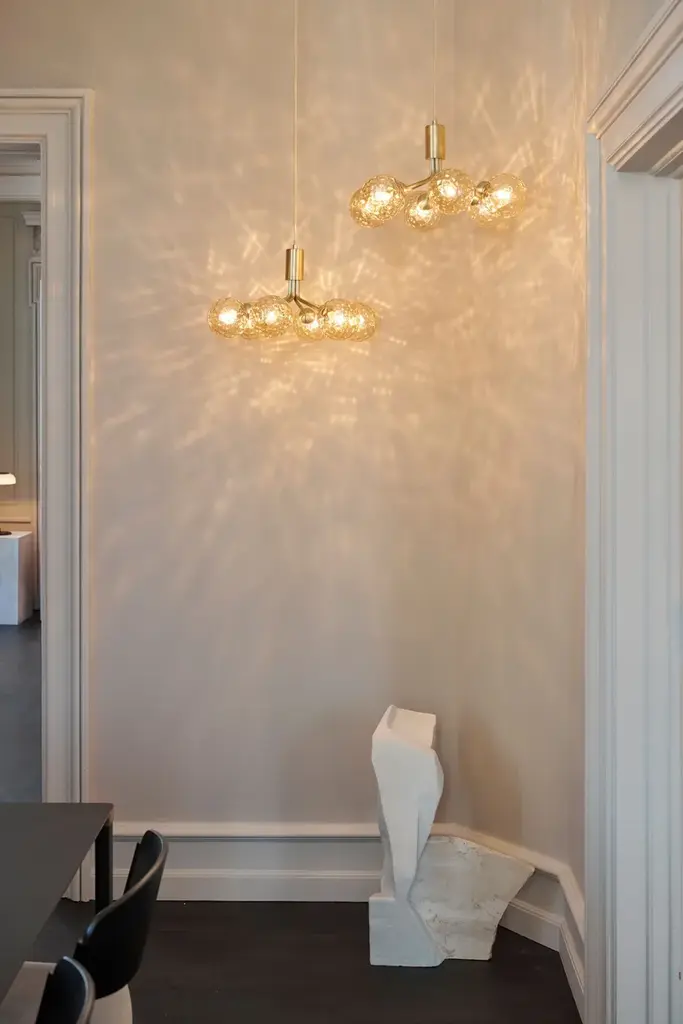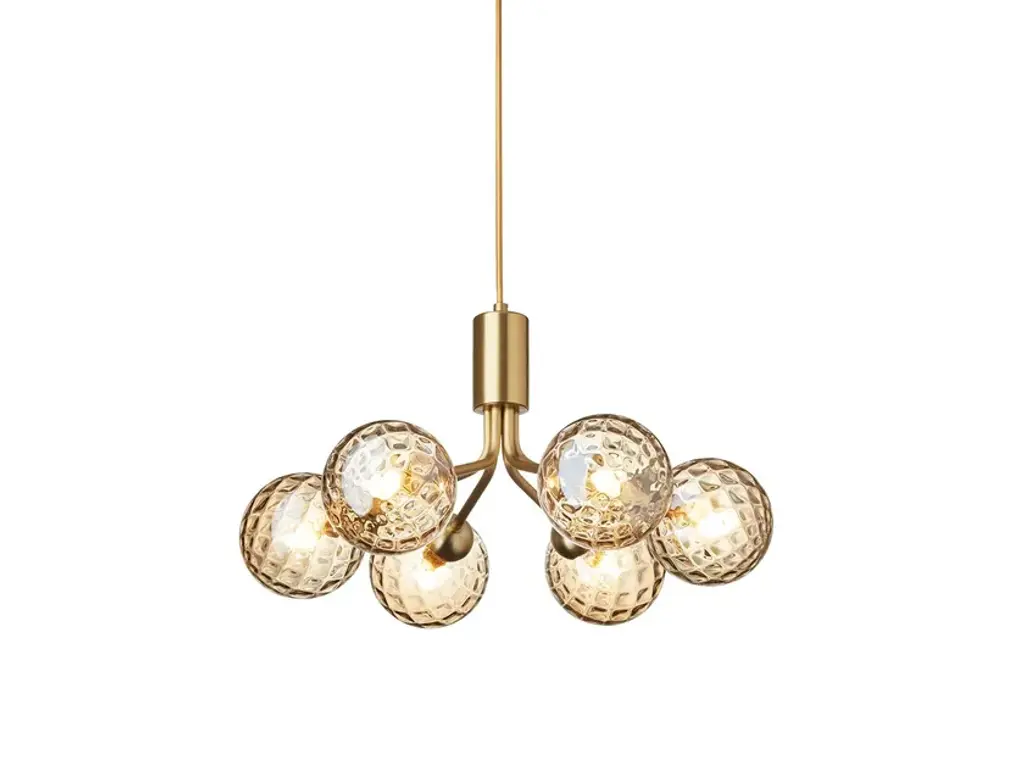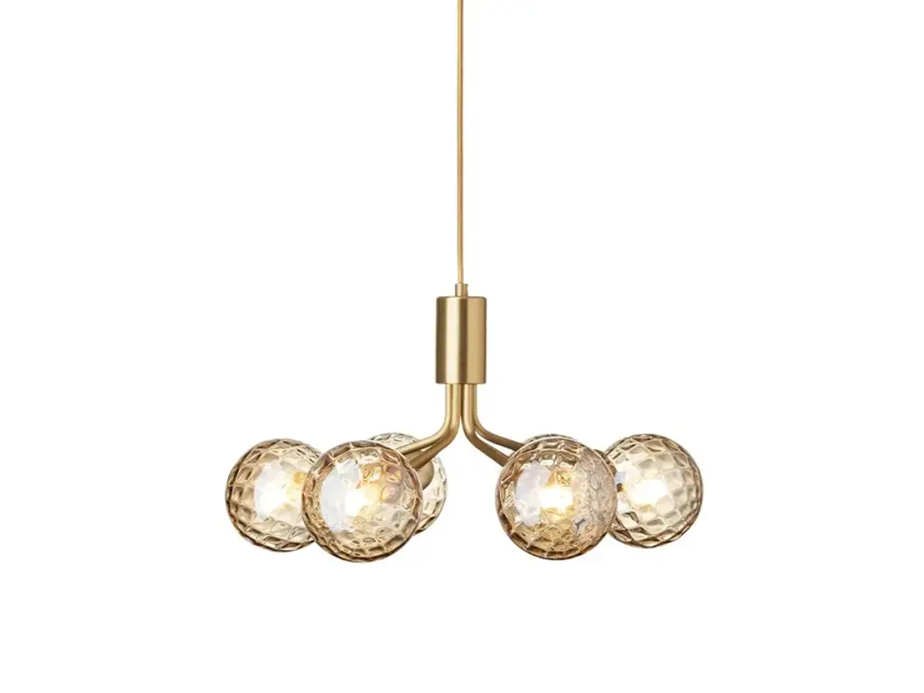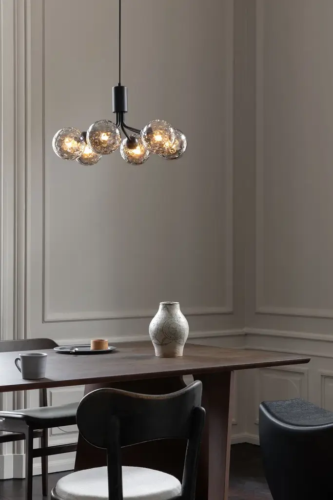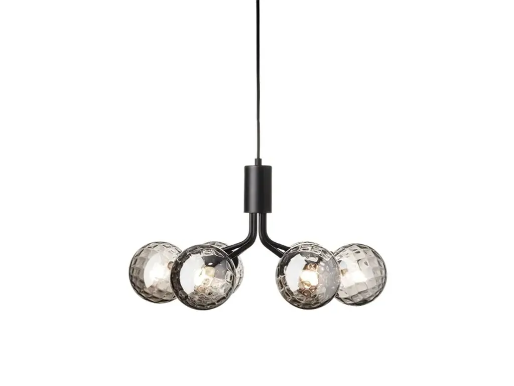 Apiales 6 is a new addition to the Apiales collection, inspired by wild umbellifer flowers. With the expression of a small chandelier, this multi-light pendant in satin black or brushed brass finish offers a sophisticated, yet subtle lighting effect as the optic smoked glass globes illuminate the area around the lamp. Ceiling plate included.Light source: Socket: G9Max wattage: 5W LEDVoltage (V): 220-240V / 120VLight source not includedDimmable if installed with appropriate dimmable LEDlight source(s) suitable for your dimmer circuit.With inspiration from flowers, Sofie Refer has designed the chandelier collection, Apiales.The collection consists of chandeliers with mouth-blown glass globes and are available in many finishes.From a specially-produced canopy, the arms unfold like flower stalks from which light is spread with grace.Suitable for residential homes, restaurants and hotels.