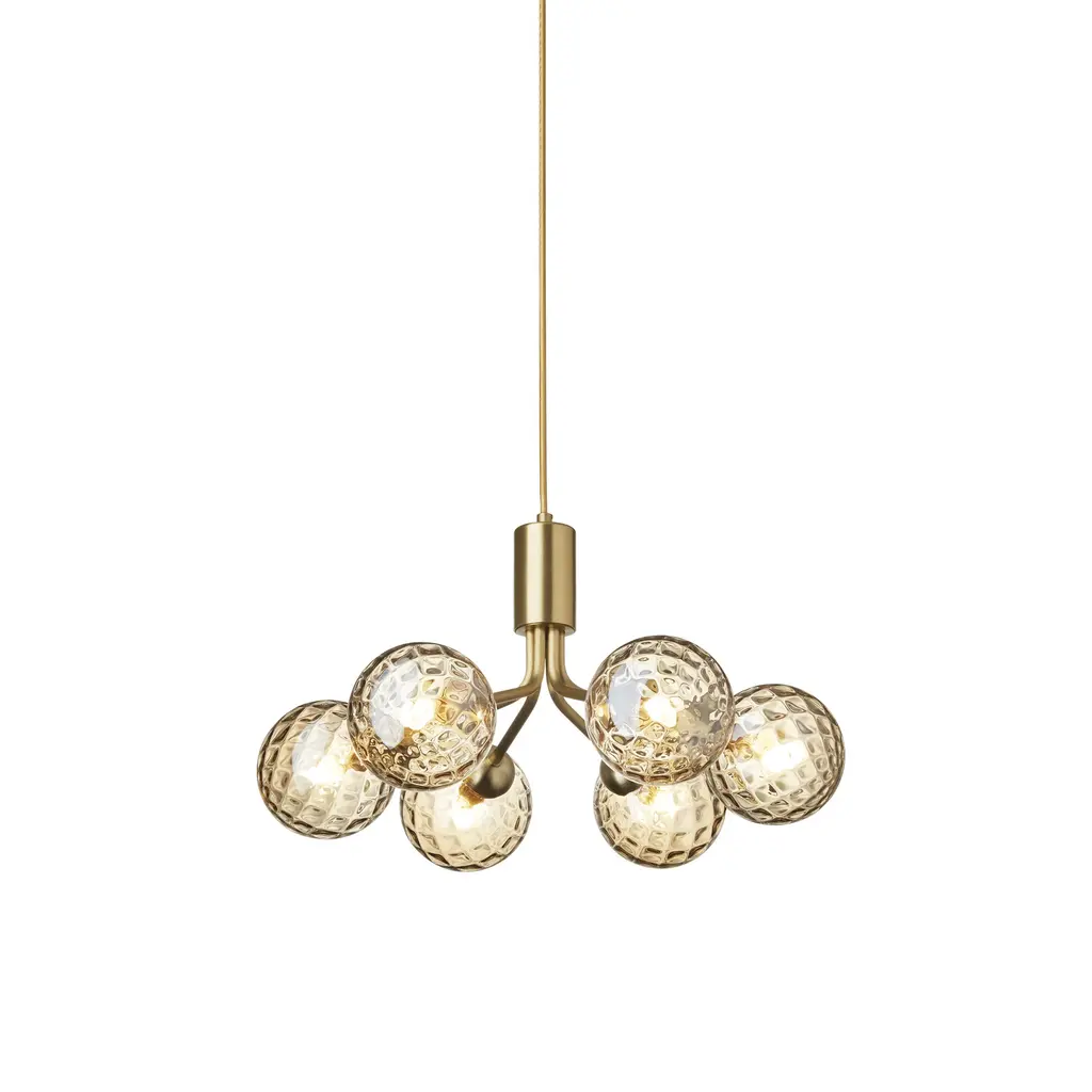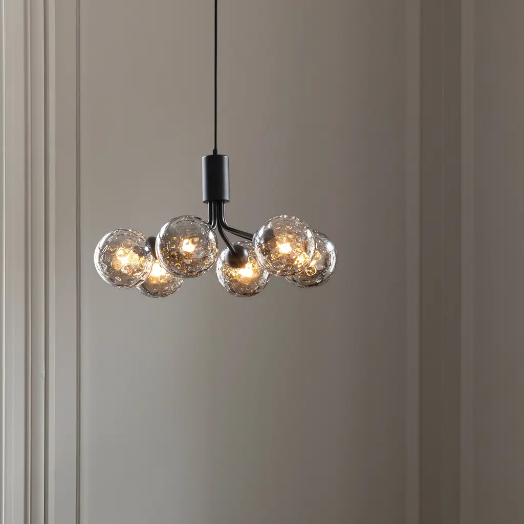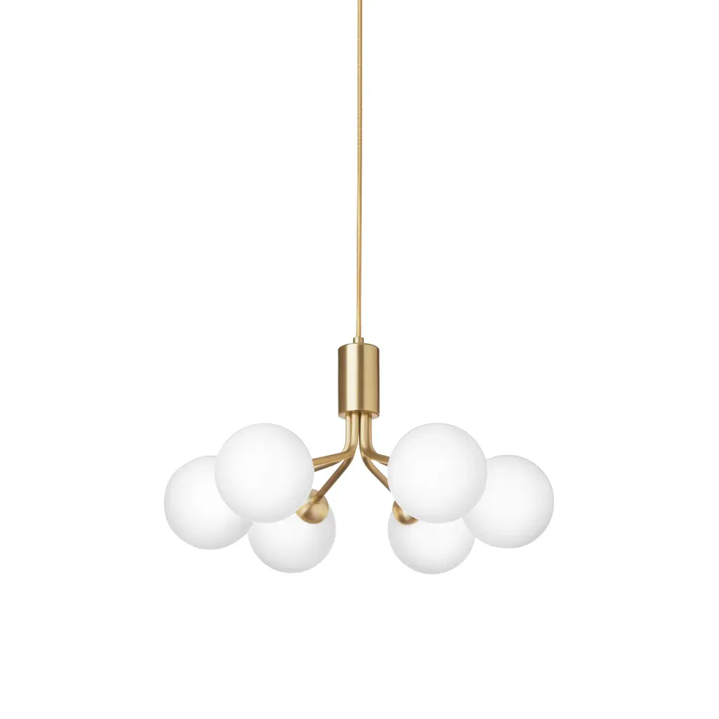 Apiales 6 is a multi-light pendant with a half-dozen mouth-blown globes attached to metal arms in either warm brushed brass or a graphic satin black finish. Create different lighting effects with the choice of handcrafted spheres in either opaque opal glass or clear smoked optic with a faceted sparkle. Adding a welcoming glow to smaller rooms, designer Sophie Refer contrives a compact pendant that provides very good light without obstructing the view.