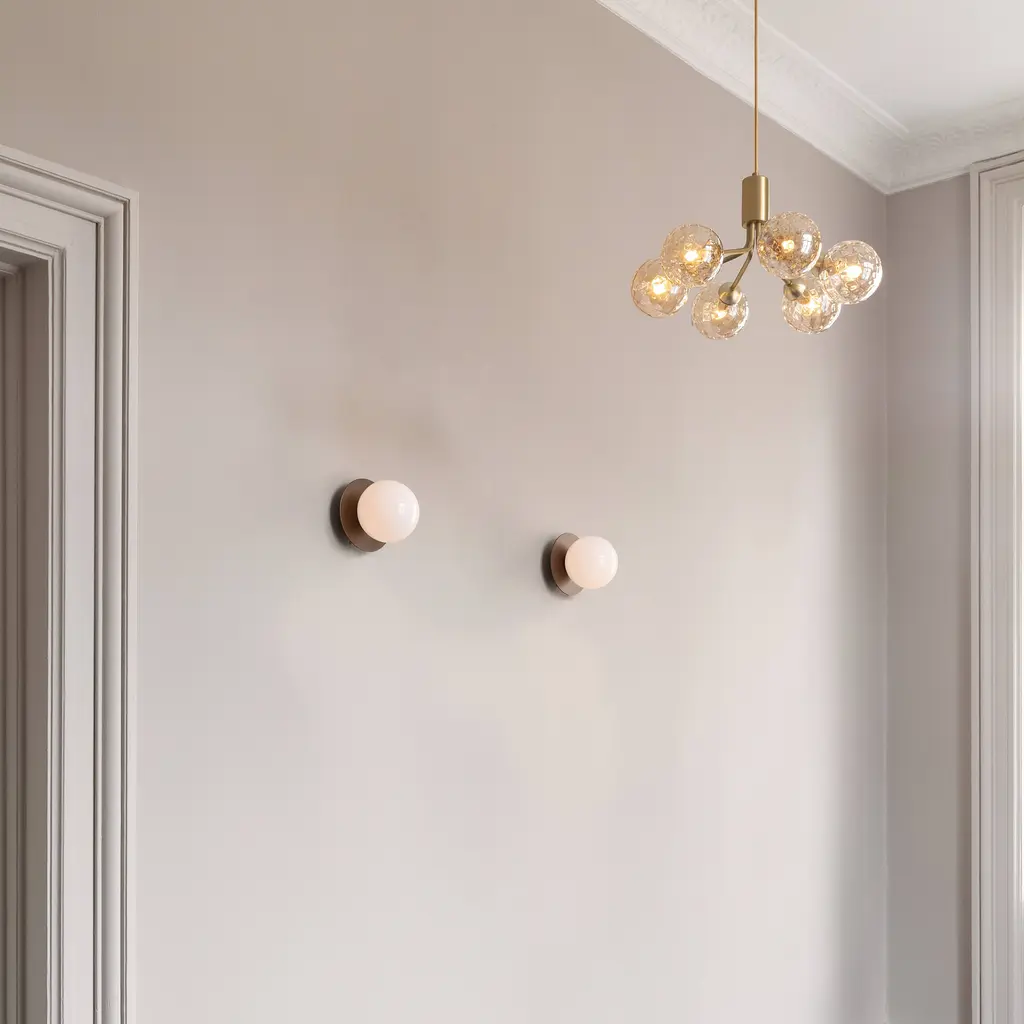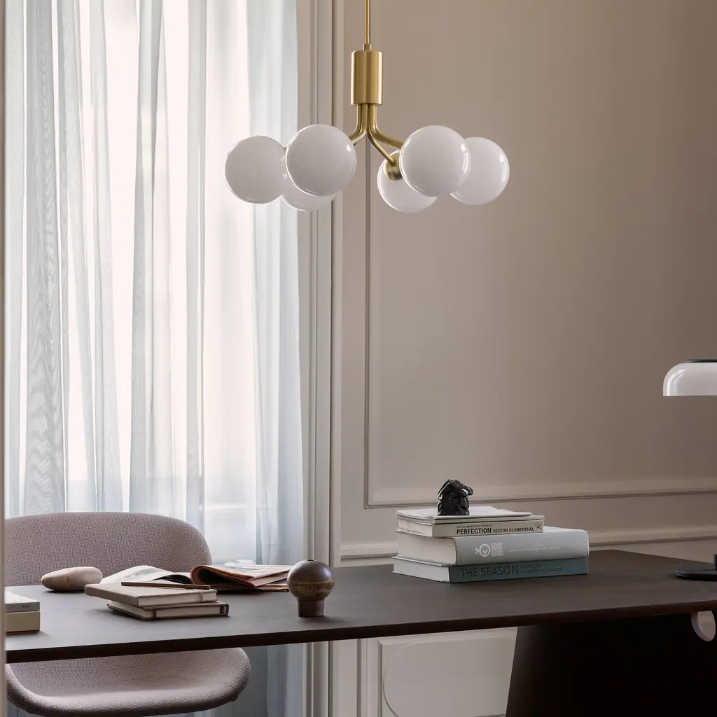 Apiales 6 is a multi-light pendant with a half-dozen mouth-blown globes attached to metal arms in either warm brushed brass or a graphic satin black finish. Create different lighting effects with the choice of handcrafted spheres in either opaque opal glass or clear smoked optic with a faceted sparkle. Adding a welcoming glow to smaller rooms, designer Sophie Refer contrives a compact pendant that provides very good light without obstructing the view.
