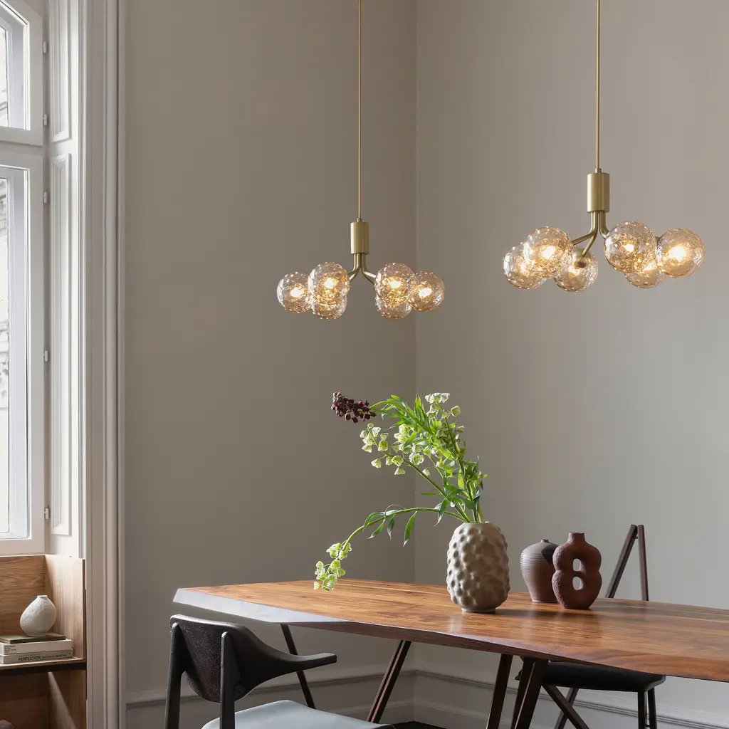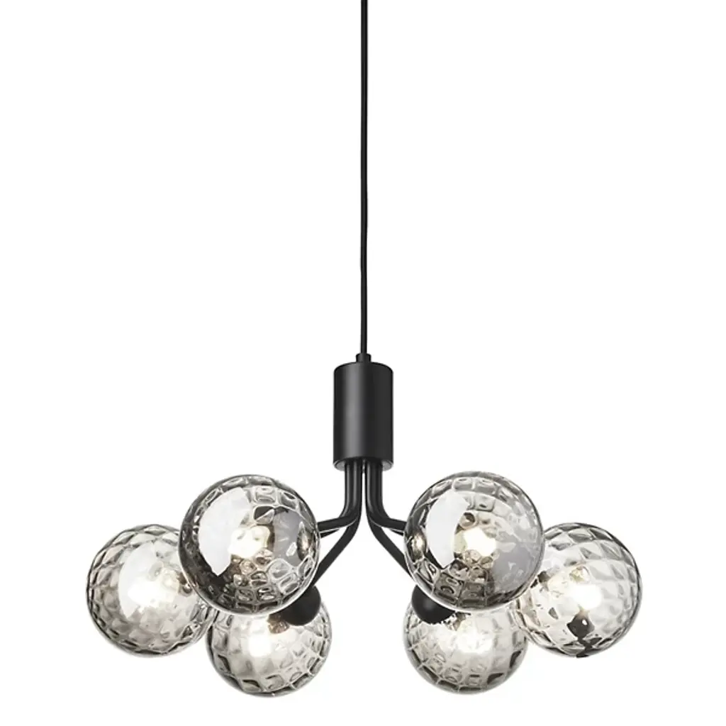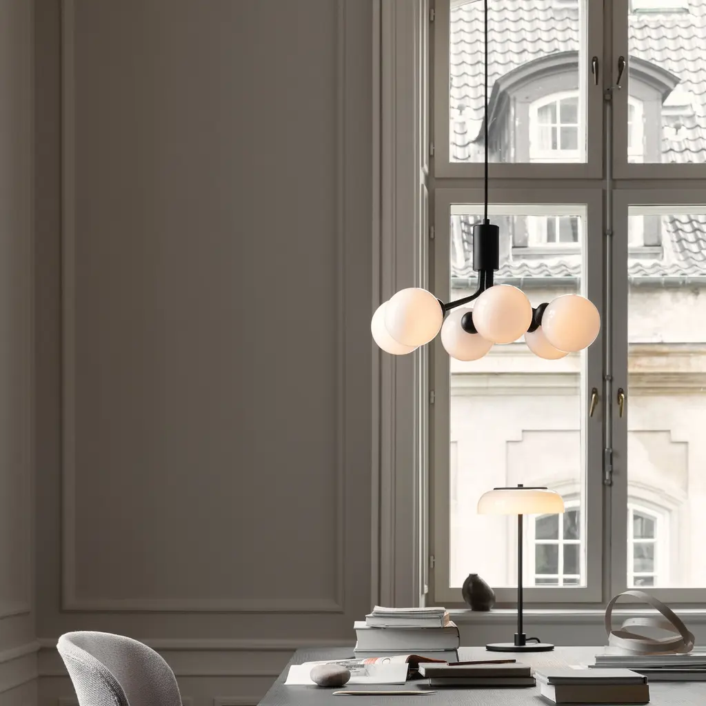 Apiales 6 is a multi-light pendant with a half-dozen mouth-blown globes attached to metal arms in either warm brushed brass or a graphic satin black finish. Create different lighting effects with the choice of handcrafted spheres in either opaque opal glass or clear smoked optic with a faceted sparkle. Adding a welcoming glow to smaller rooms, designer Sophie Refer contrives a compact pendant that provides very good light without obstructing the view.