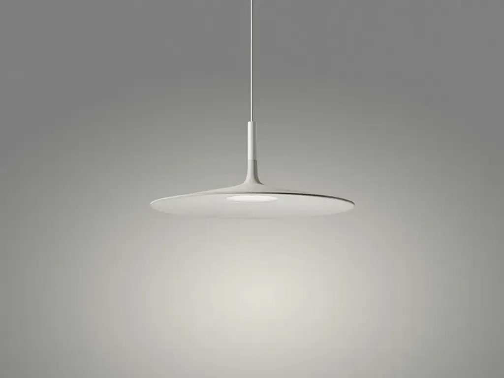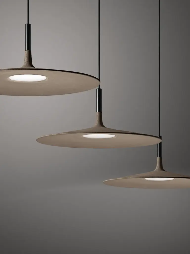 Aplomb Large is a pendant lamp made of concrete, aluminium and polycarbonate.LIGHT SOURCEAplomb Large LED220/240 VLED included11,7W multichip mid power2700 K 1279 lm CRI>90Dimmable On-Off/Push/DALIAplomb Large LED MyLight220/240 VLED included11,7W multichip mid power2700 K 1279 lm CRI>90Dimmable via Bluetooth with Casambi AppOn-Off/Push/DALIIP 20Energy efficiency FThe lamp has a black cord. Only the white version has a white cord. Minimal thickness, ample size, a rugged surface, yet pleasing to the touch: Aplomb Large represents a design challenge resolved through a totally handmade process. With built-in LEDs, it spreads light in a large beam across the surface below.