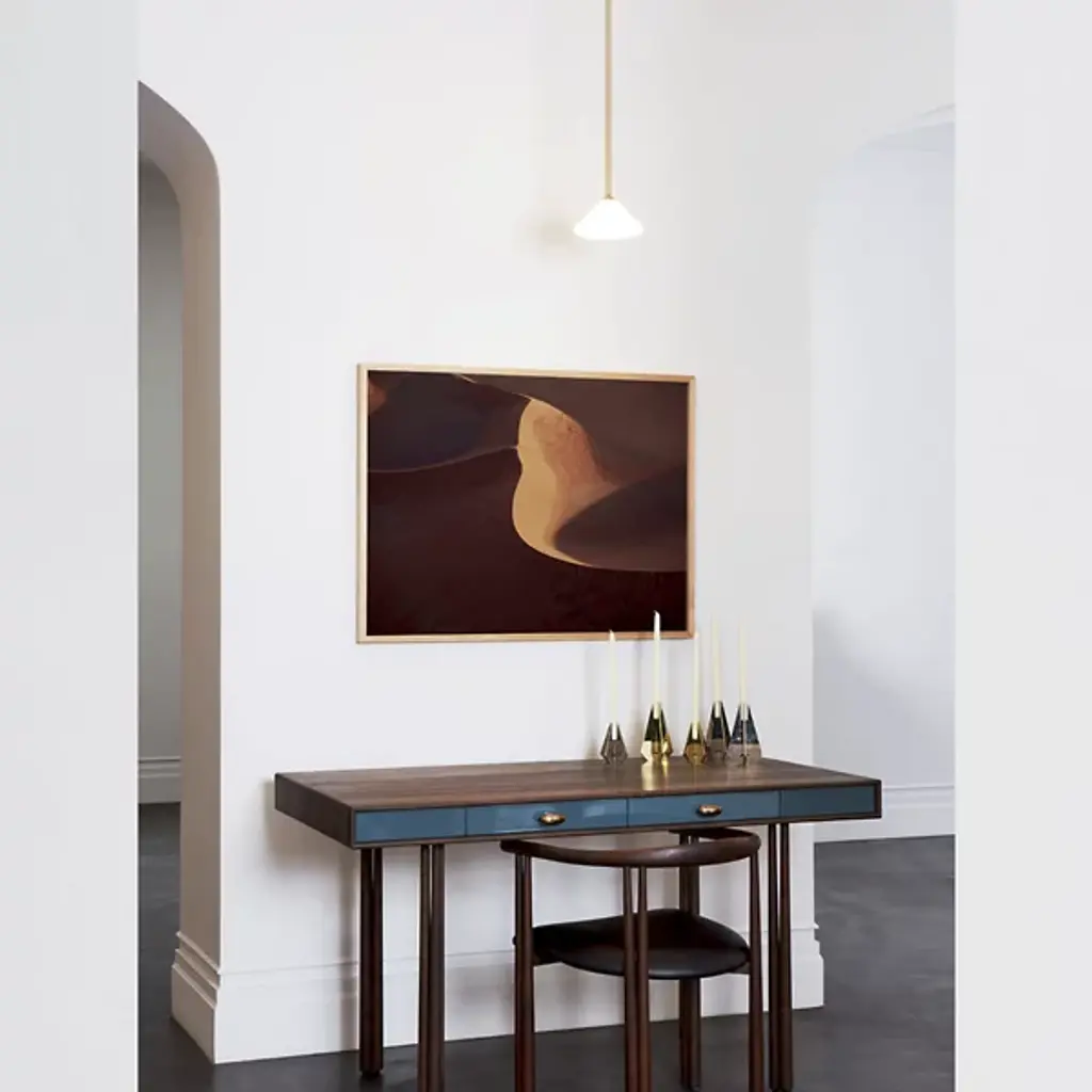 Representing beauty and light like its namesake, the Apollo LED Stemmed Mini Pendant from Roll & Hill takes on a classic silhouette with refined style. Creators McKenzie & Keim bring a visual language based on minimal lines and beautiful interactions between components. This piece slots overhead with a detail-rich wood canopy. The organic notes of the wood contrast against the sharp, uniform line of the metal downrod. This downrod brings one’s attention to the charming cone outline of the shade. The handblown glass shade nestles LEDs to reduce glare. Its opaque surface and flared form suggest an ambient downlight.