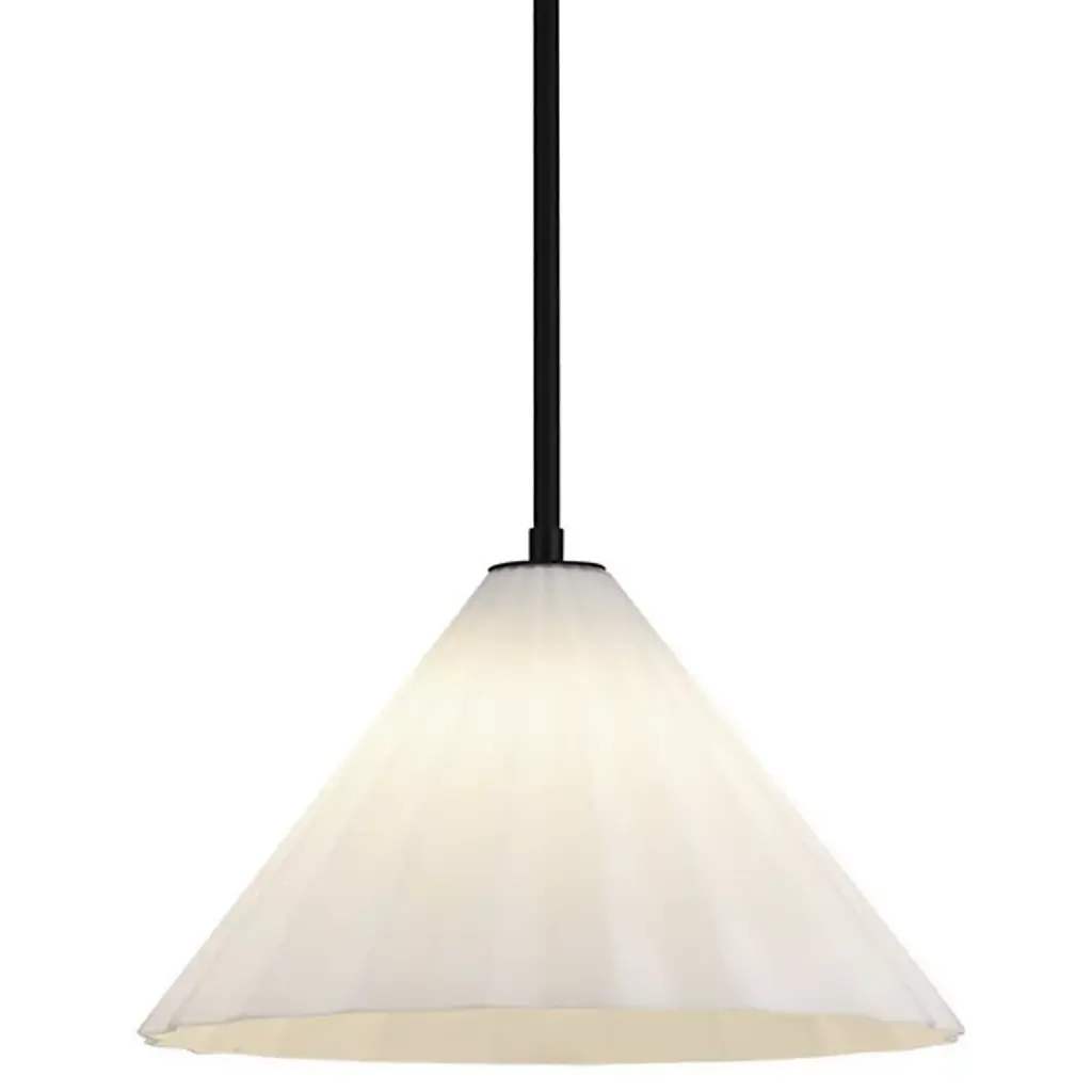 Representing beauty and light like its namesake, the Apollo LED Stemmed Mini Pendant from Roll & Hill takes on a classic silhouette with refined style. Creators McKenzie & Keim bring a visual language based on minimal lines and beautiful interactions between components. This piece slots overhead with a detail-rich wood canopy. The organic notes of the wood contrast against the sharp, uniform line of the metal downrod. This downrod brings one’s attention to the charming cone outline of the shade. The handblown glass shade nestles LEDs to reduce glare. Its opaque surface and flared form suggest an ambient downlight.