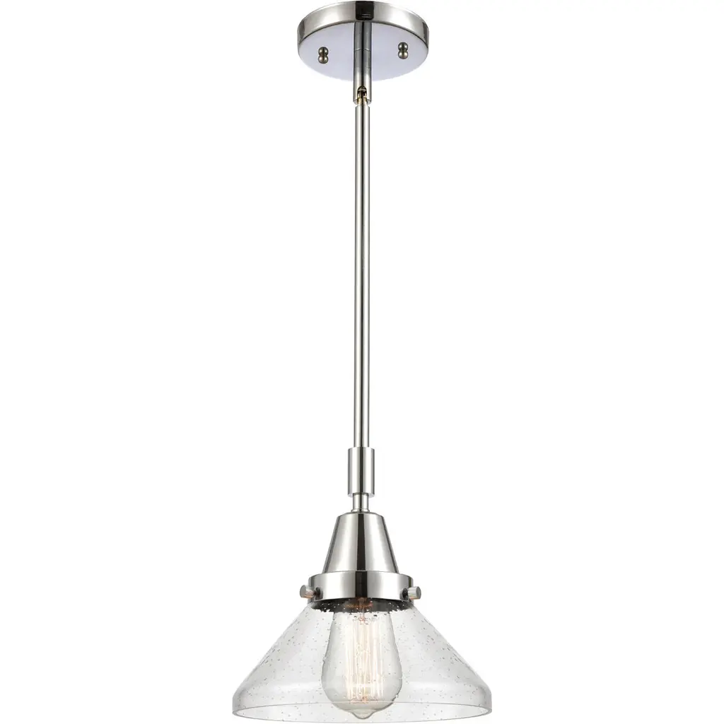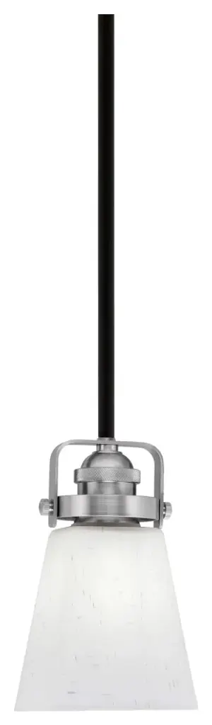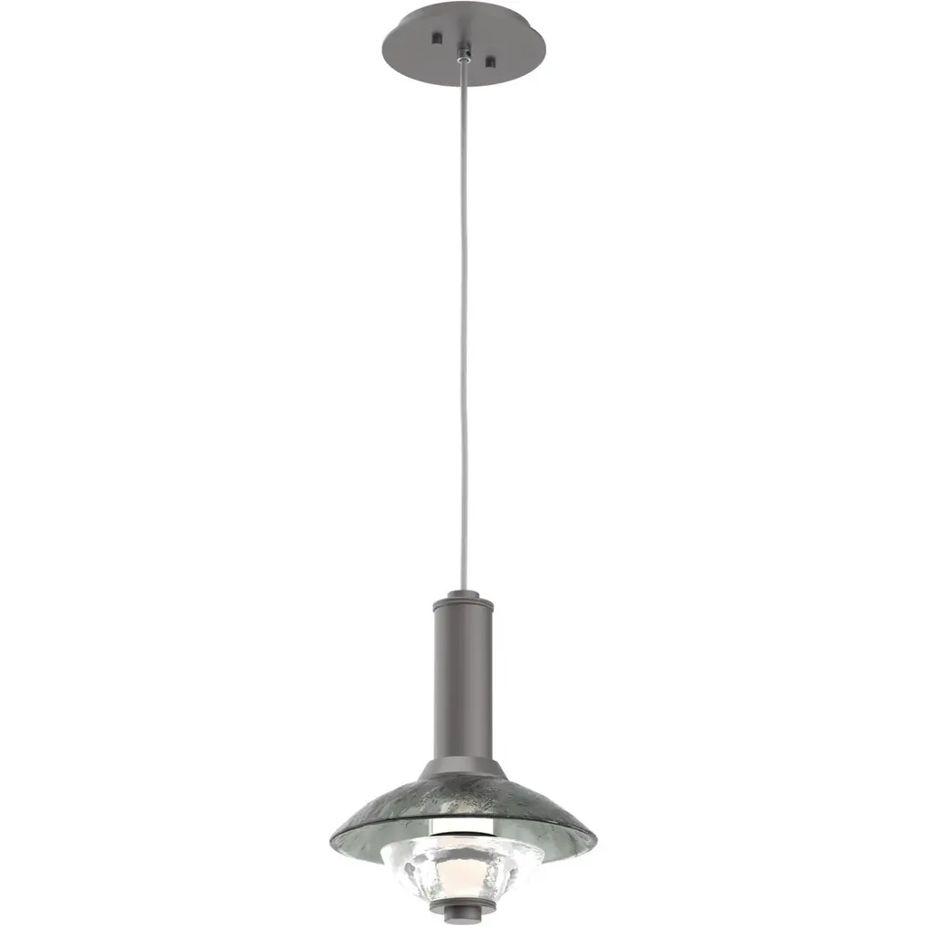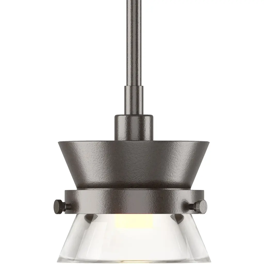 Clean geometric lines comprise the Hubbardton Forge Apparatus Mini Pendant. A thick, Clear cone of hand-blown glass is topped by an inverted cone of hand-forged iron. The middle of the shade is cinched and secured by a sturdy band, creating simple symmetry. Apparatus has a small size, but its industrial styling lends it a substantial feel.
