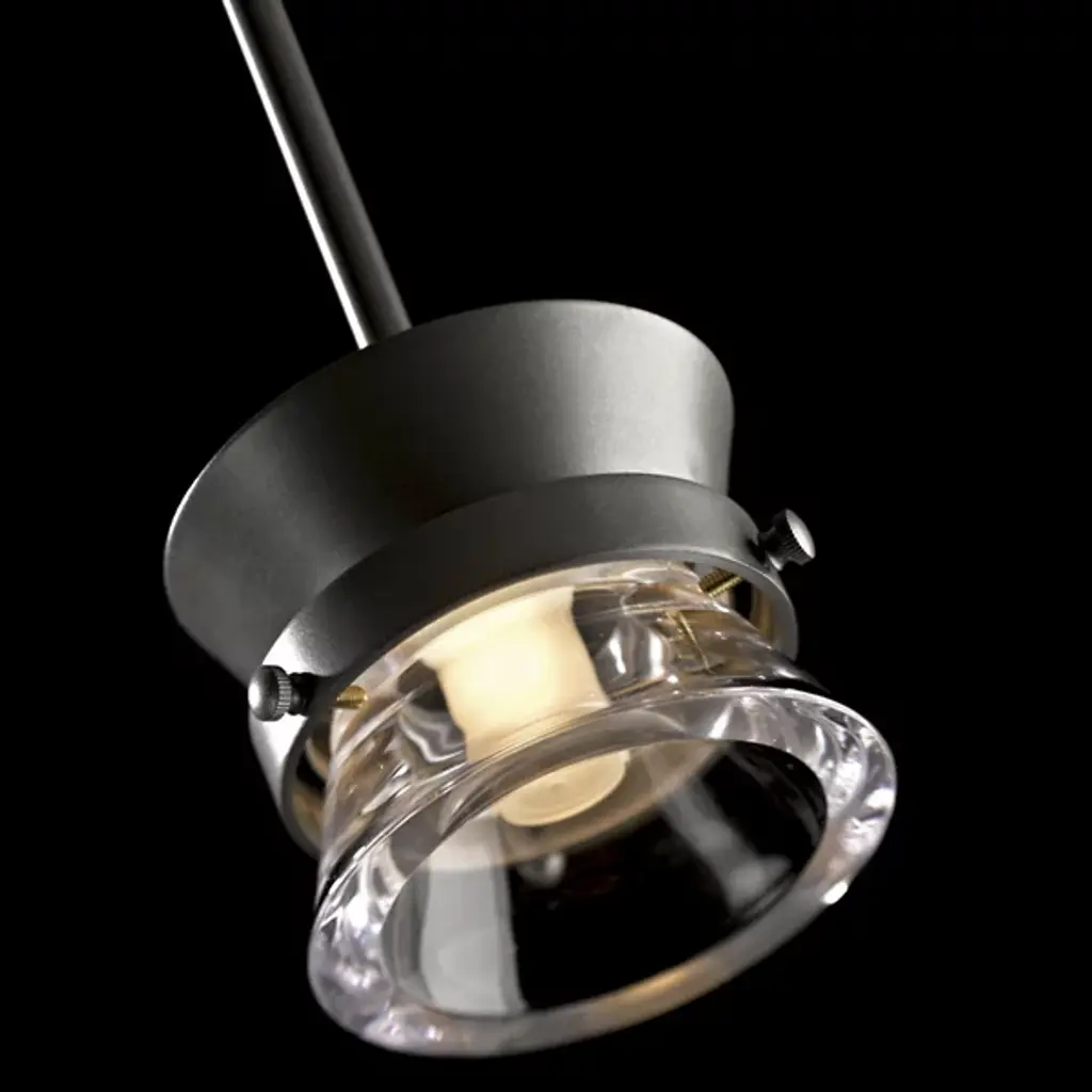 Clean geometric lines comprise the Hubbardton Forge Apparatus Mini Pendant. A thick, Clear cone of hand-blown glass is topped by an inverted cone of hand-forged iron. The middle of the shade is cinched and secured by a sturdy band, creating simple symmetry. Apparatus has a small size, but its industrial styling lends it a substantial feel.