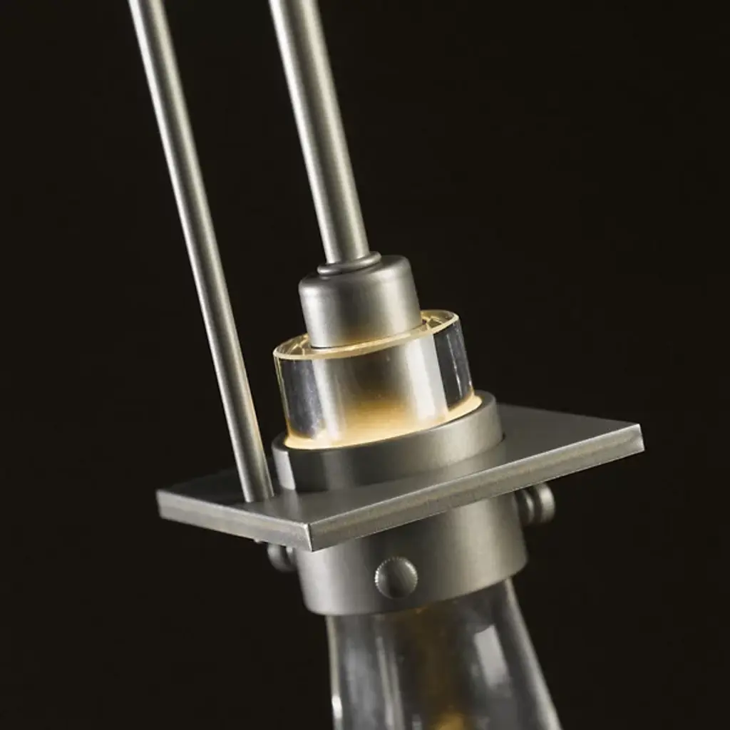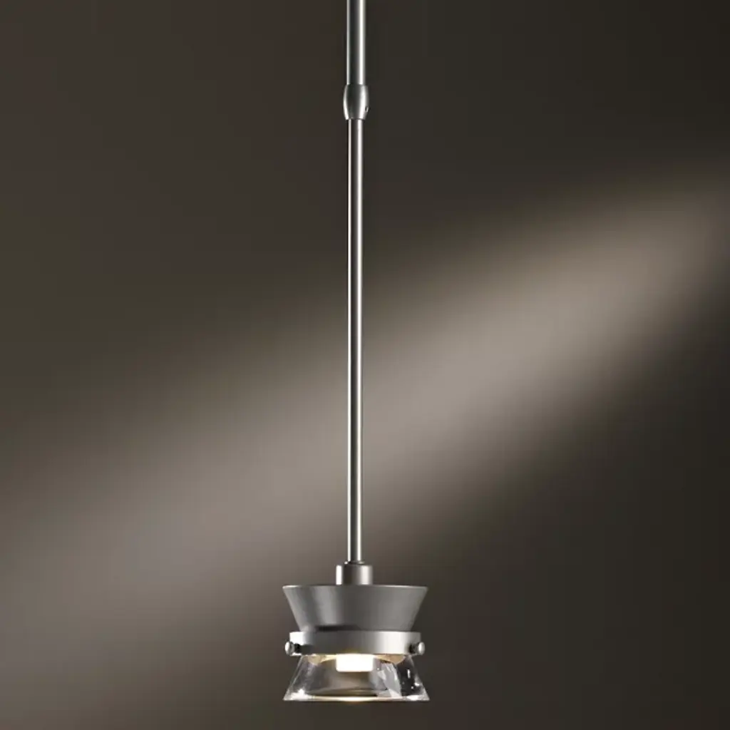 Clean geometric lines comprise the Hubbardton Forge Apparatus Mini Pendant. A thick, Clear cone of hand-blown glass is topped by an inverted cone of hand-forged iron. The middle of the shade is cinched and secured by a sturdy band, creating simple symmetry. Apparatus has a small size, but its industrial styling lends it a substantial feel.