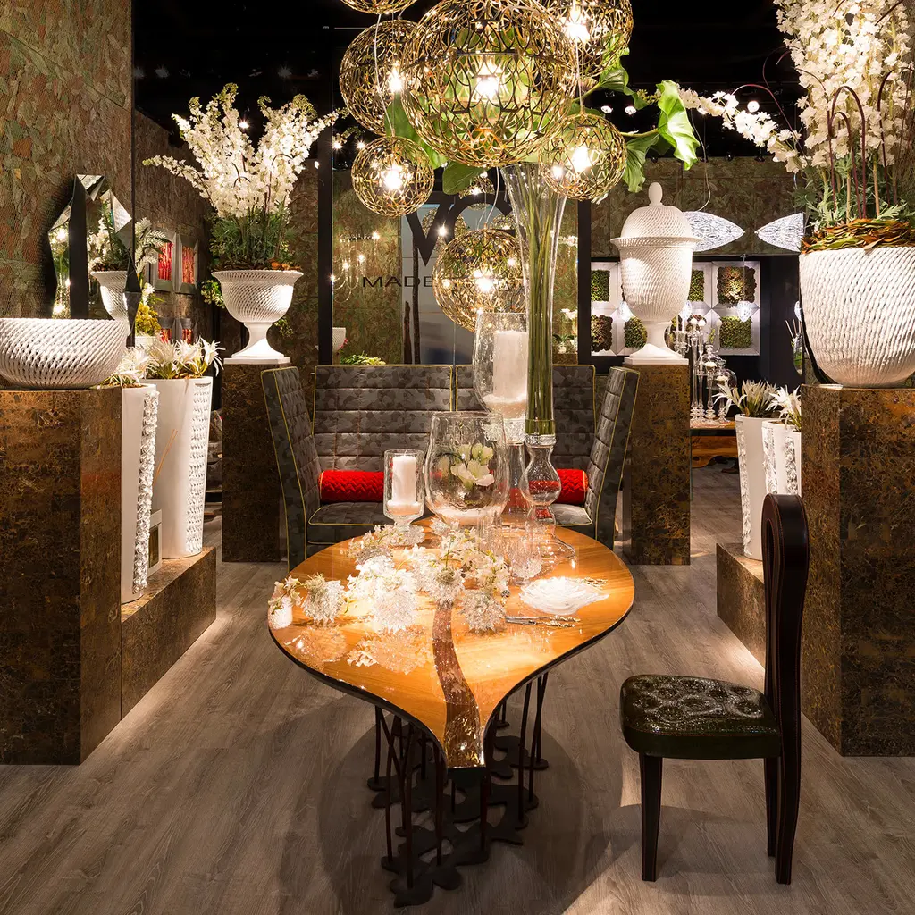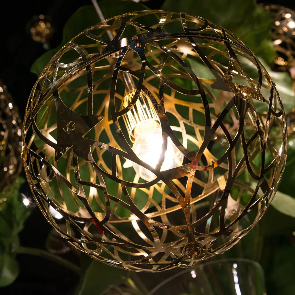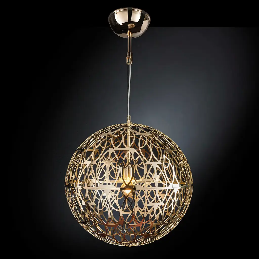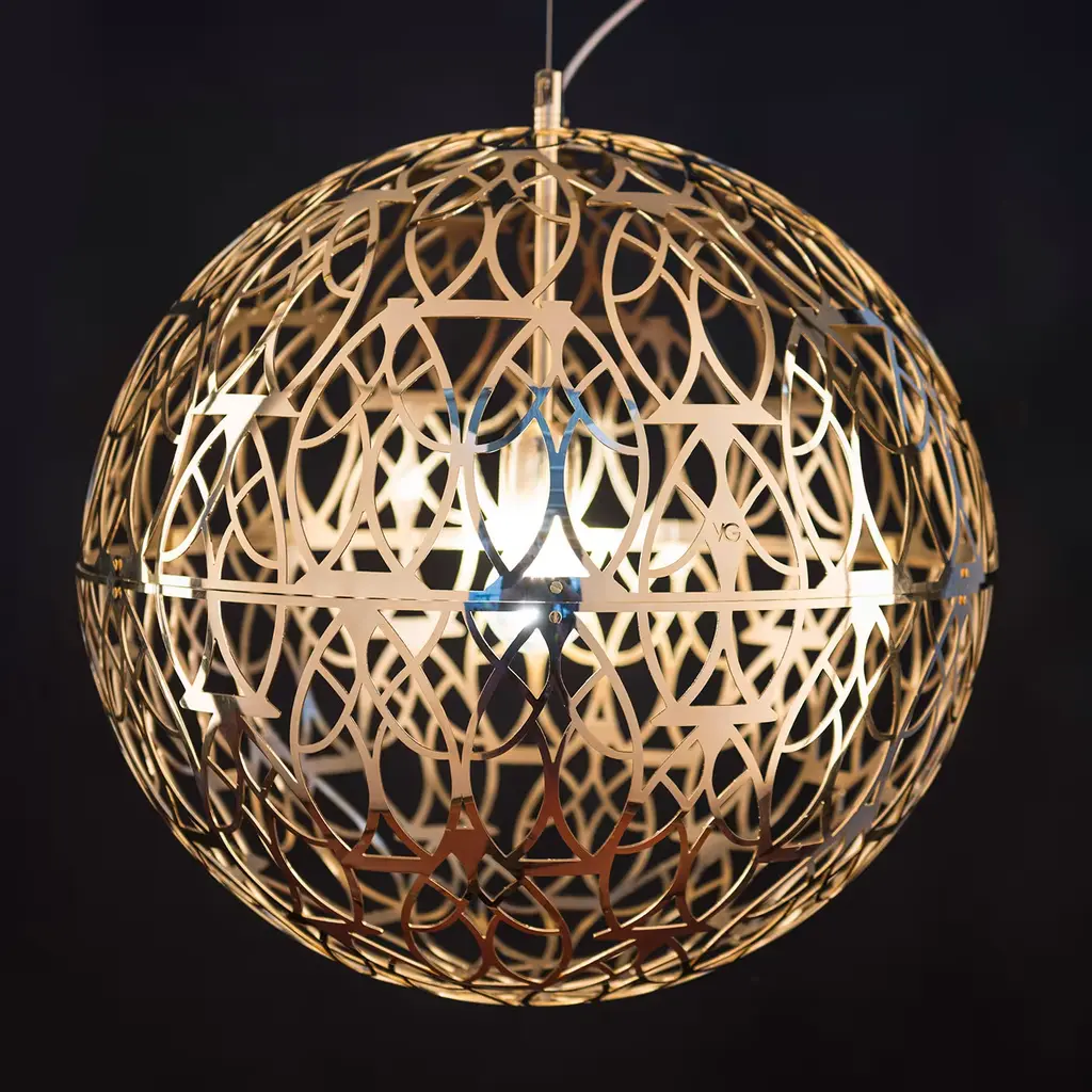 A stunning pendant light of exquisite design, this piece will be a bold and sophisticated choice for a modern interior, where it will illuminate an entryway, living room, or any commercial space adding a textural decoration of rare elegance. The spherical shade is crafted with elements in glossy chrome-finished steel welded together in a luminous dance. The galvanized gold finish adds a warm glow to this lamp that can be customized in dimensions and finishes upon request. Please contact the Concierge for options and details.