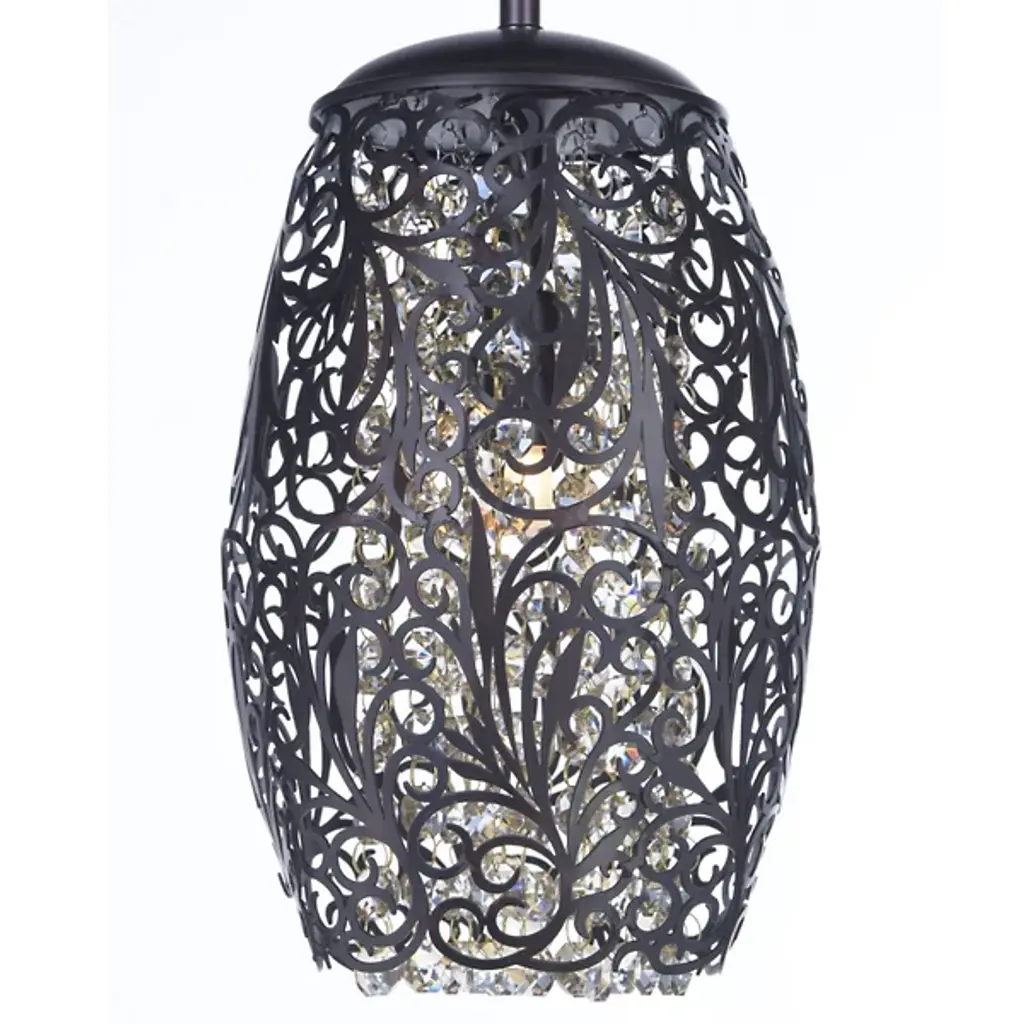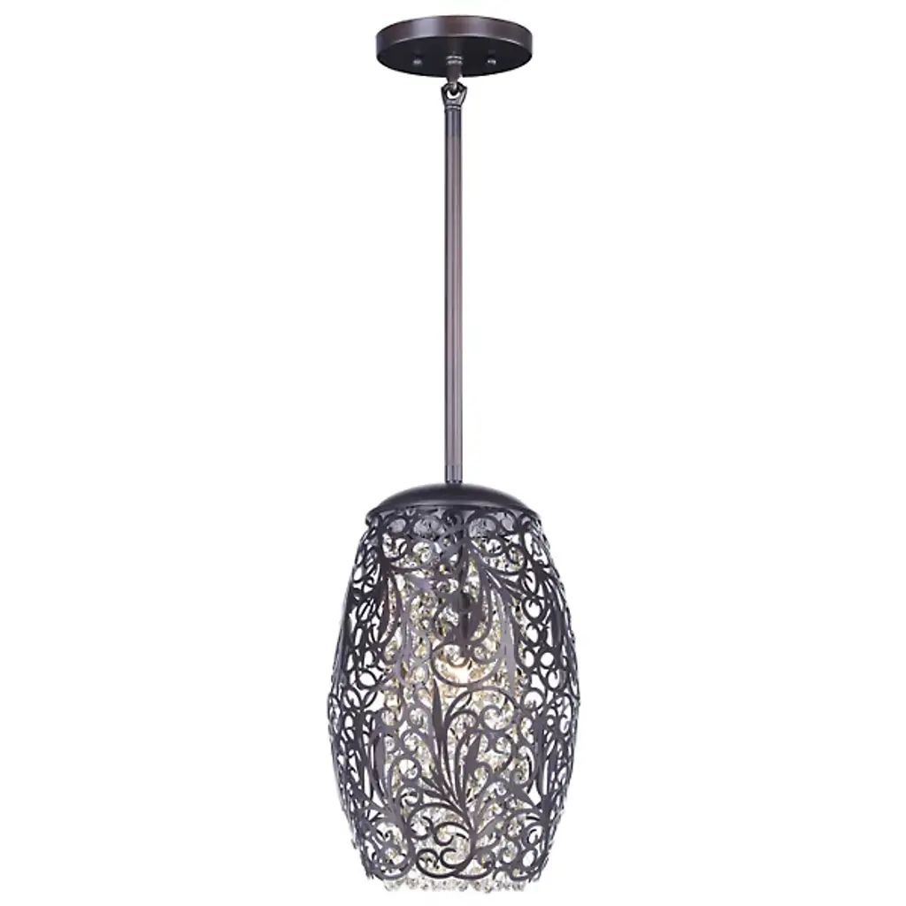 The Maxim Lighting Arabesque Mini Pendant has an exotic design that is really quite mesmerizing. From a distance, the warm shimmer of the dynamic finish catches the eye. Come up close, and the spell is made complete with the intricate, sinuous details of the curved shade and warm sparkle of the beveled crystal strands dangling within.