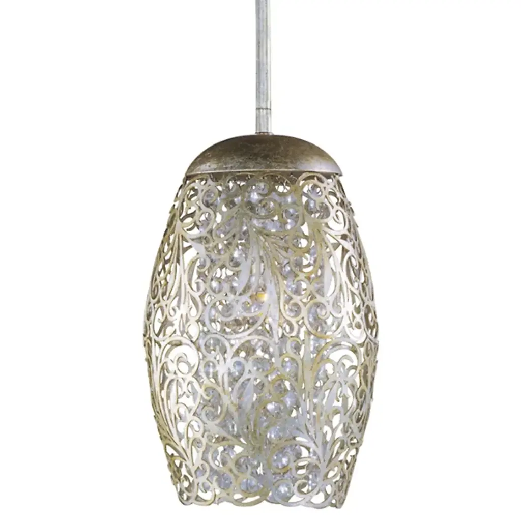 The Maxim Lighting Arabesque Mini Pendant has an exotic design that is really quite mesmerizing. From a distance, the warm shimmer of the dynamic finish catches the eye. Come up close, and the spell is made complete with the intricate, sinuous details of the curved shade and warm sparkle of the beveled crystal strands dangling within.