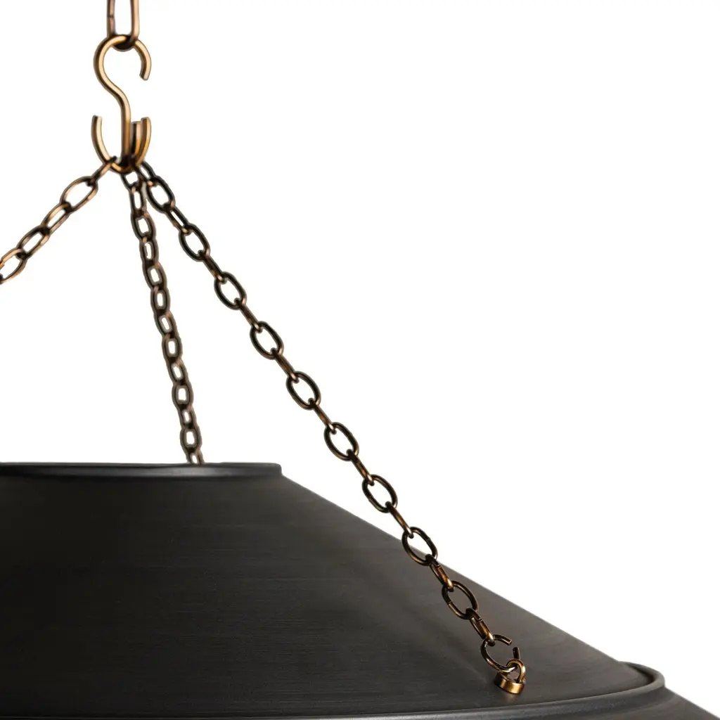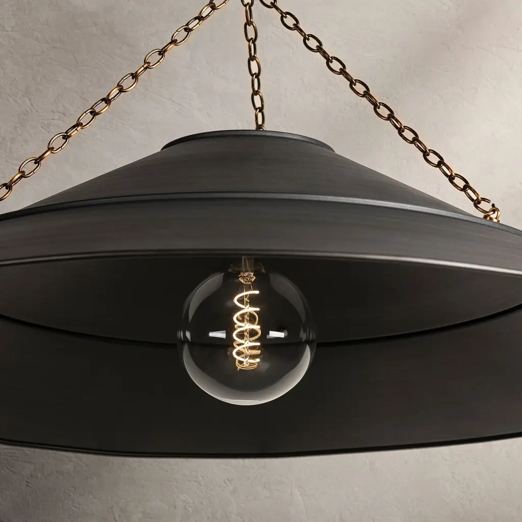 With its exposed metalwork, chain detailing, and unique finish combination, Arcane has an elevated, industrial vibe. The graphite shade feels chic and gives off a warm glow. The Patina Brass hardware, chain, and canopy add a hint of shine that plays wonderfully off the graphite. The twisted black fabric cord is a subtle detail that gives the pendant a vintage feel. Part of our Lauren Liess collection.