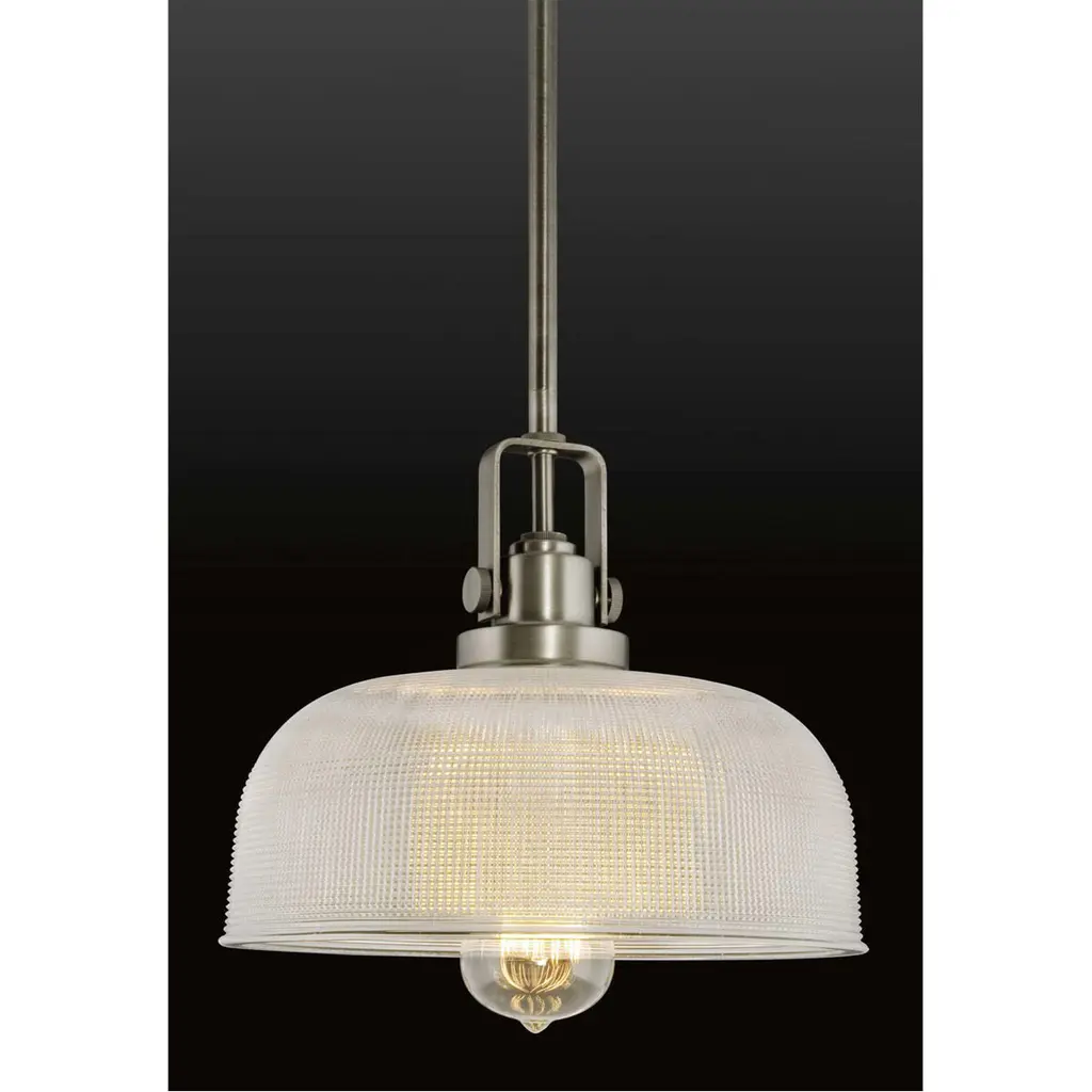 The Archie Collection brings a vintage, industrial flair to interior settings. The collection’s distinctive double prismatic glass adds visual interest as its crisscross pattern comes to life when illuminated. The distinctive finely crafted strap and knob detail adds authentic industrial flair. This one-light pendant is perfect for kitchens, dining rooms, rec room and anywhere pendants could be used. Antique Nickel finish.