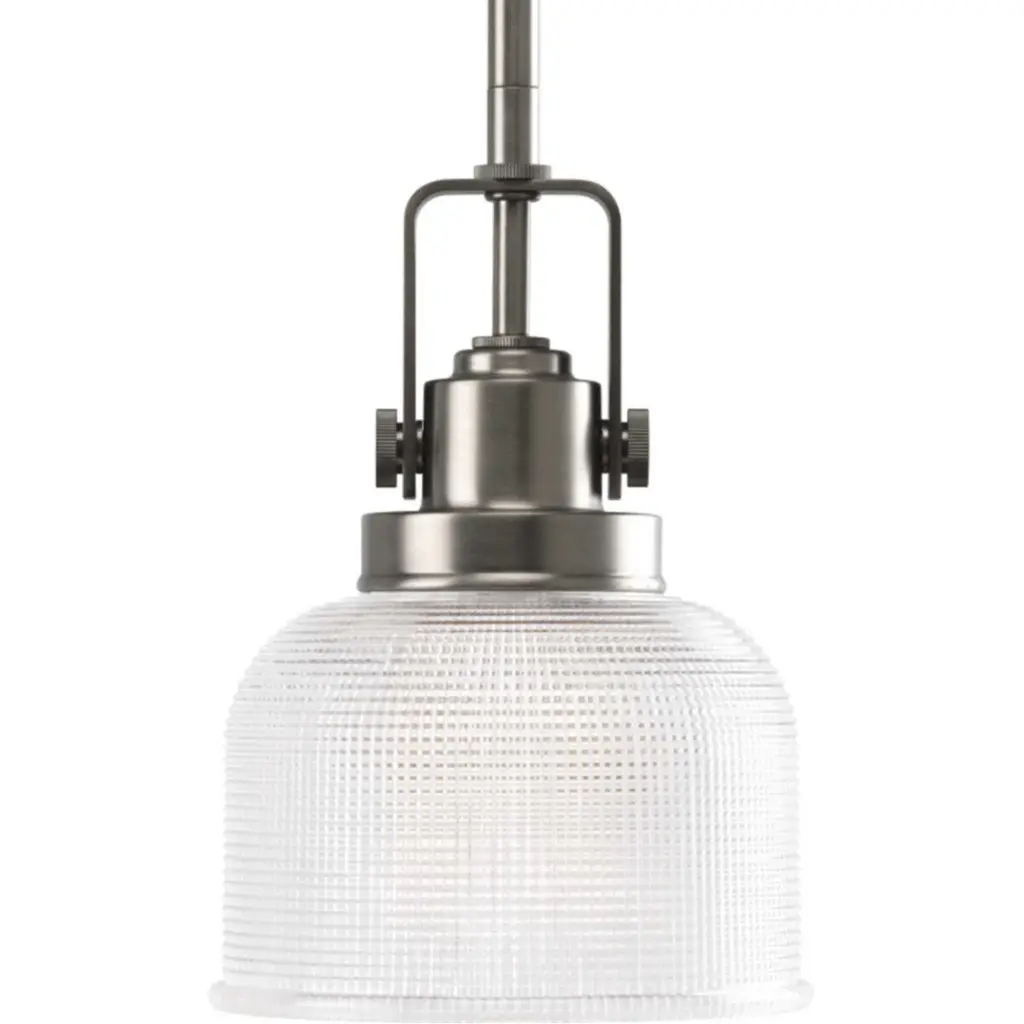 The Archie Collection brings a vintage, industrial flair to interior settings. The collection’s distinctive double prismatic glass adds visual interest as its crisscross pattern comes to life when illuminated. The distinctive finely crafted strap and knob detail adds authentic industrial flair. This one-light mini-pendant is perfect for kitchens, dining rooms, rec room and anywhere pendants could be used. Polished Chrome finish.