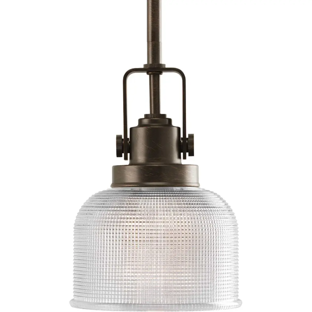 The Archie Collection brings a vintage, industrial flair to interior settings. The collection’s distinctive double prismatic glass adds visual interest as its crisscross pattern comes to life when illuminated. The distinctive finely crafted strap and knob detail adds authentic industrial flair. This one-light mini-pendant is perfect for kitchens, dining rooms, rec room and anywhere pendants could be used. Venetian Bronze finish.