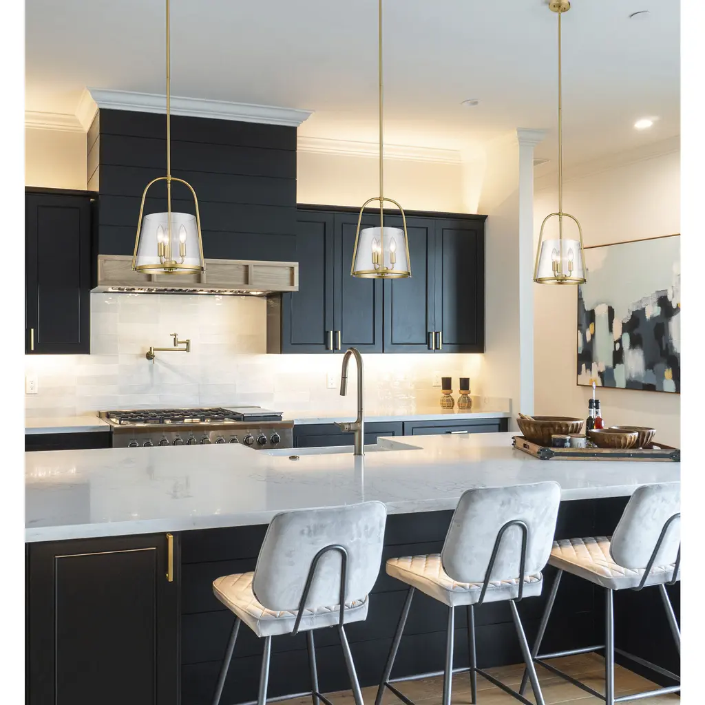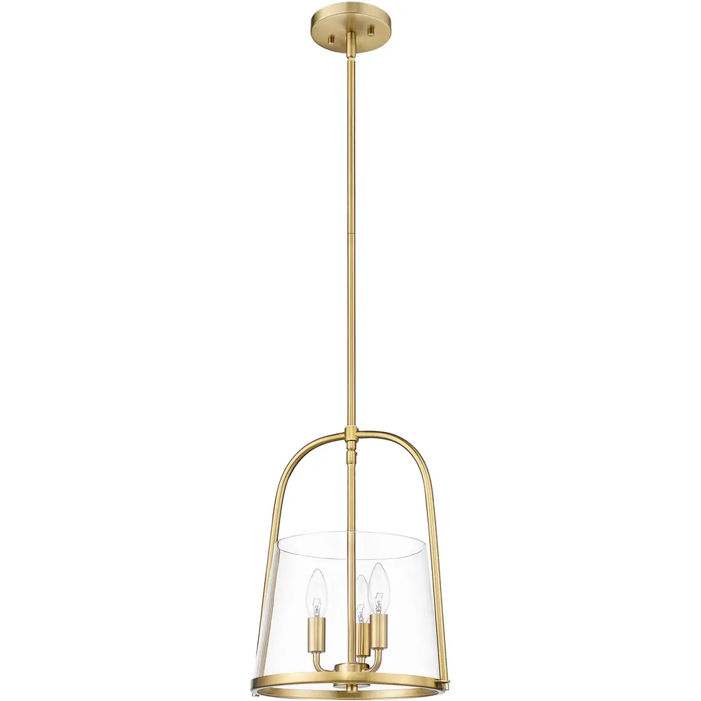 A bit of nautical charm and a decadent mix of materials complement this three-light pendant from the Archis collection, delivering transitional style elements perfect for any space. Framing of modern gold finish steel emulates an open bell silhouette with a romantic clear glass shade positioned at its bottom. Candelabra lamping changes up the mood with a softening effect, making this pendant a superb option for a trending minimalist modern or transitional setting.