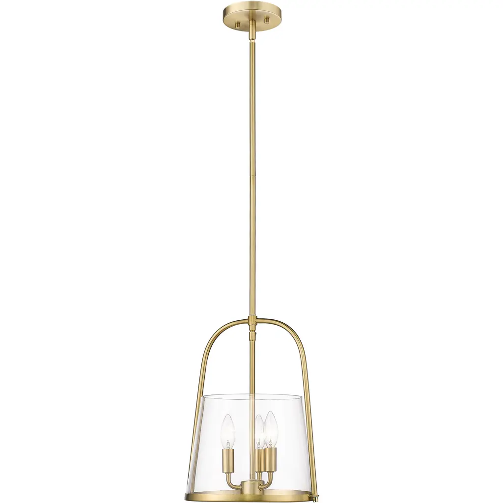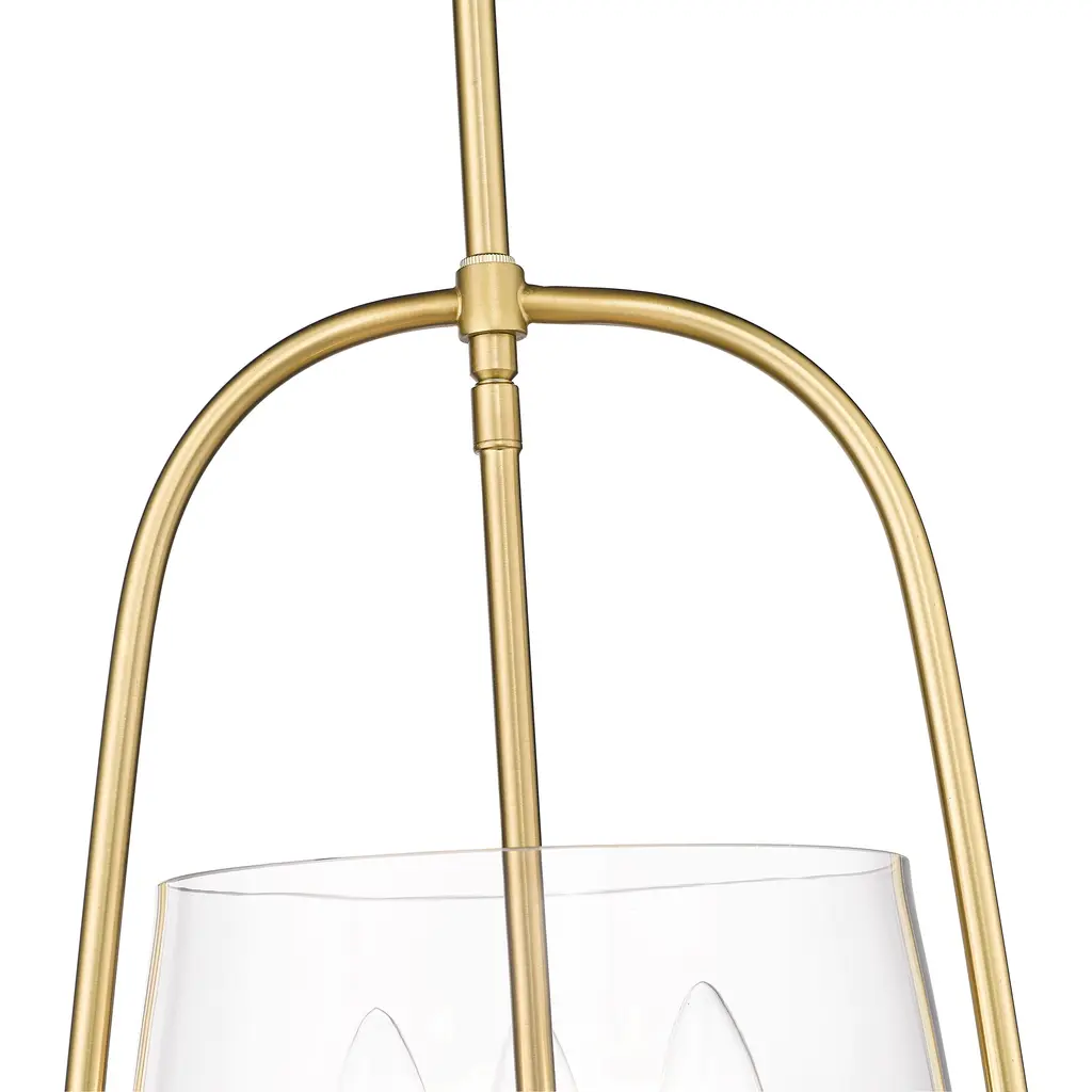 A bit of nautical charm and a decadent mix of materials complement this three-light pendant from the Archis collection, delivering transitional style elements perfect for any space. Framing of modern gold finish steel emulates an open bell silhouette with a romantic clear glass shade positioned at its bottom. Candelabra lamping changes up the mood with a softening effect, making this pendant a superb option for a trending minimalist modern or transitional setting.