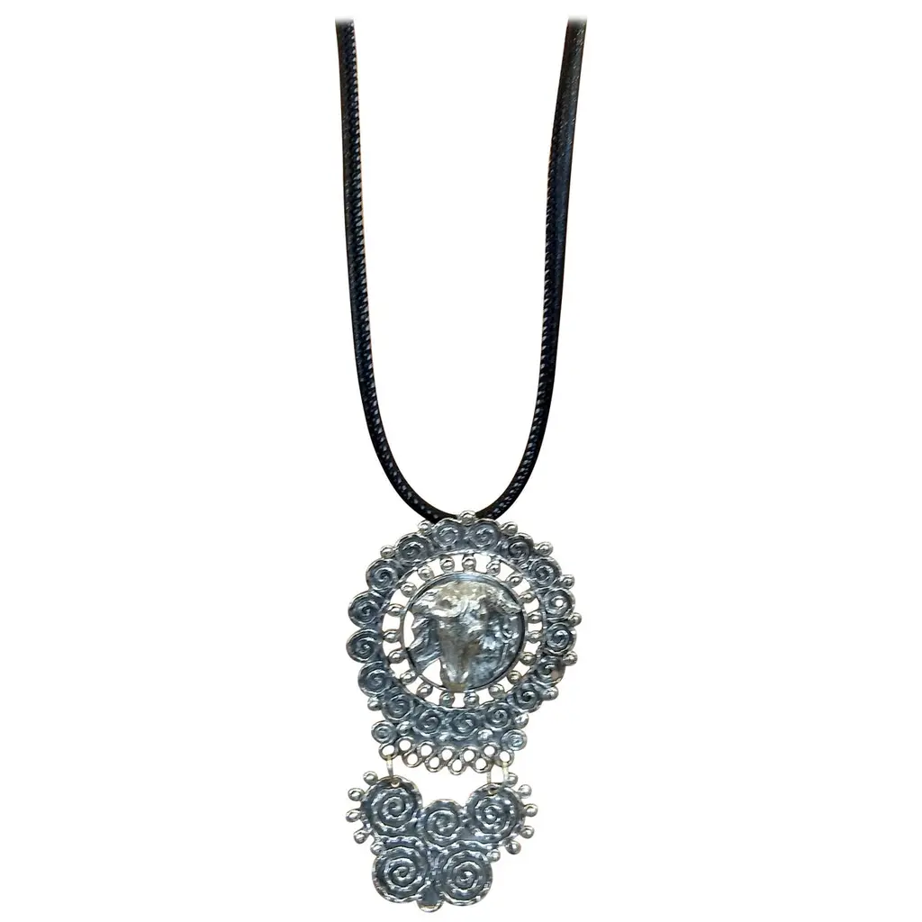 The famous "Masque de Femme" motif reveals the face of a mysterious, elegant woman wearing a headdress of aquatic life, symbolizing the nymph Arethusa. Pendant in silver, motif in clear and black lacquer. Trained as a jeweler at the Ecole des Arts Decoratifs in Paris in the late 1880's, Rene Lalique gained recognition as an independent designer for some of the era's great jewelry houses including Cartier and Boucheron. Eventually, he turned to glassmaking, and his techniques were a triumph for the Art Deco movement. Every piece of Lalique is finely detailed and produced by hand in Alsace, France.