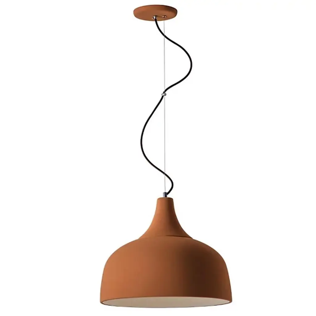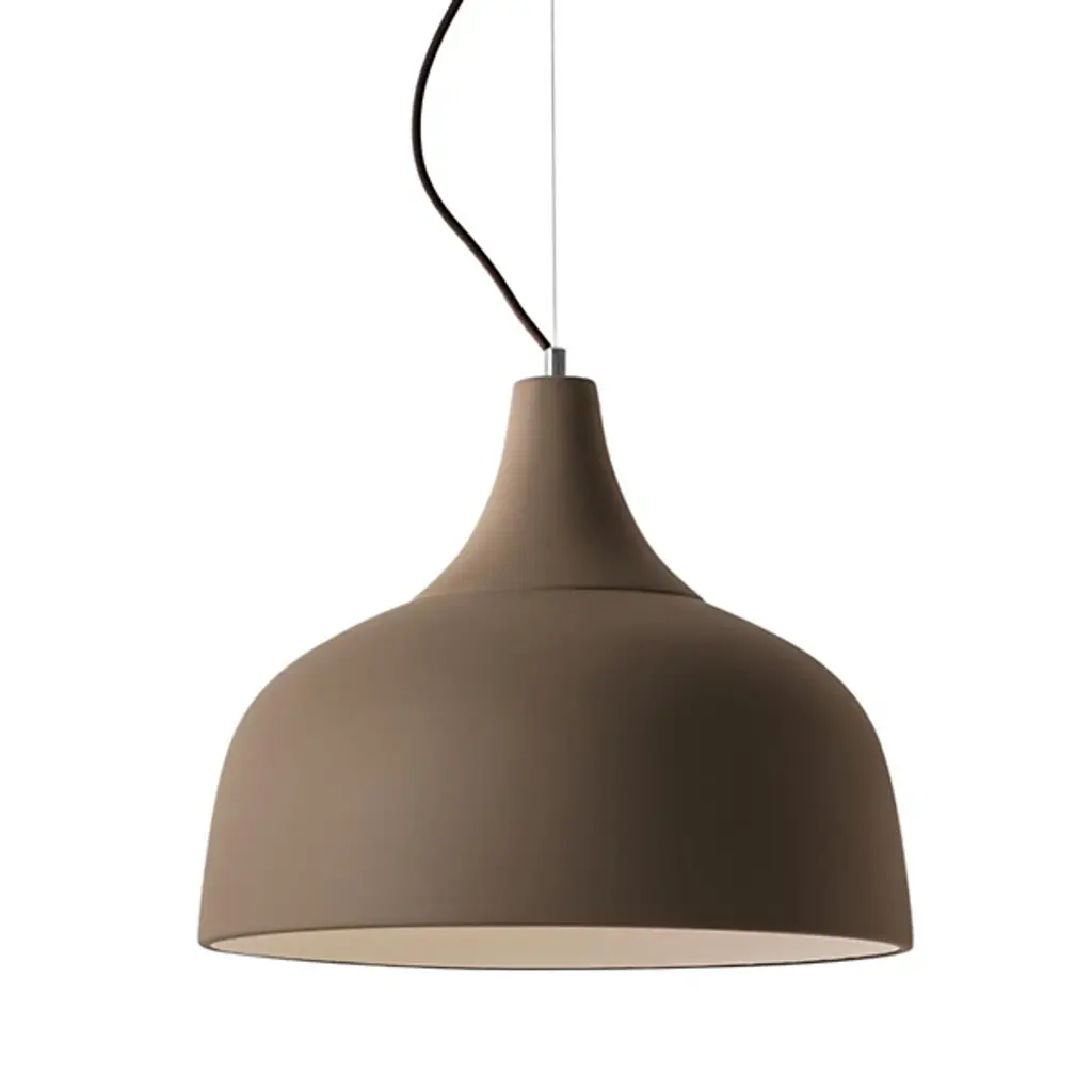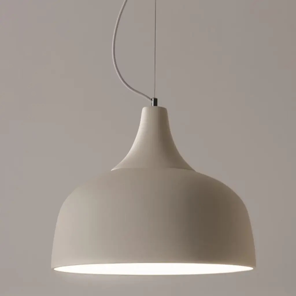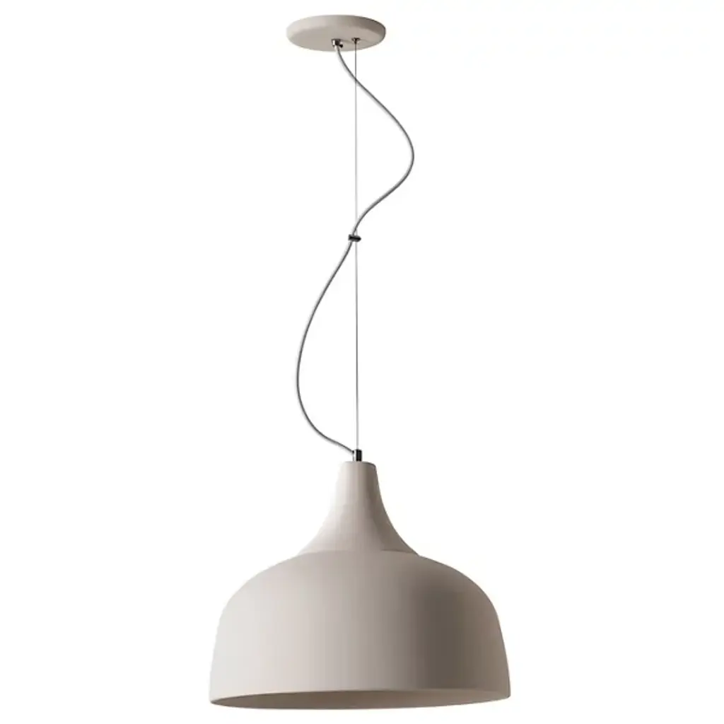 The Arezzo Pendant from Geo Contemporary reimagines overhead lighting as a ceramic canvas. This suspended masterpiece flaunts a generously proportioned bell-shaped shade. Its smooth, matte exterior hints at the skilled hands that molded it, while the gently flared rim adds a subtle dynamism to its profile. The pendant hangs from an aircraft cable suspension and fabric cord, contrasting beautifully with its substantial form. The Arezzo Pendant's understated hue allows it to harmonize with various color schemes, making it an ideal addition to any room seeking quiet luxury.