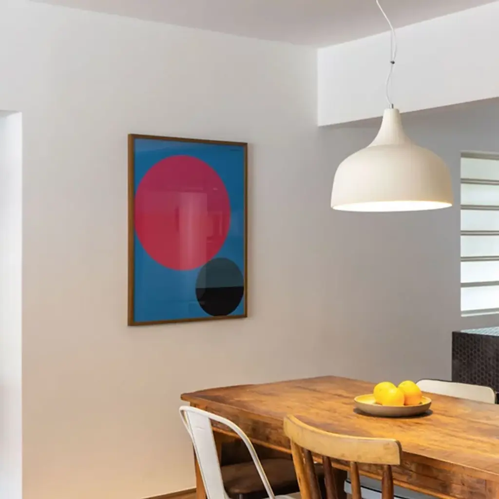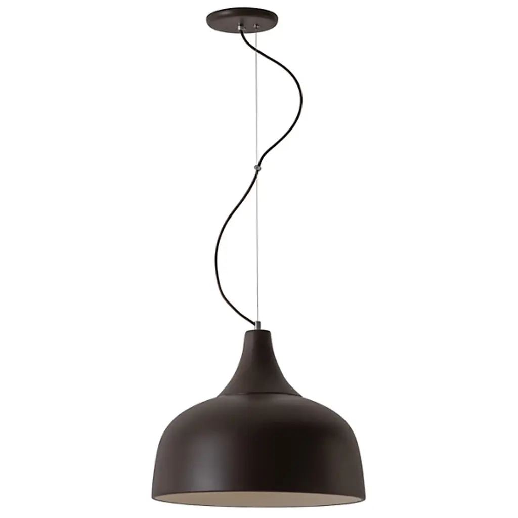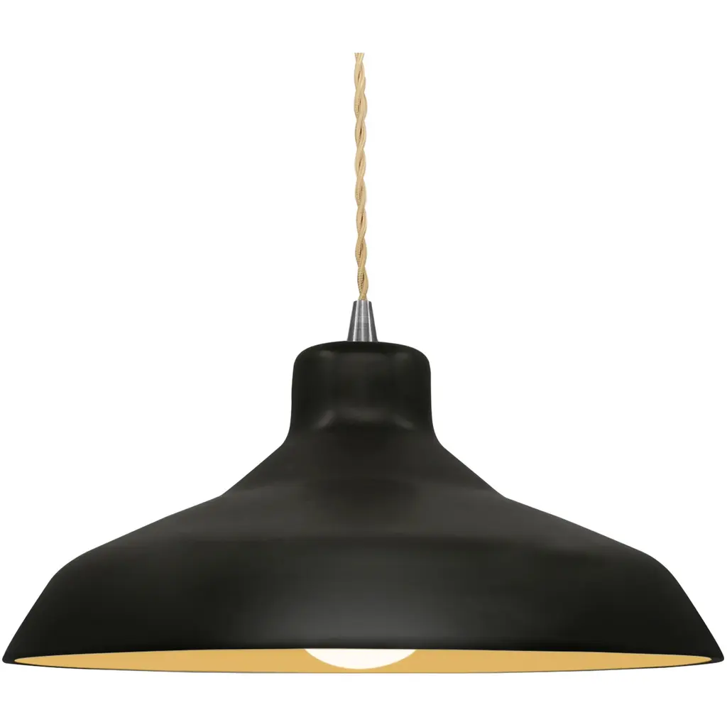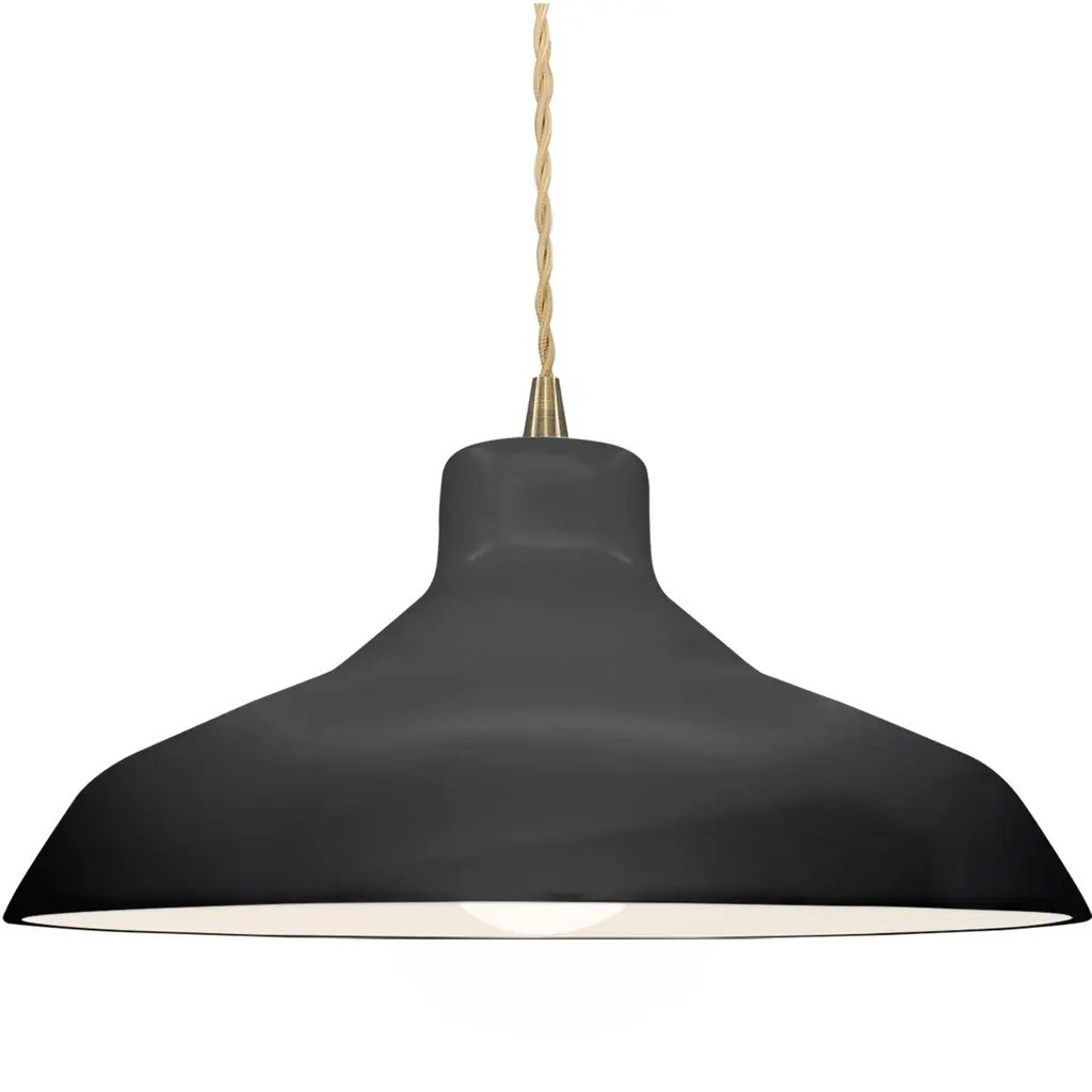 The Arezzo Pendant from Geo Contemporary reimagines overhead lighting as a ceramic canvas. This suspended masterpiece flaunts a generously proportioned bell-shaped shade. Its smooth, matte exterior hints at the skilled hands that molded it, while the gently flared rim adds a subtle dynamism to its profile. The pendant hangs from an aircraft cable suspension and fabric cord, contrasting beautifully with its substantial form. The Arezzo Pendant's understated hue allows it to harmonize with various color schemes, making it an ideal addition to any room seeking quiet luxury.