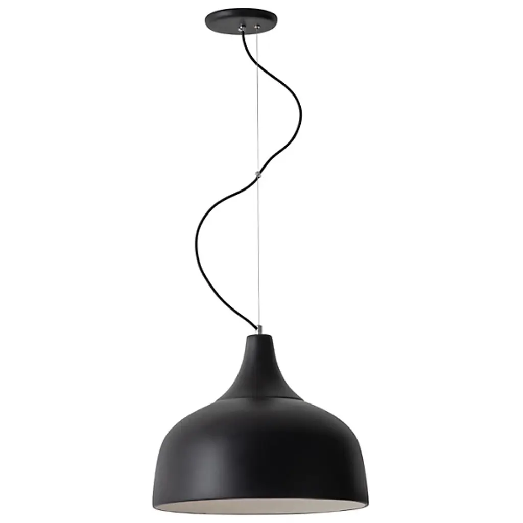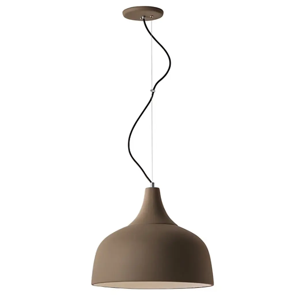 The Arezzo Pendant from Geo Contemporary reimagines overhead lighting as a ceramic canvas. This suspended masterpiece flaunts a generously proportioned bell-shaped shade. Its smooth, matte exterior hints at the skilled hands that molded it, while the gently flared rim adds a subtle dynamism to its profile. The pendant hangs from an aircraft cable suspension and fabric cord, contrasting beautifully with its substantial form. The Arezzo Pendant's understated hue allows it to harmonize with various color schemes, making it an ideal addition to any room seeking quiet luxury.