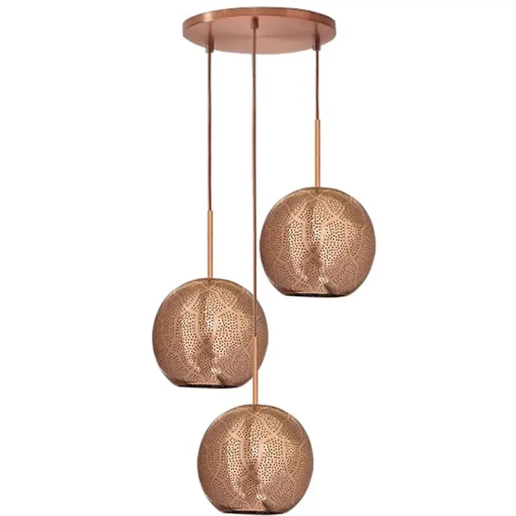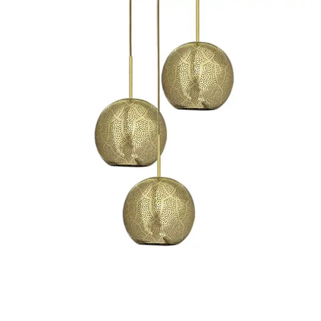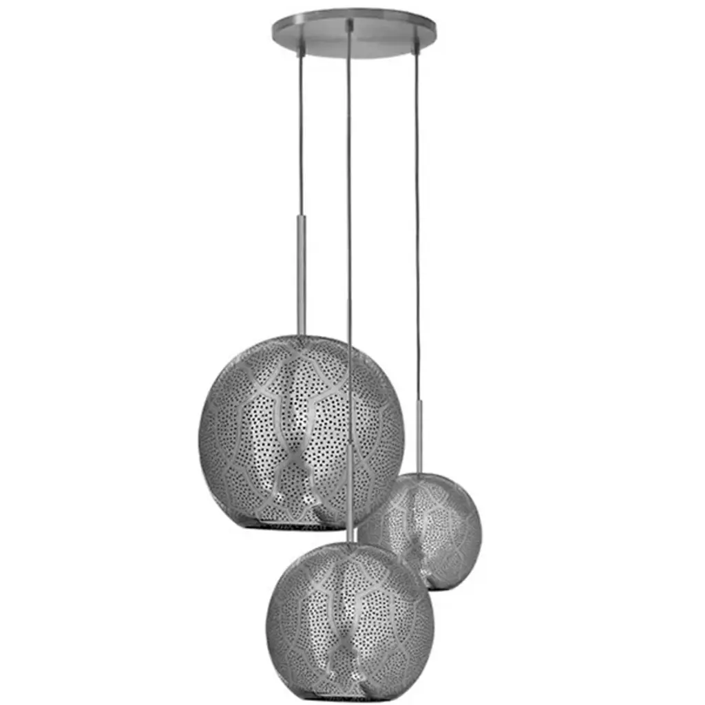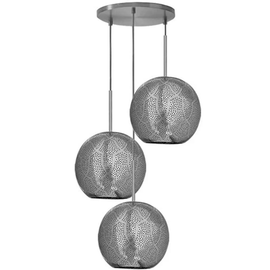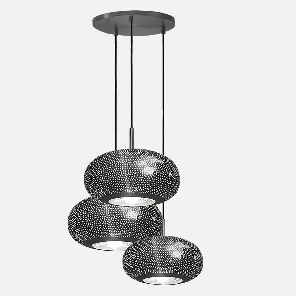 Presented by Dounia Home, the Aria Multi Light Pendant is a luxurious light furnishing with contemporary style fused with classic finishing touches. Each of the decorative perforated shades allows gorgeous light to flow through for a truly enchanting effect. It boasts eco-friendly appeal and artisan-quality craftsmanship. LED illumination offers a long lifespan and low energy consumption. It was handmade in Morocco by ethically compensated Artisans, and each piece at Dounia is made in a small batch for supreme quality.