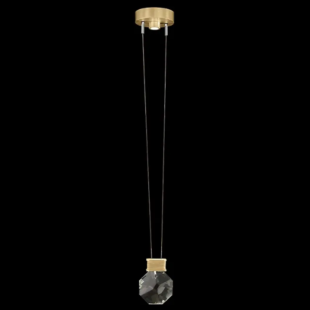 Skillfully designed, the Aria Octagon LED Mini Pendant from Fine Art Handcrafted Lighting hangs gracefully from a circular wall plate, supported by a slender yet robust cable, offering adjustable height reminiscent of the sophistication of necklace charms. Each detail is meticulously fashioned, showcasing a small banded accent adorned with an opulent faceted optic crystal charm that gleams like precious gems, captivating attention with its radiant allure. Whether you desire the soft, reflective glow of light streaming through the crystal or the functional illumination it provides, the integrated LED lights cater to your lighting preferences with elegant aplomb. Combining elements of Artisanal Modern and Transitional styles, this pendant brings an elegant touch to any space.