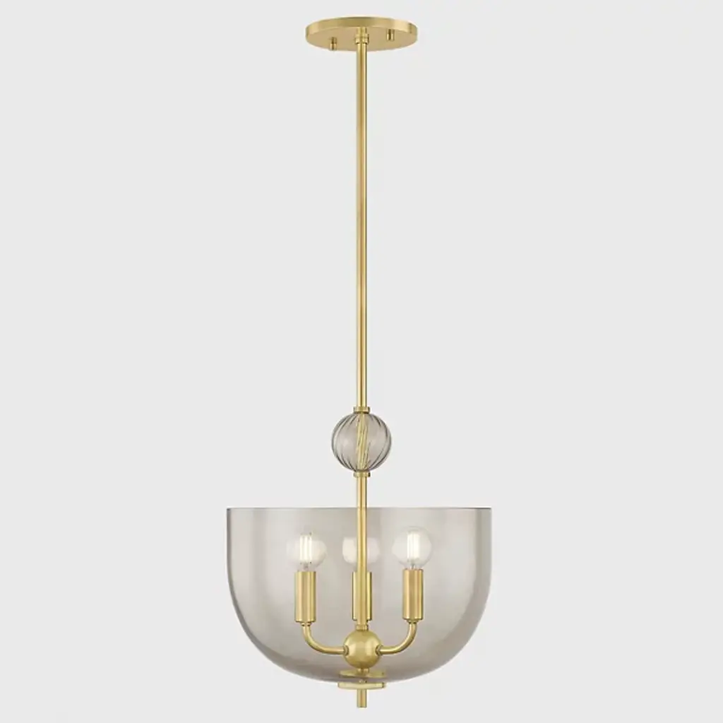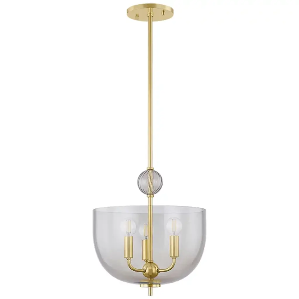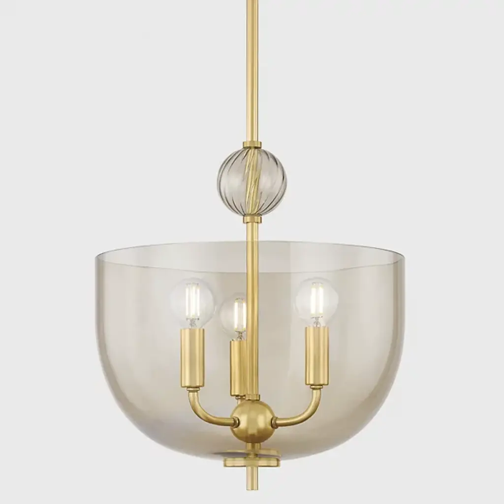 The 1920s gain a new lease on life with the Arianne Pendant from Mitzi, updating older features mixed with glass and circular forms and an upturned dome silhouette that defines its unique character. Decorative ribbed glass enhanced by metal baubles threaded onto metal stems enhances the pendant’s playful design. The plated bronze glass and aged brass-finished steel frame combine to create a warm, golden light as the light reflects, creating a light, transitional \character. Its glass and steel construction and candelabra-based lamping ensure a sophisticated yet whimsical appeal.
