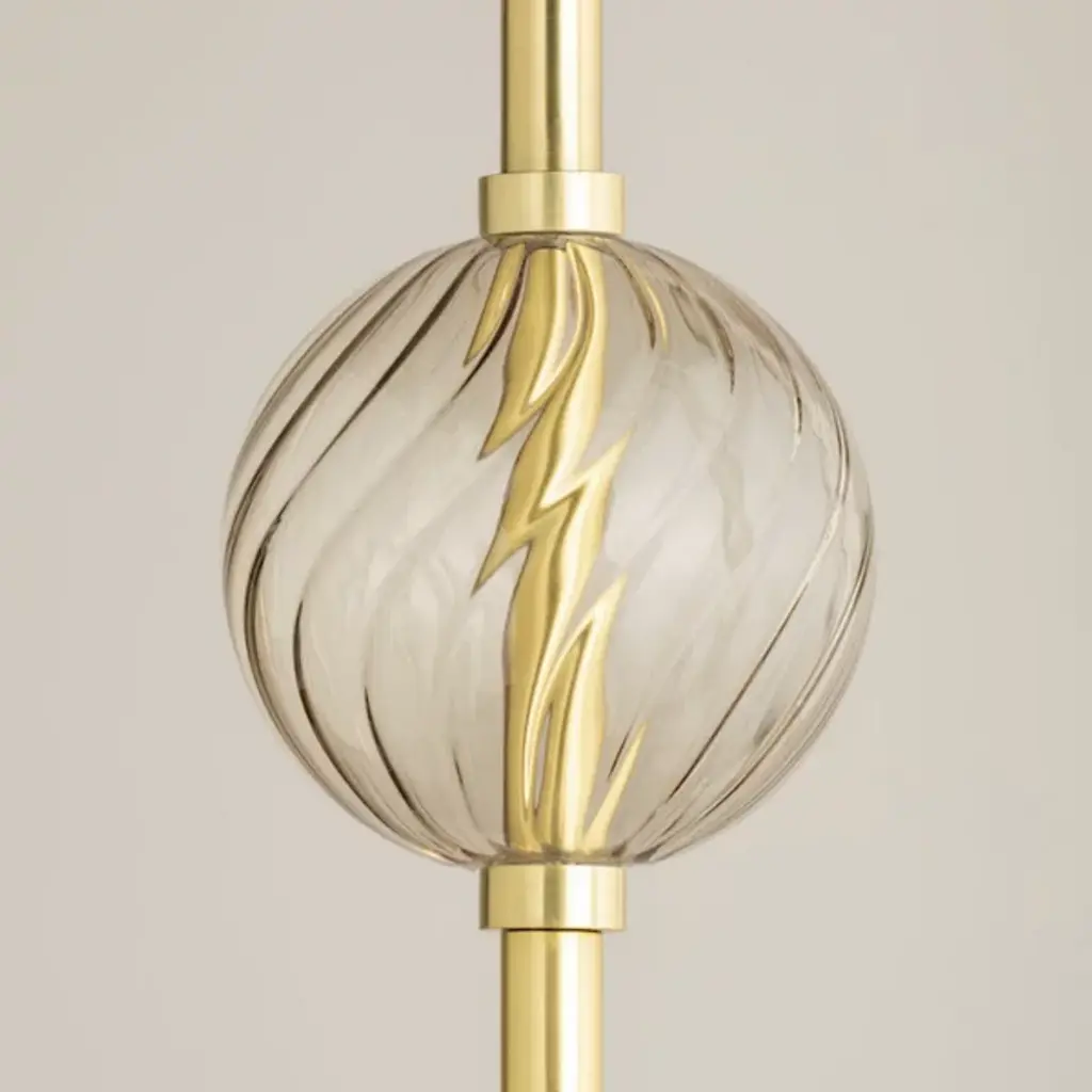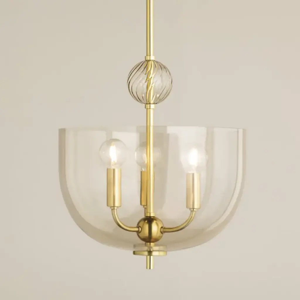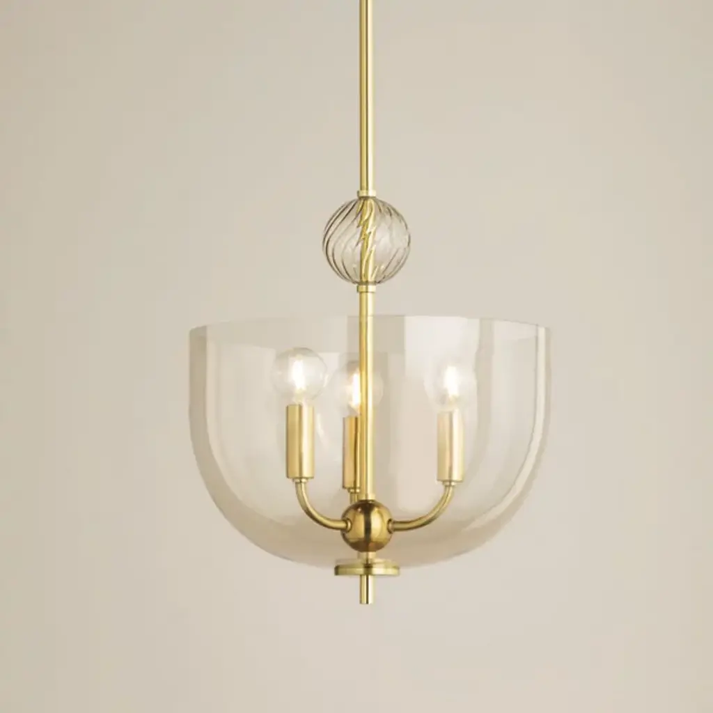 The 1920s gain a new lease on life with the Arianne Pendant from Mitzi, updating older features mixed with glass and circular forms and an upturned dome silhouette that defines its unique character. Decorative ribbed glass enhanced by metal baubles threaded onto metal stems enhances the pendant’s playful design. The plated bronze glass and aged brass-finished steel frame combine to create a warm, golden light as the light reflects, creating a light, transitional \character. Its glass and steel construction and candelabra-based lamping ensure a sophisticated yet whimsical appeal.