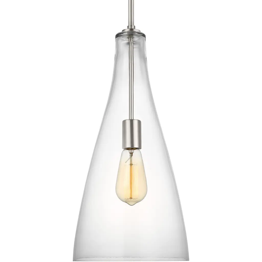 The Arilda one light indoor pendant in brushed nickel is the perfect way to achieve your desired fashion or functional needs in your home. The Arilda one-light pendant collection from springs to life with the fine artistry and technique of hand-blown glass. Spindle-inspired Clear glass shades give dimension and character to these traditional pendant lights. Paired with Edison-style bulbs, this pendant is a period-inspired classic to complement a wide range of decor from Colonial to nautical to rich, European inspired settings. Available in two hardware finishes, Heirloom Bronze and Brushed Nickel, Arilda pendants may be installed as single pendants or clustered in multiples, which would be an ideal installation used for entry lighting, dining room lighting, living room lighting or kitchen lighting over a table.
