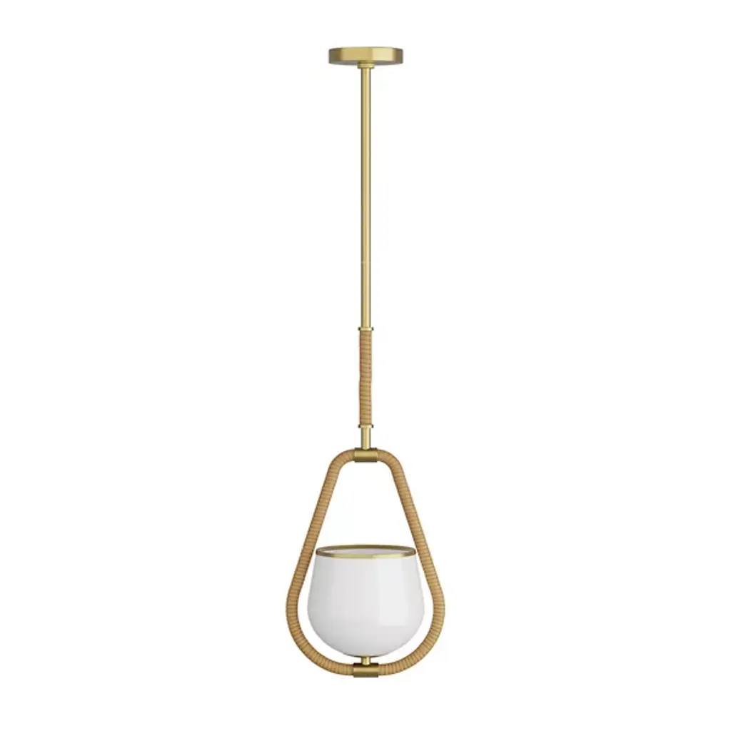 The Arlie Pendant from Arteriors draws design inspiration from the equestrian stirrup. Crafted with natural rattan, this pendant forms a graceful profile, enveloping a refined bowl of opal glass. The marriage of these materials creates a transitional sense of style. Suspended by a downrod attached to a ceiling canopy, Arlie adds an elegant touch to your décor. Illuminate your surroundings with the gentle glow of LEDs, dimmable when paired with a separately sold ELV dimmer.