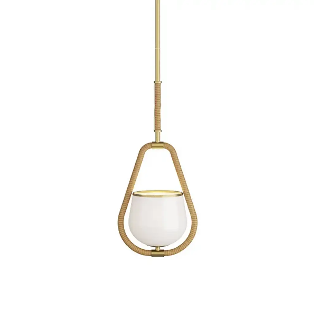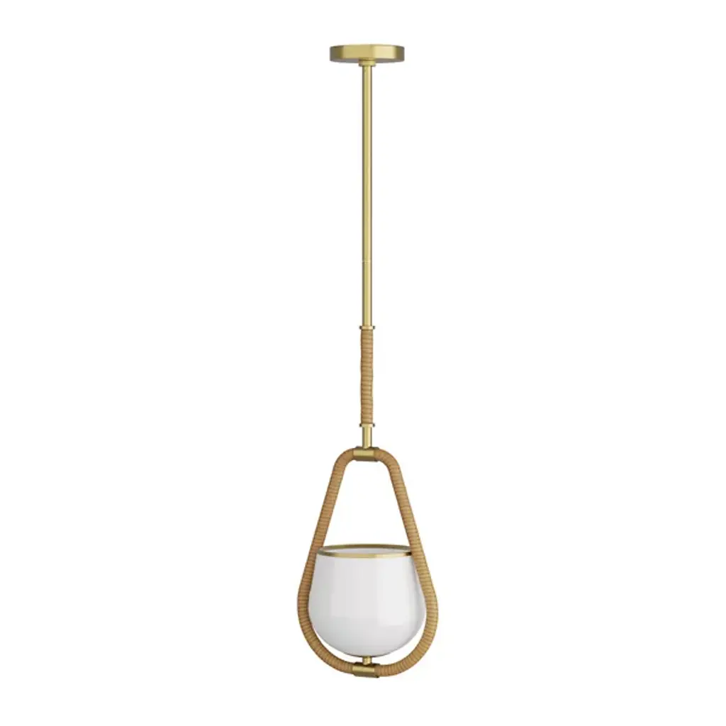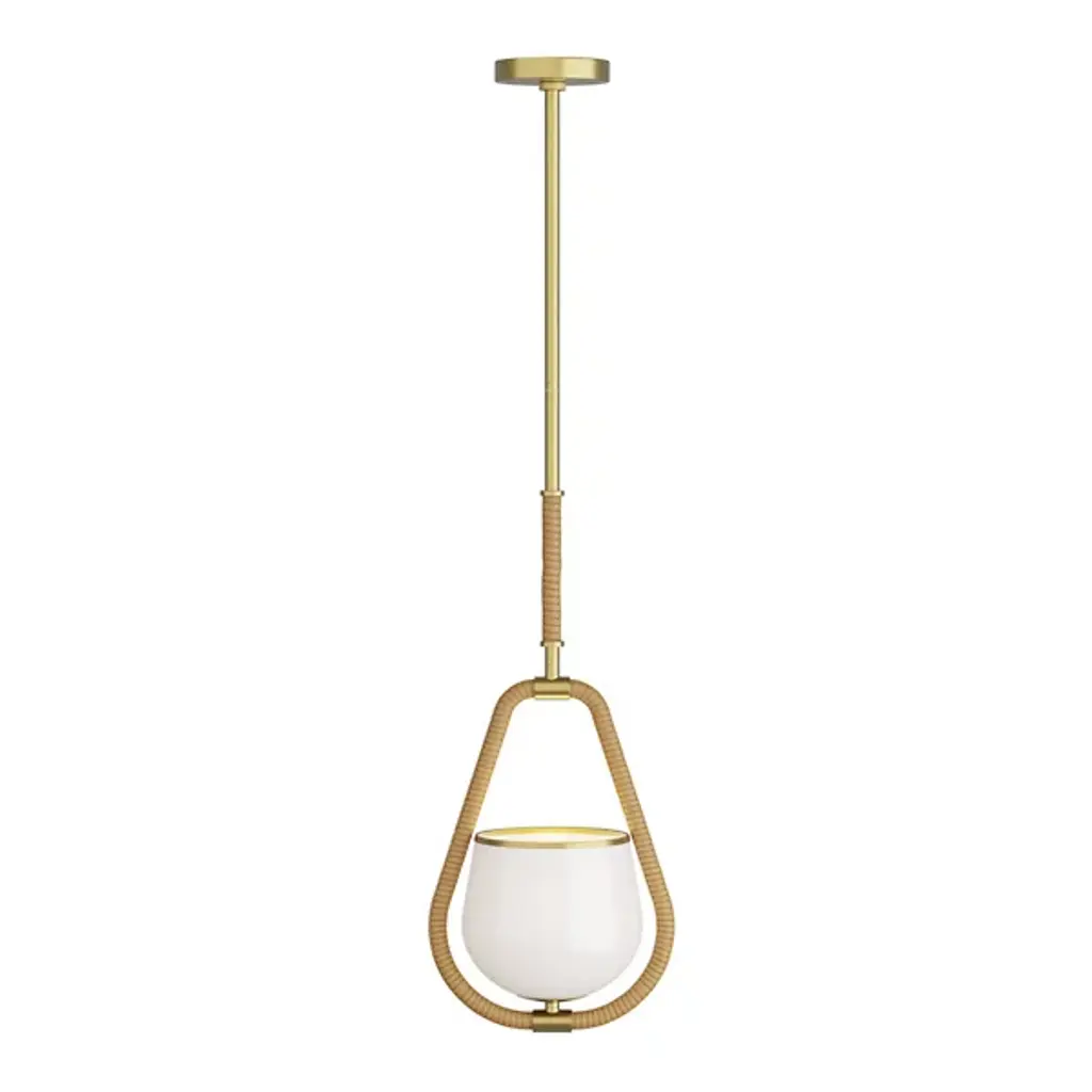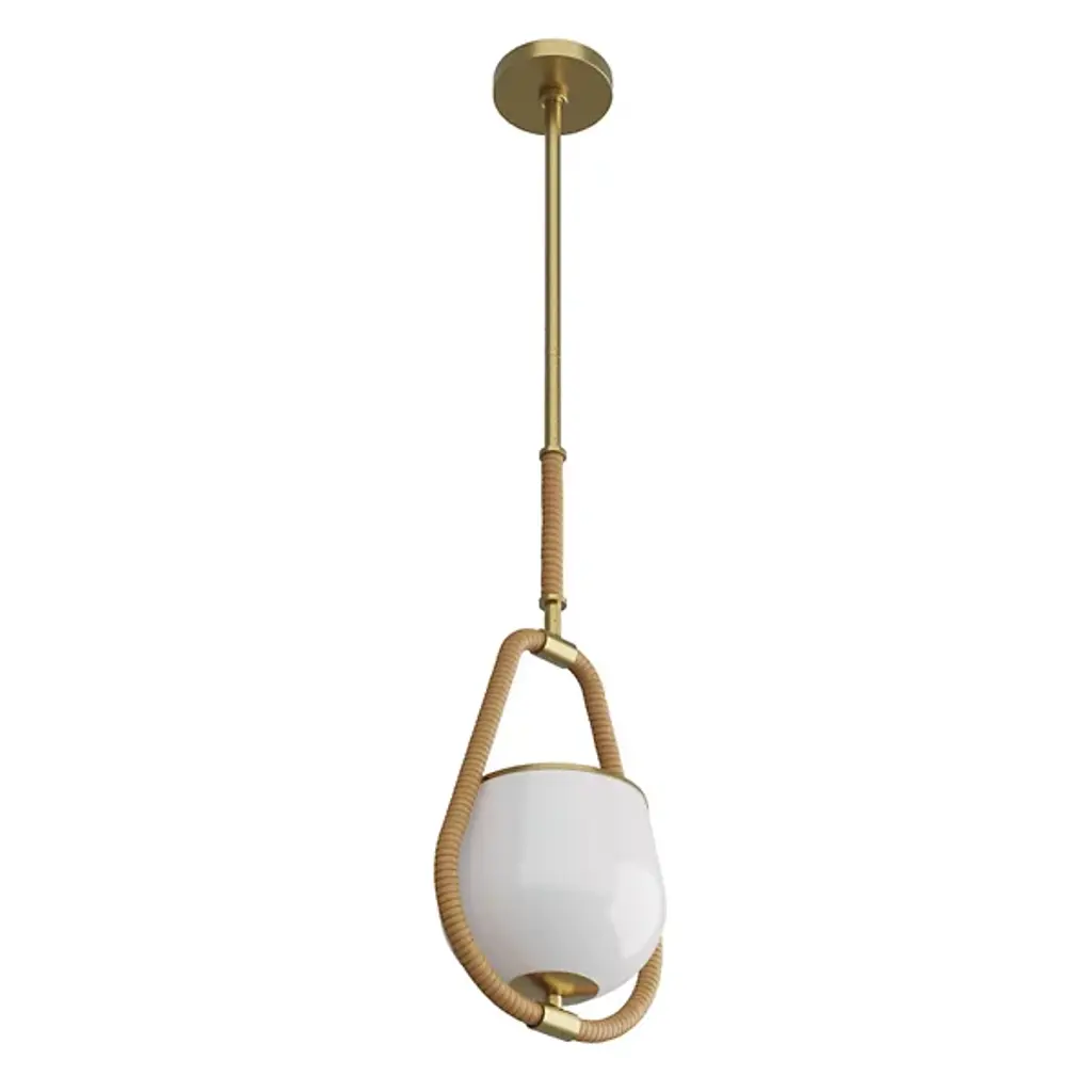 The Arlie Pendant from Arteriors draws design inspiration from the equestrian stirrup. Crafted with natural rattan, this pendant forms a graceful profile, enveloping a refined bowl of opal glass. The marriage of these materials creates a transitional sense of style. Suspended by a downrod attached to a ceiling canopy, Arlie adds an elegant touch to your décor. Illuminate your surroundings with the gentle glow of LEDs, dimmable when paired with a separately sold ELV dimmer.