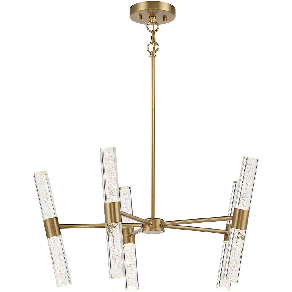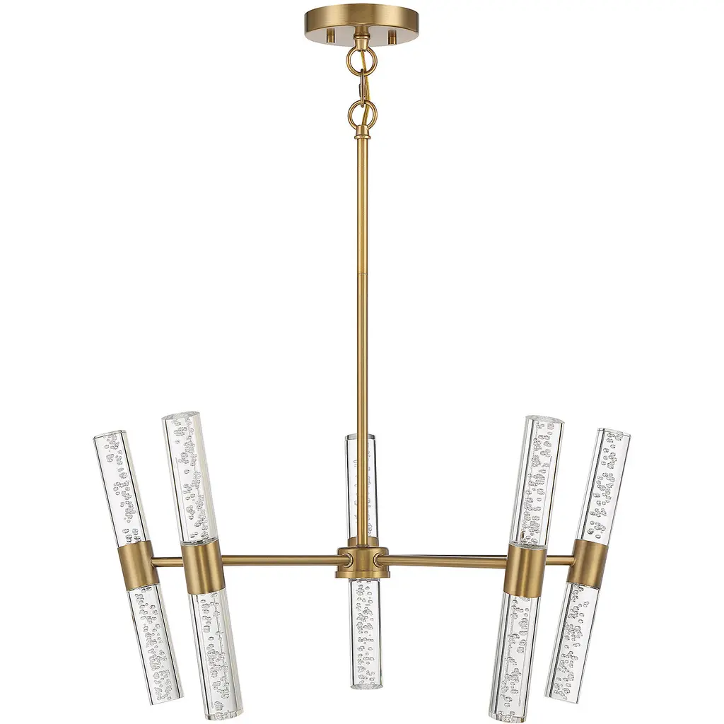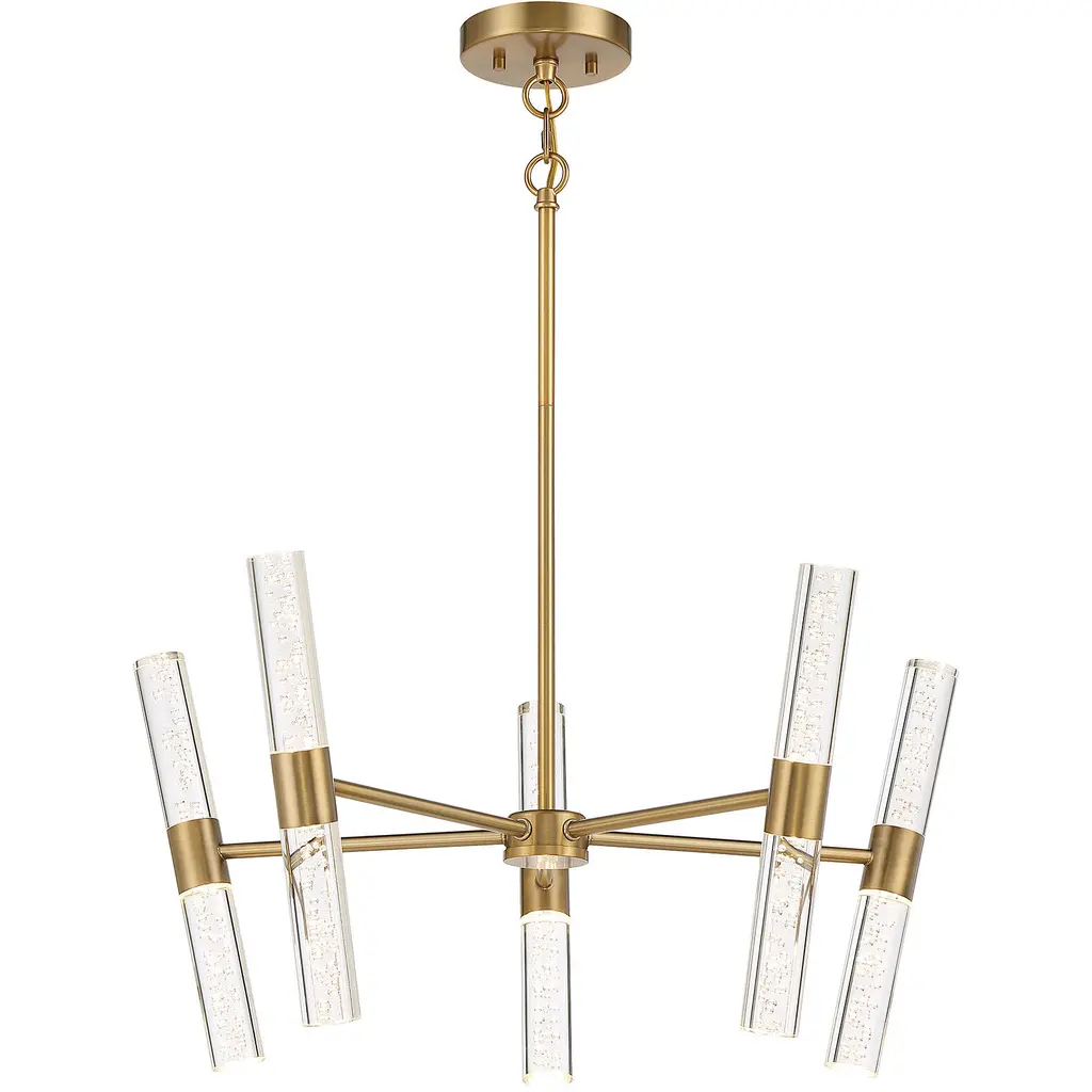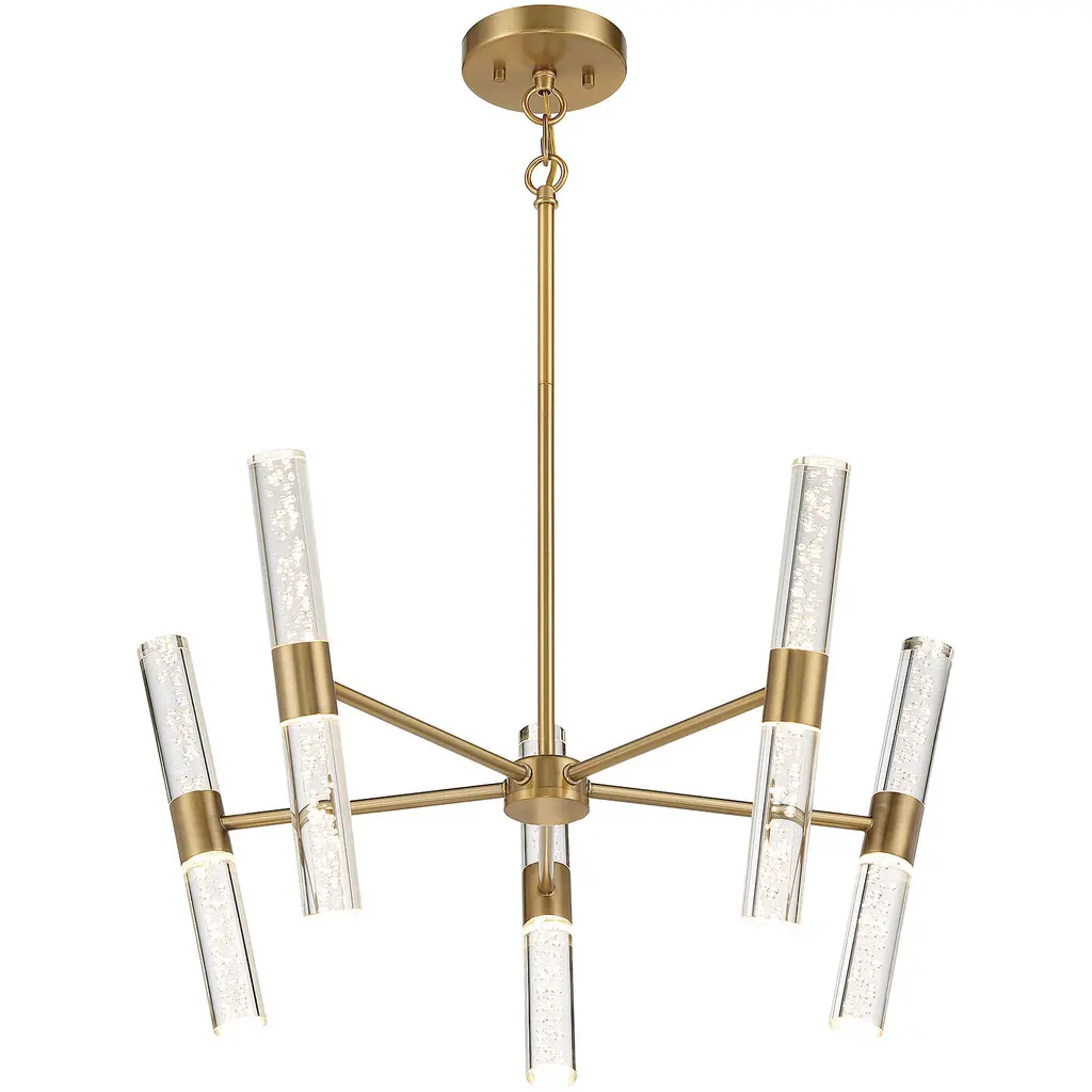 Let your lighting become the centerpiece of your room. The simply stunning Savoy House Arlon 10-light pendant makes that possible Five arms, each topped with two wands of clear bubble glass, emerge from a central hub. The glass is illuminated from within by integrated LED light for an uninterrupted look. Warm brass finish. Arlon is 26" in diameter and has an adjustable height ranging from 23" to 77". Comes with four 12" downrods and one 6" downrod, plus 80" of cord.