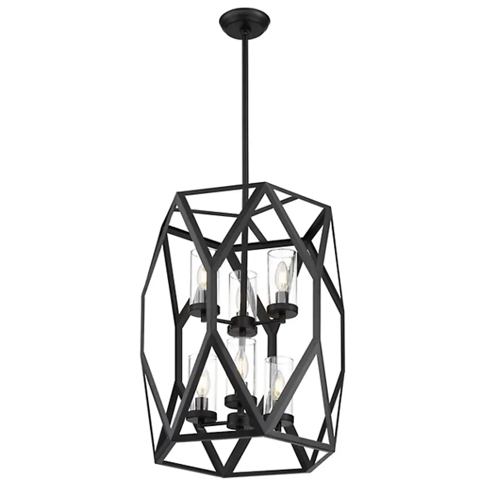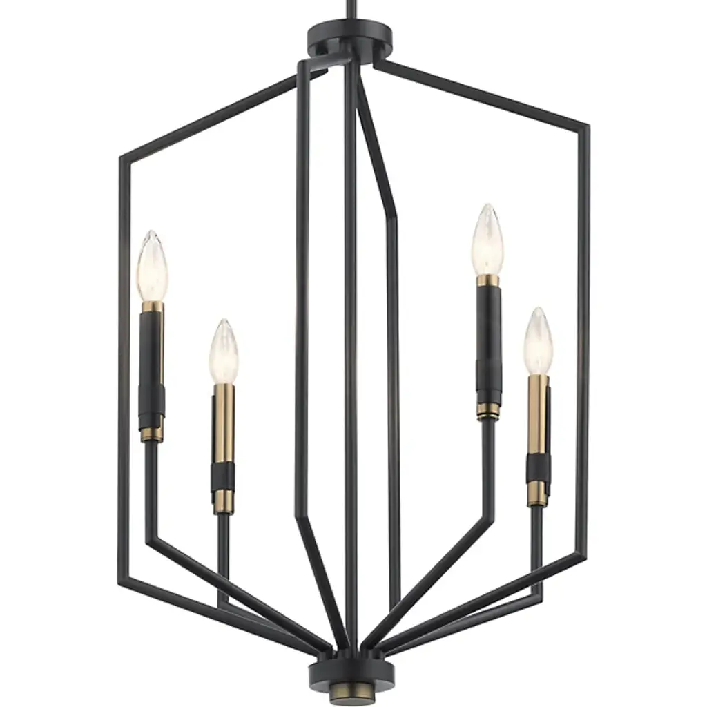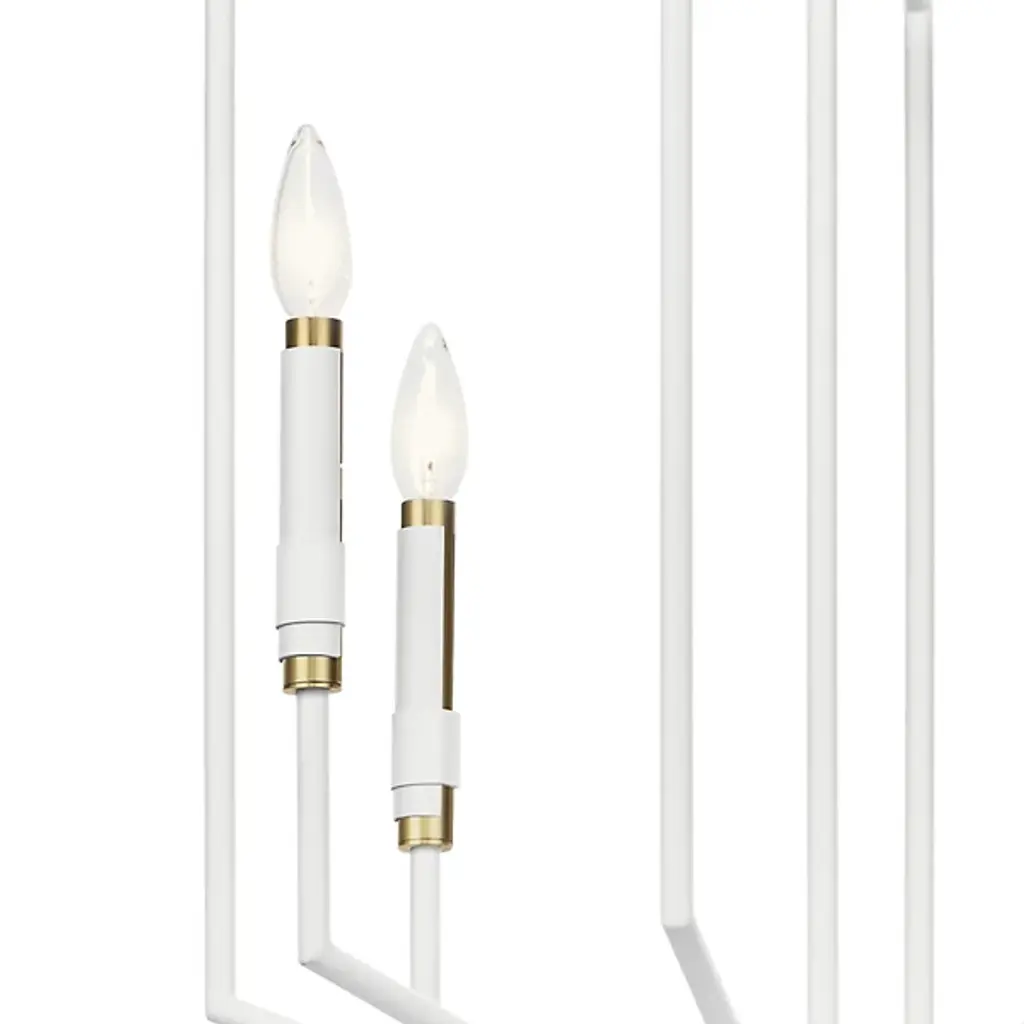 The Armand Pendant from Kichler is an attractive contemporary design taking a page from the world of high style in its accenting. The pendant dresses up the room either on its own or in series. The pendant creates a graphical image in the air with a fine steel framework. The crossing geometric framework lets the eyes peek through to the other side in a pleasantly open design. From the base, slender arms shoot out in eye-catching angles. The pendant shows its stylish side as faux leather wraps the candle-style holders. With candelabra bulbs topping the holders, the piece delivers a warm, radiant light with an airy feel.