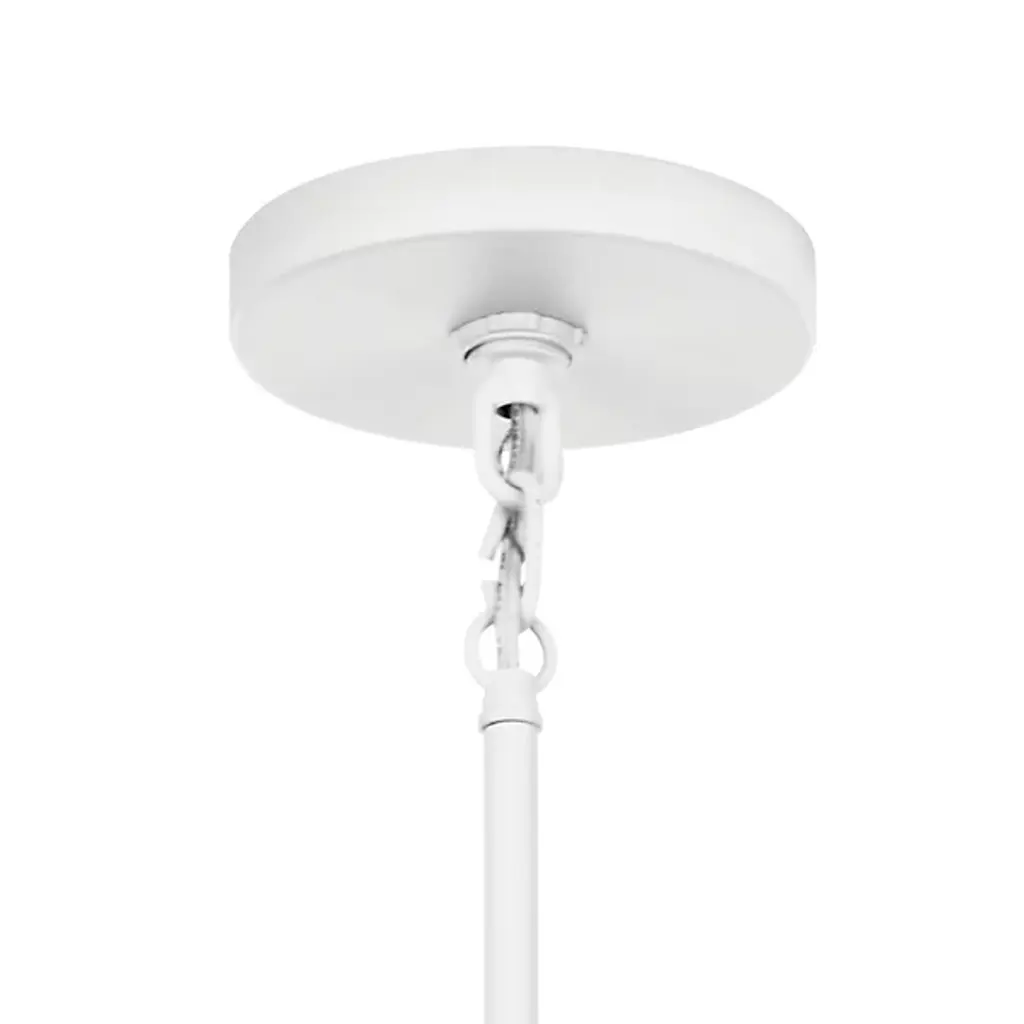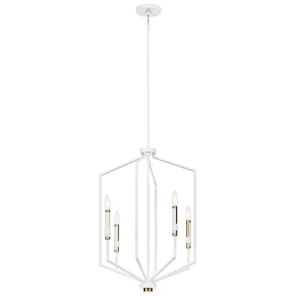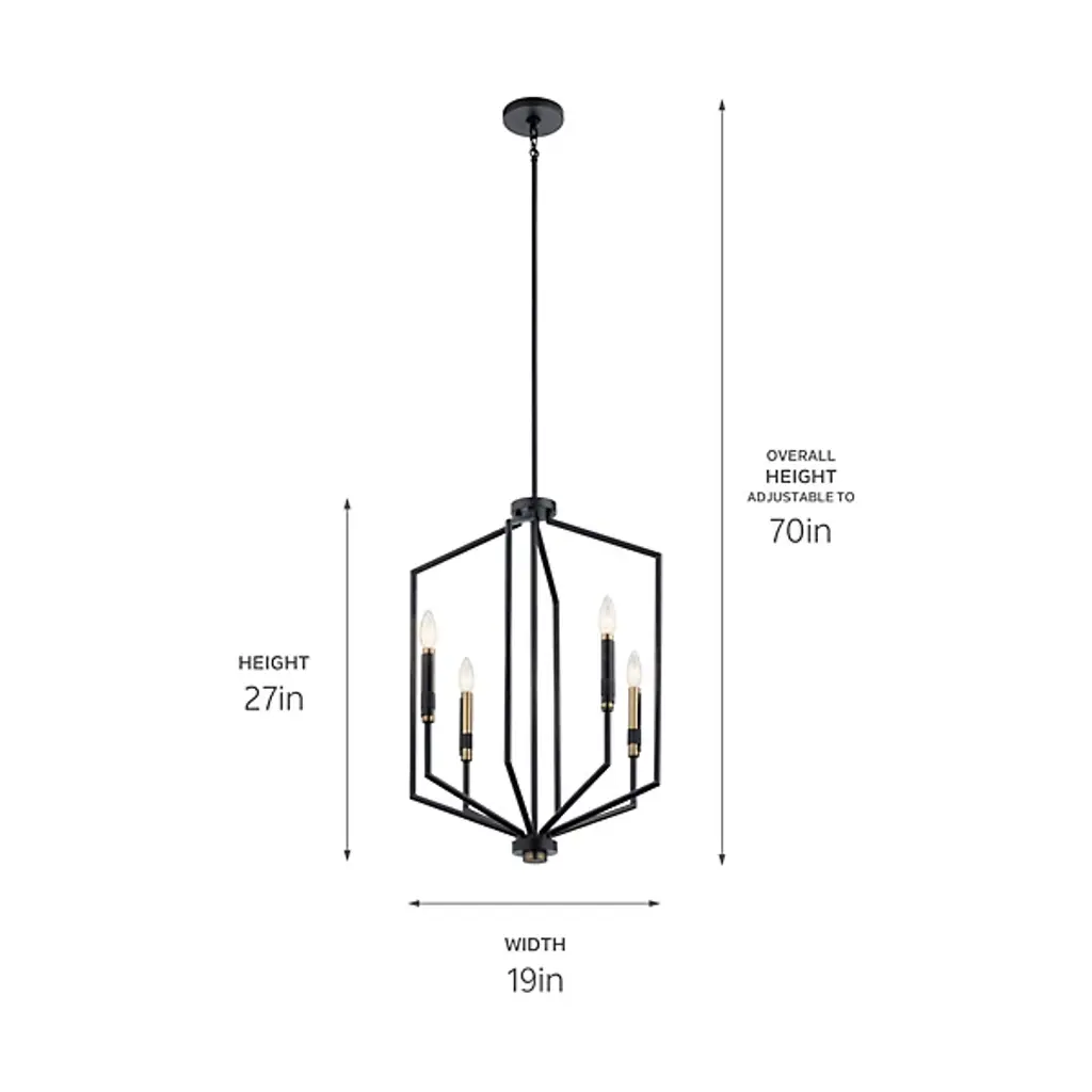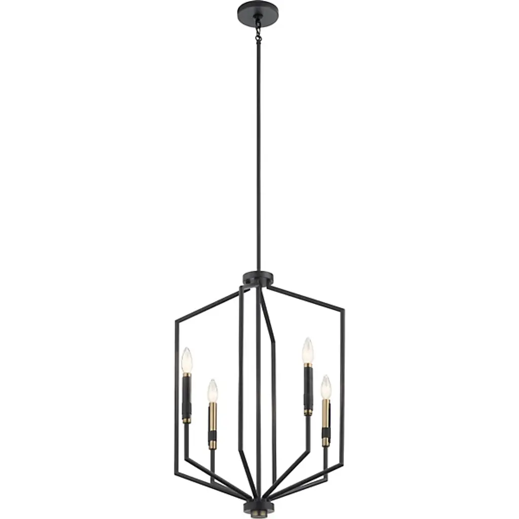 The Armand Pendant from Kichler is an attractive contemporary design taking a page from the world of high style in its accenting. The pendant dresses up the room either on its own or in series. The pendant creates a graphical image in the air with a fine steel framework. The crossing geometric framework lets the eyes peek through to the other side in a pleasantly open design. From the base, slender arms shoot out in eye-catching angles. The pendant shows its stylish side as faux leather wraps the candle-style holders. With candelabra bulbs topping the holders, the piece delivers a warm, radiant light with an airy feel.