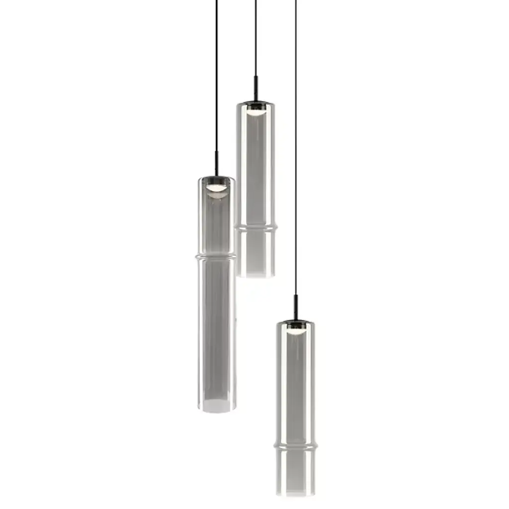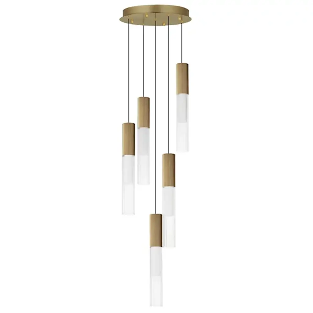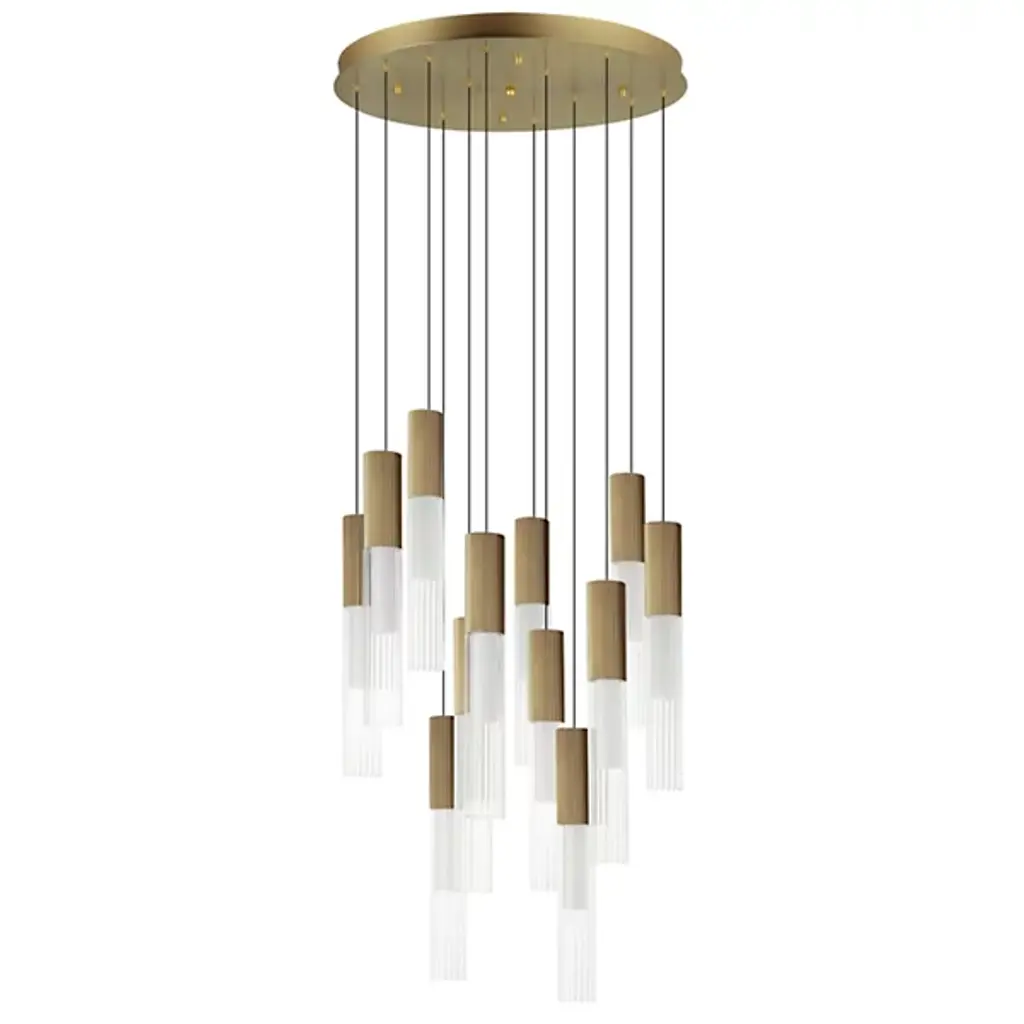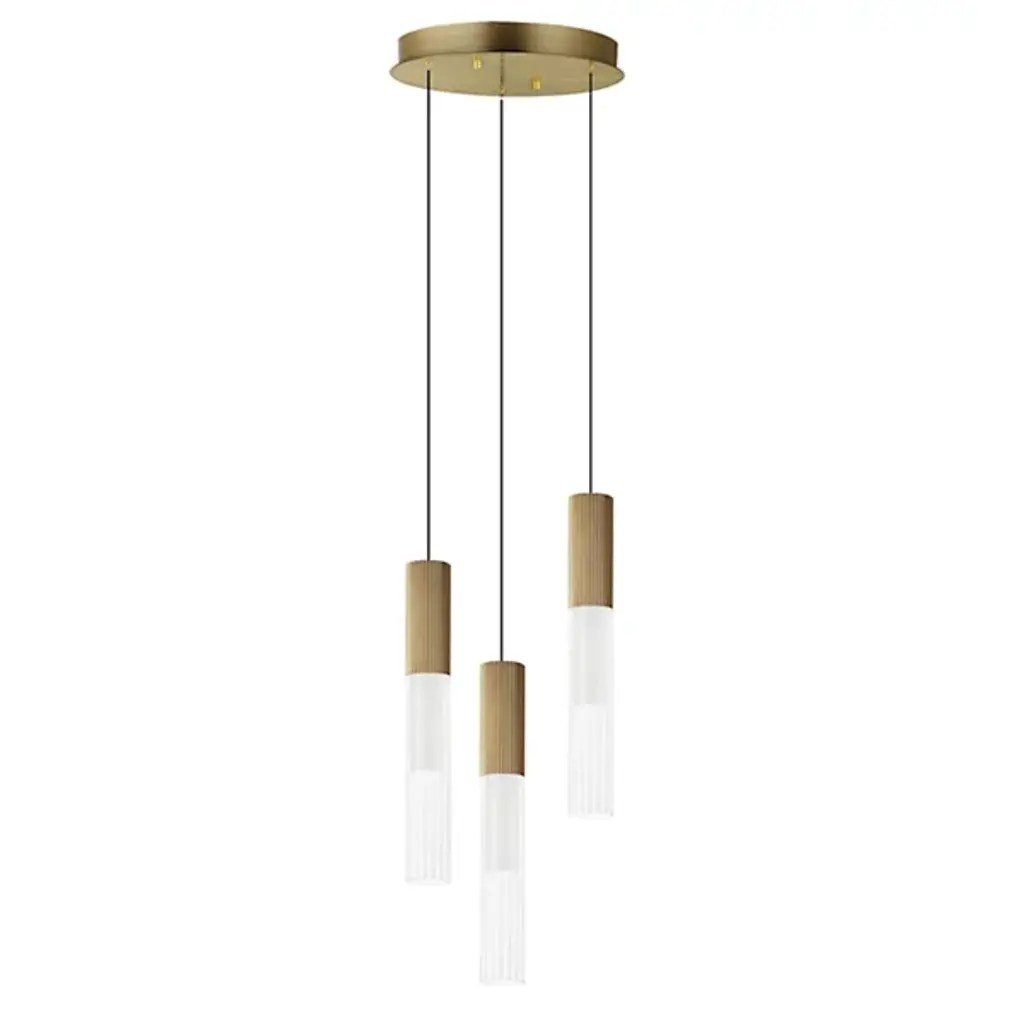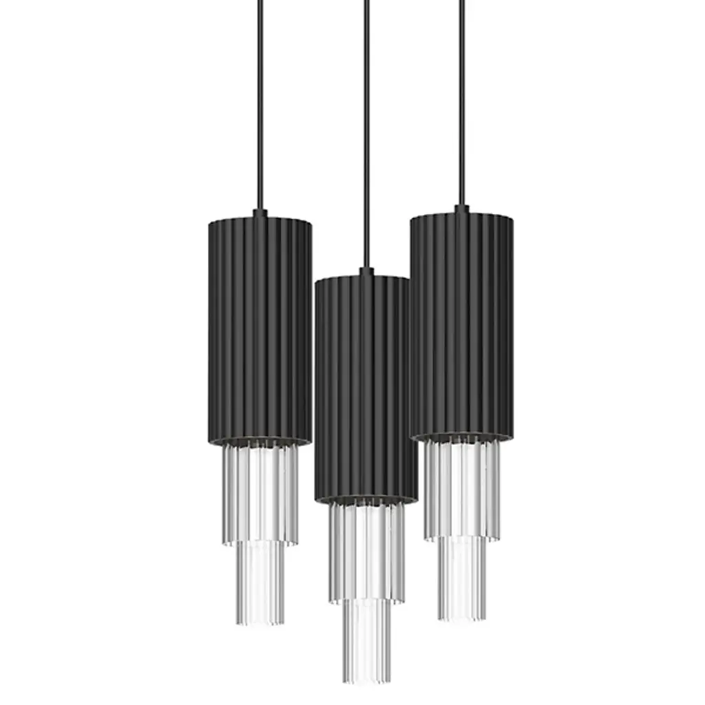 The Armando LED Multi-Light Pendant from Huxe comforts the room with a collection of soft light passages, underscored by its layering of fluted glass cylinders. The pendant pairs distinct geometric shapes with sports bold finishes to complement the modern aesthetic. It draws one closer with a sense of movement created by its multi-point suspension. Cylindrical metal lamp holders add a dressy accent to their striated surfaces. Clear ribbed glass shades continue the linear marks of the lamp holders as they diffuse the light with the opaque shades inside. Each pendant displays a candle-like image that comes together as a soft, atmospheric light.
