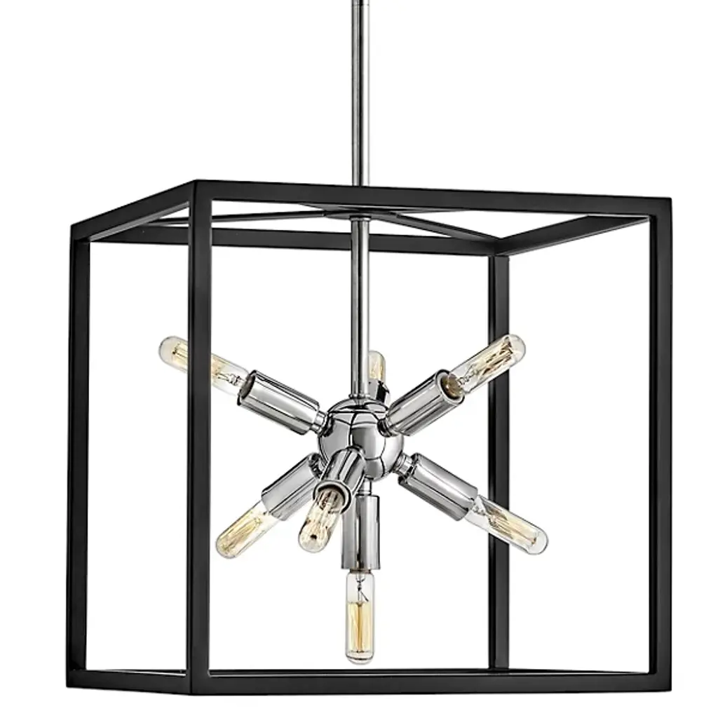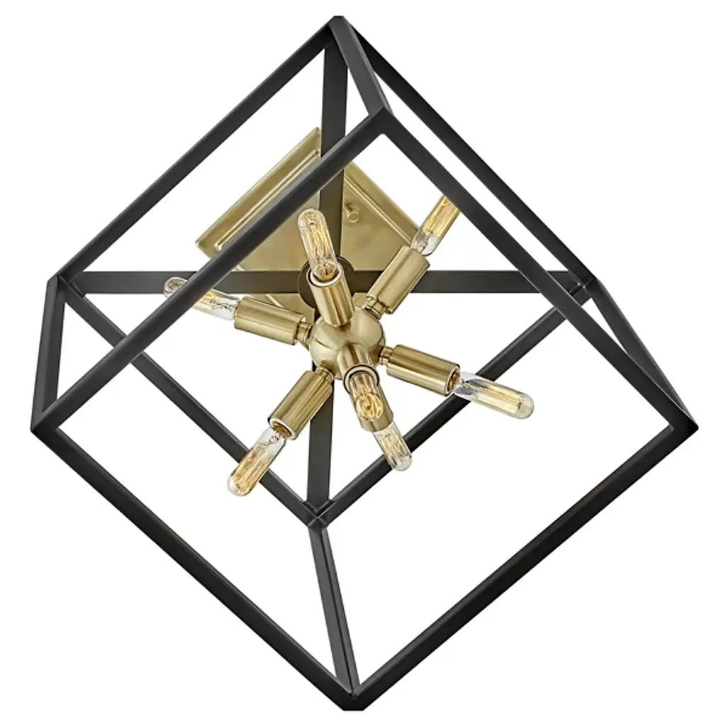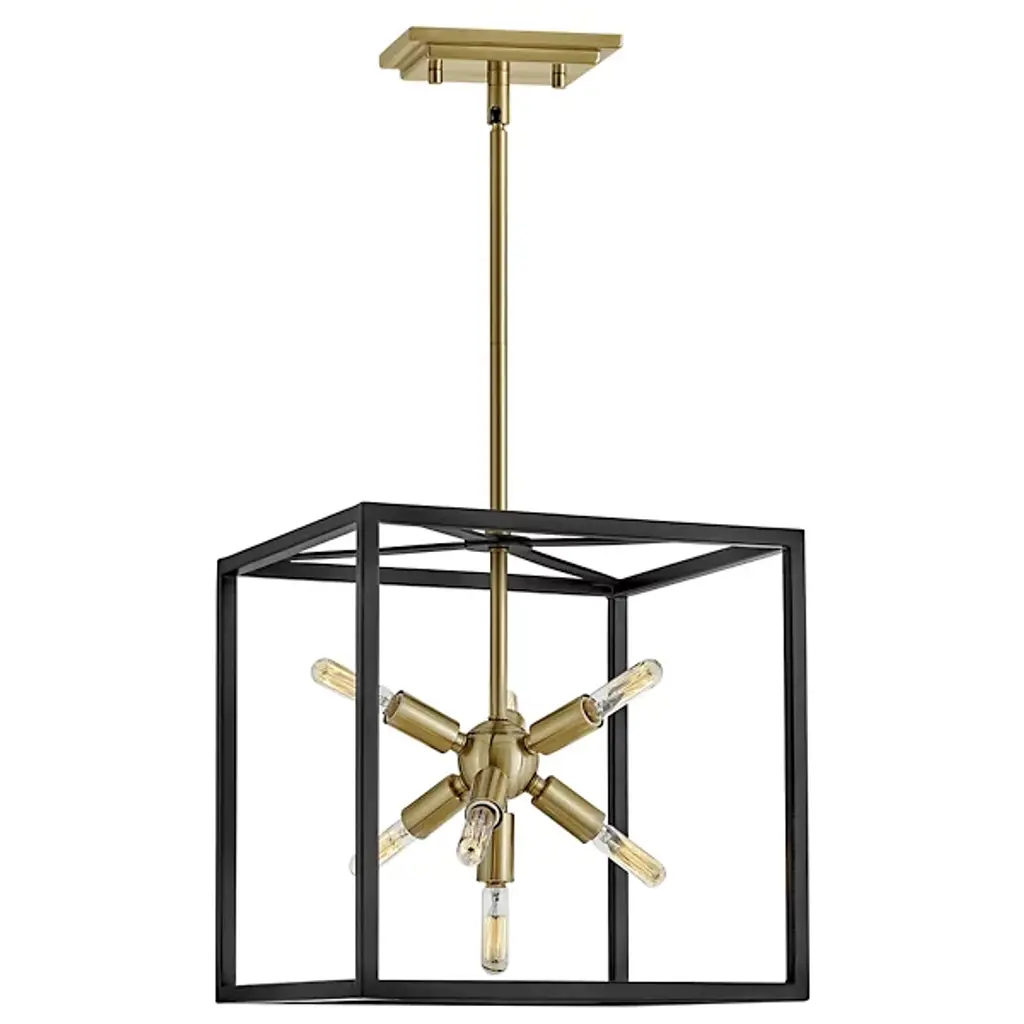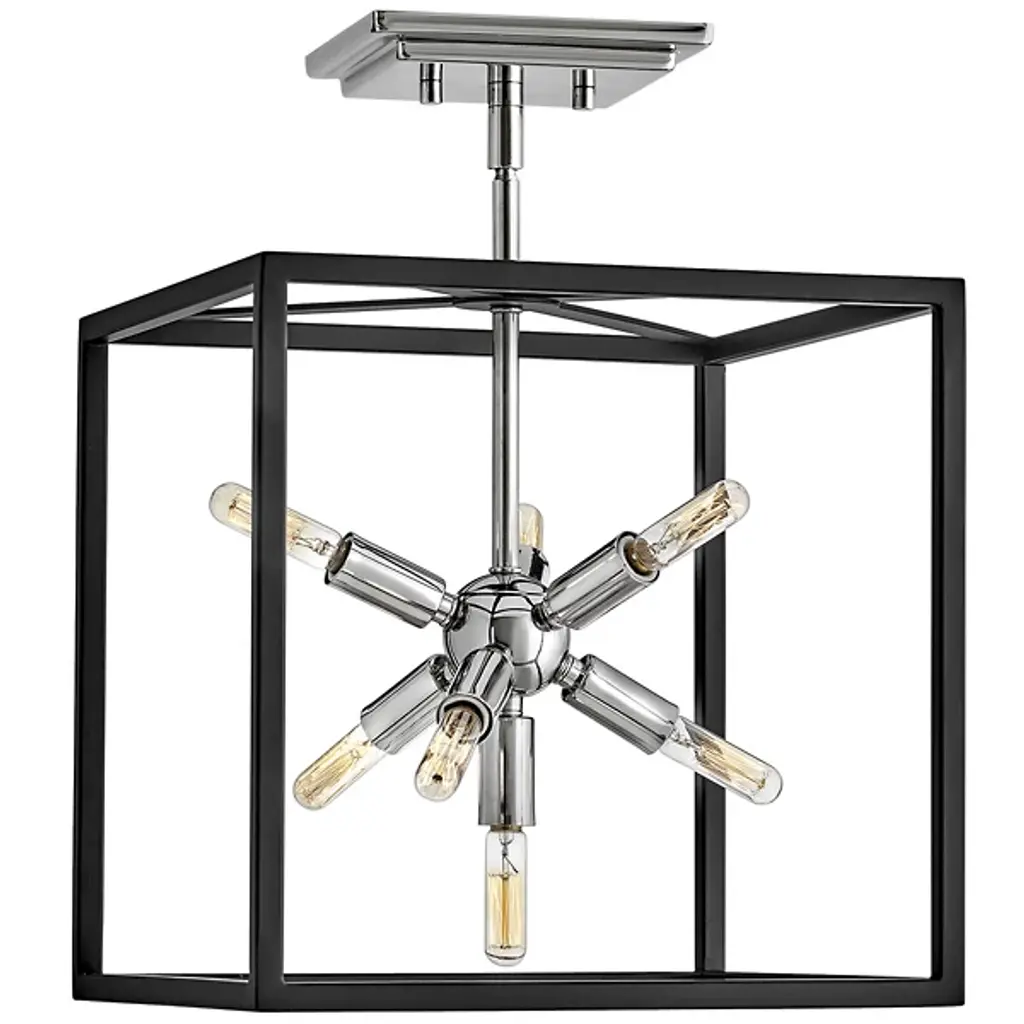 The Aros Semi Flusmount/Pendant from Hinkley Lighting is a sputnik-inspired design, adding to the openness of the room in its clean geometry. The piece puts a contemporary spin on the mid-century modern classic. Its retractable down rod lets it serve close to the ceiling or closer to eye level. Hanging below, a globe and short lamp holders delight in their shimmering finish. The exploding composition of the lamp holders awes from every viewing angle. A boxed structure gives the starburst design a sharp, framing display. Filamented bulbs add a vintage texture and golden hue to the piece. The multi-directional bulbs translate to a filling ambient aura.