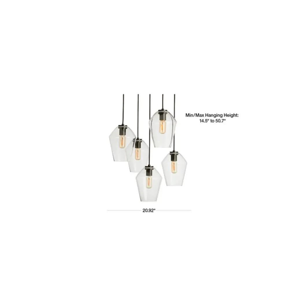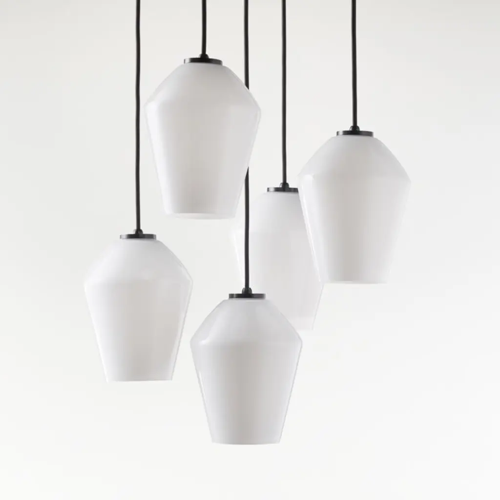 Arren suspends five milky-white glass shades from an iron fixture finished in black, the softly angled pendants hanging from a circular ceiling plate and adjustable black fabric cords. Boasting clean lines and graceful proportions, the Arren Black Round 5-Light Pendant with Milk Angled Shades creates a striking cluster of light above an island or round table. Designed by Amanda Ip of Slate Design exclusively for us, this pendant is part of our Arren collection of flexible lighting options with a custom feel. Our modern-yet-timeless Arren collection combines single- and multi-bulb ceiling lights and sconces in a variety of configurations and finishes with elegant glass shades available in three shapes and three finishes. Install a round five-light pendant over your kitchen table, matching single pendants over the island and sconces above the sink, or scatter coordinating light fixtures throughout your home for a modern mixed-materials look.