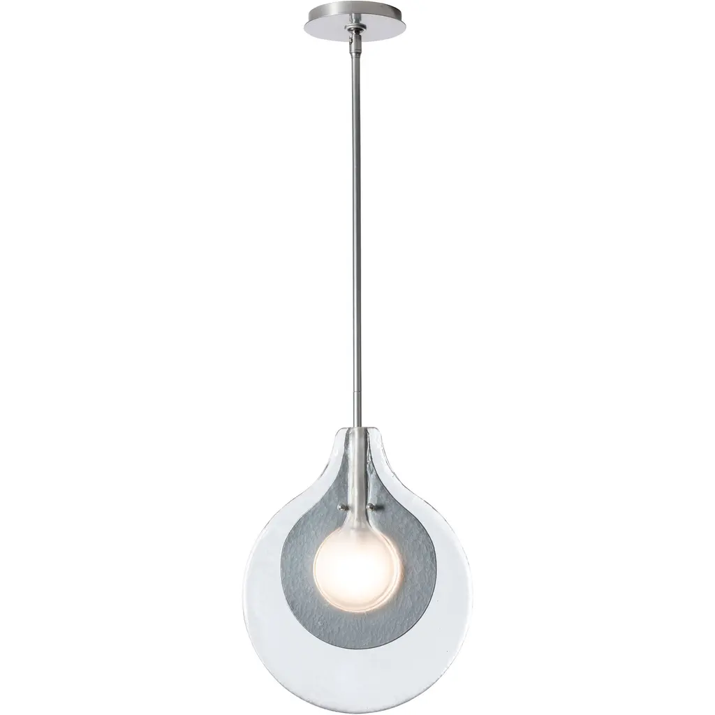 The use of Soiva glass from Venice was central to this design by HF's Jason Hancock. Two layers of handmade clear, textured glass encases a sculptural steel piece surrounding its bulb illumination. The frosted glass around the bulb gives a dimensionality to this single-light pendant. Part of the ART + ALCHEMY by Hubbardton Forge Collection.